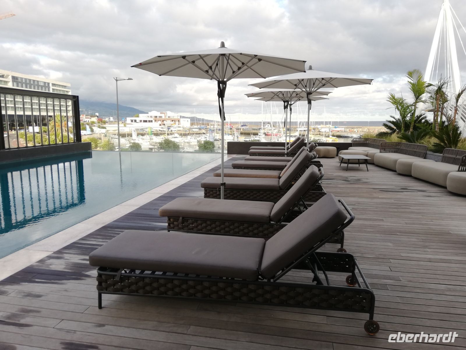 Wir fahren zunächst in unseres Hotel Marina Atlântico unweit von der „Marina“– Hafen der Hauptstadt Ponta Delgada. Da wir noch nicht die Zimmer beziehen können, legen wir unsere Koffer ab und können uns in die lichtdurchflutete Lobby des Hotels gemeinsam hinsetzen.