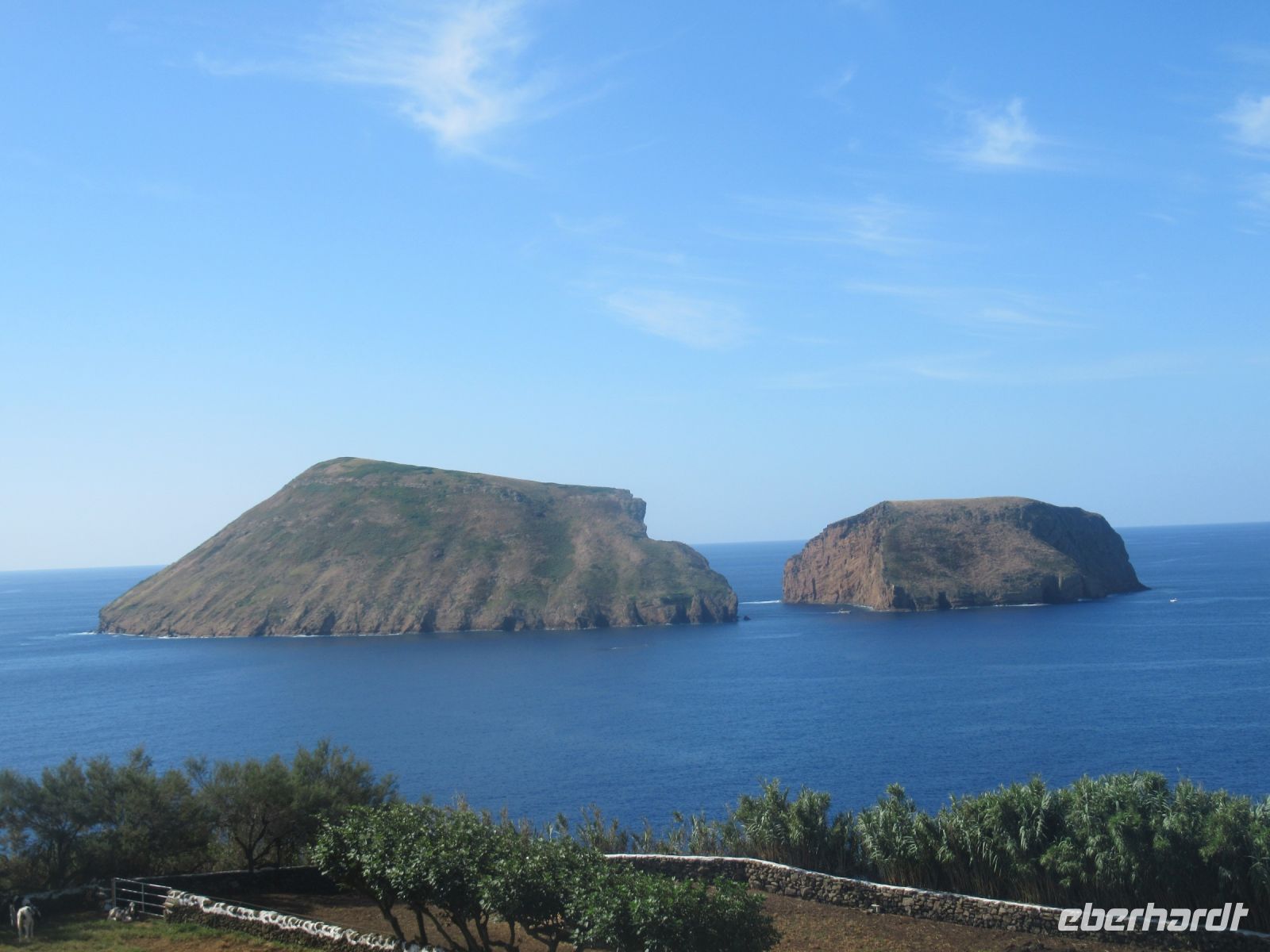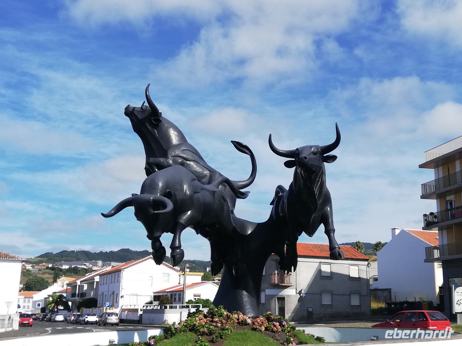 Wir fahren jetzt aus der Stadt, die Südküste Richtung Ostenentlang, um die Insel zu erkunden. Wir halten an dem Kreisel mit den markanten Statuen mit drei Stierenin der Nähe die Stierkampfarena. Unser erster Stopp außerhalb, ist an einem Aussichtspunkt – „Miradouro da Serretinha Feteira“ wo wir die zwei sog. Ziegeninseln sehen. Diese entstanden durch vulkanische Aktivität als eine Insel. Erst in Laufe der Jahrhunderte wurden sie durch weitere Ausbrüche und Erosion geteilt.