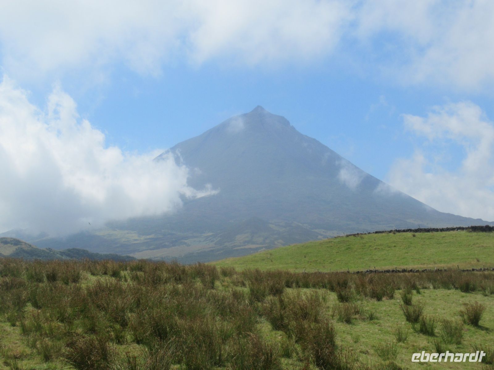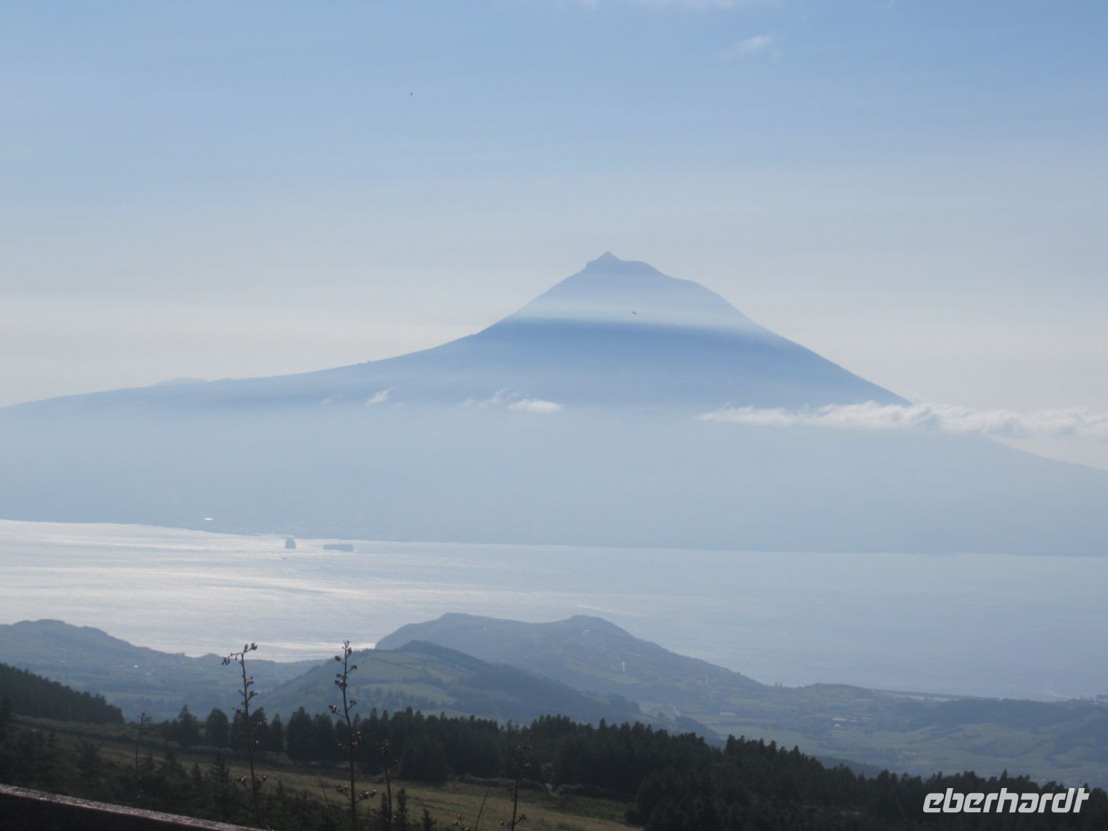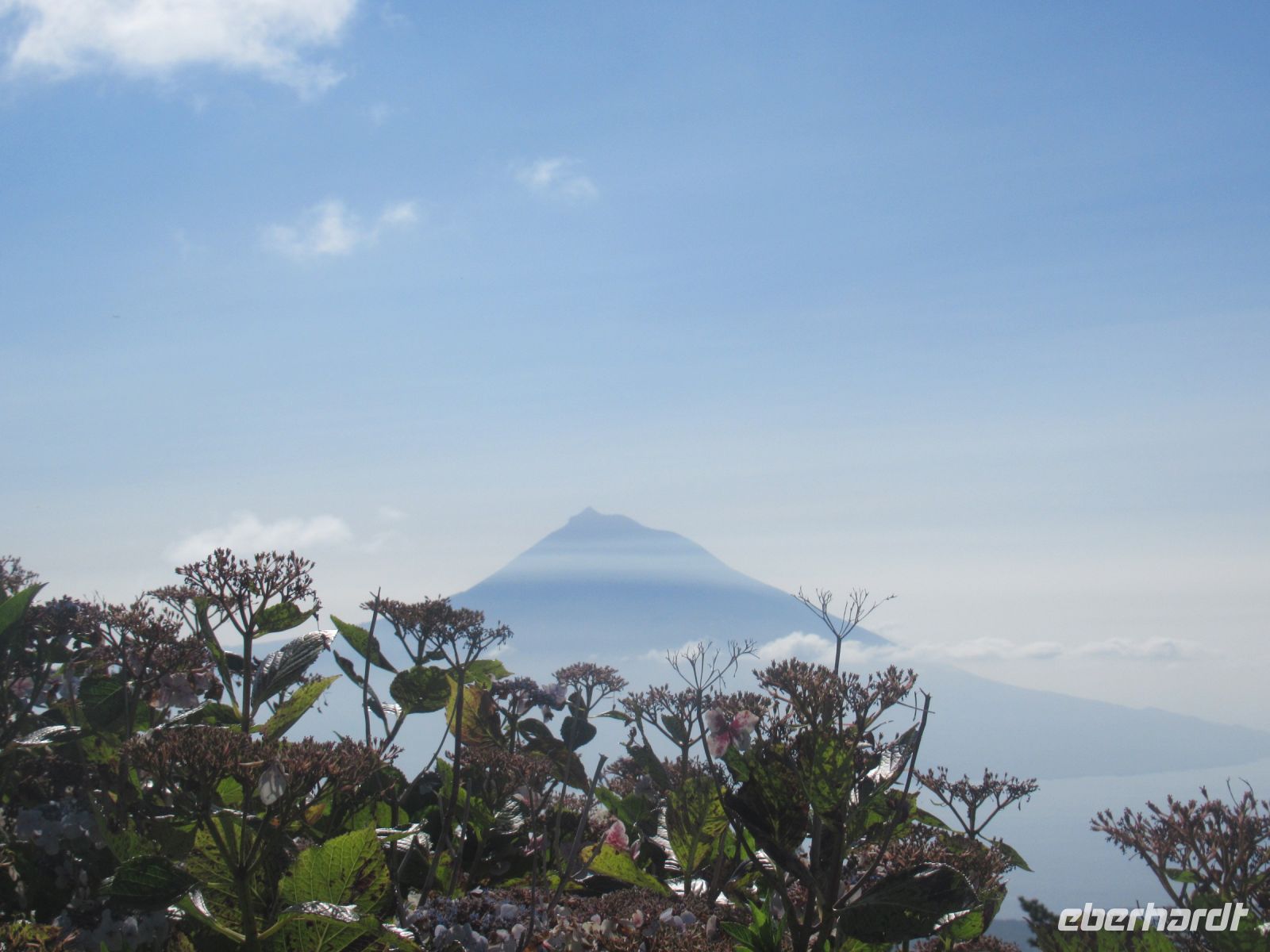 Wir bedanken uns und verabschieden uns von der sehr freundlichen Gastgeberin und fahren Richtung Landesinnere zum See – Lagoa do Capitao, mit der Aussicht auf Pico. Leider war der Pico etwas in Wolken verhüllt, nach unserer Ankunft eröffnet sich, wie von Zauberhand der Vorhang und wir können den Pico sehen. Wir haben so viel Glück!