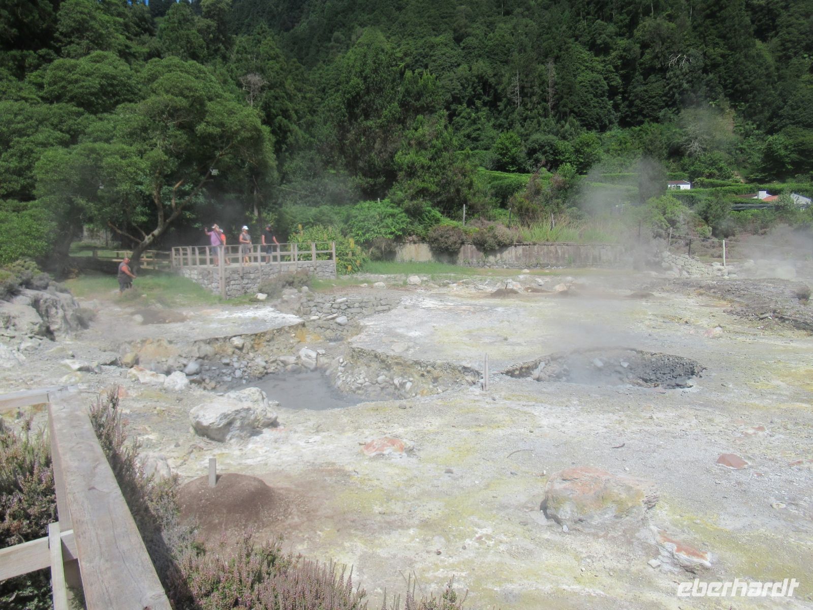 An einer anderen Stelle sehen wir von oben die Calderas – heiße Quellen, die aus der Erde sprudeln. Es sieht wie in einer Waschküche aus. Wir fahren runter und laufen an Holzstegen durch die bizarre Landschaft, der „Caldeiras“ (Dampfkessel) – vulkanische Schlammquellen, aus denen heißer, mineralreicher Schlamm an die Oberfläche tritt und der Dampf und Schwefelgeruch die Luft erfüllt. Hier können wir auch das einzigartige kochen einer traditionellen Speise „Cozido das Furnas“ sehen. Zwei Männer heben gerade den großen Topf aus dem heißen Loch und verfrachten es sehr vorsichtig ins Auto – das wird wohl unser Mittagessen sein.