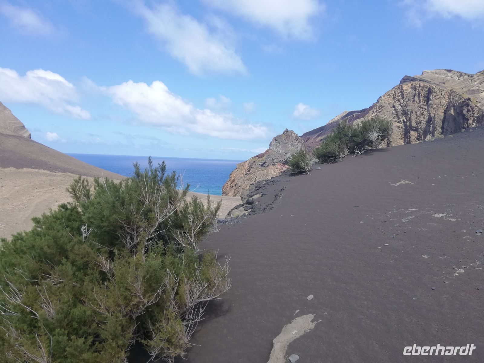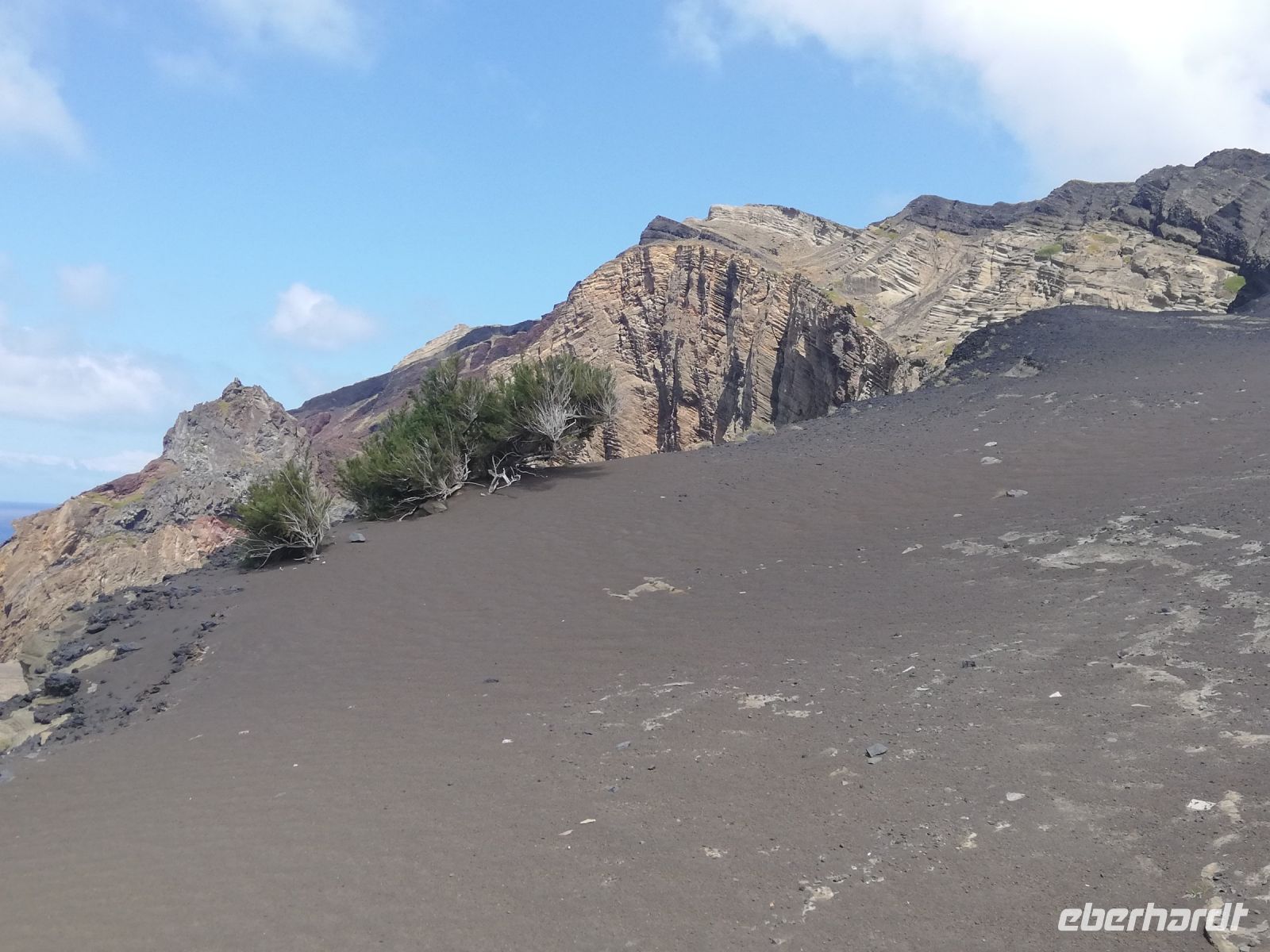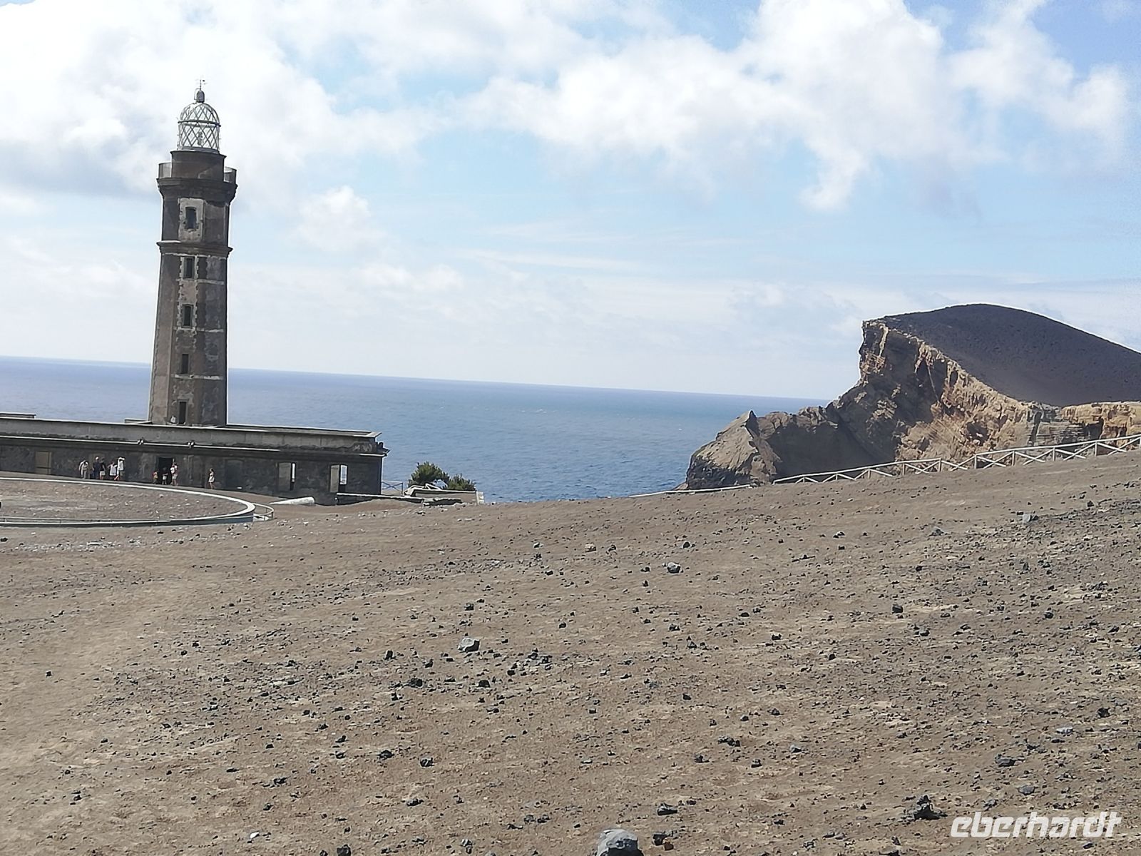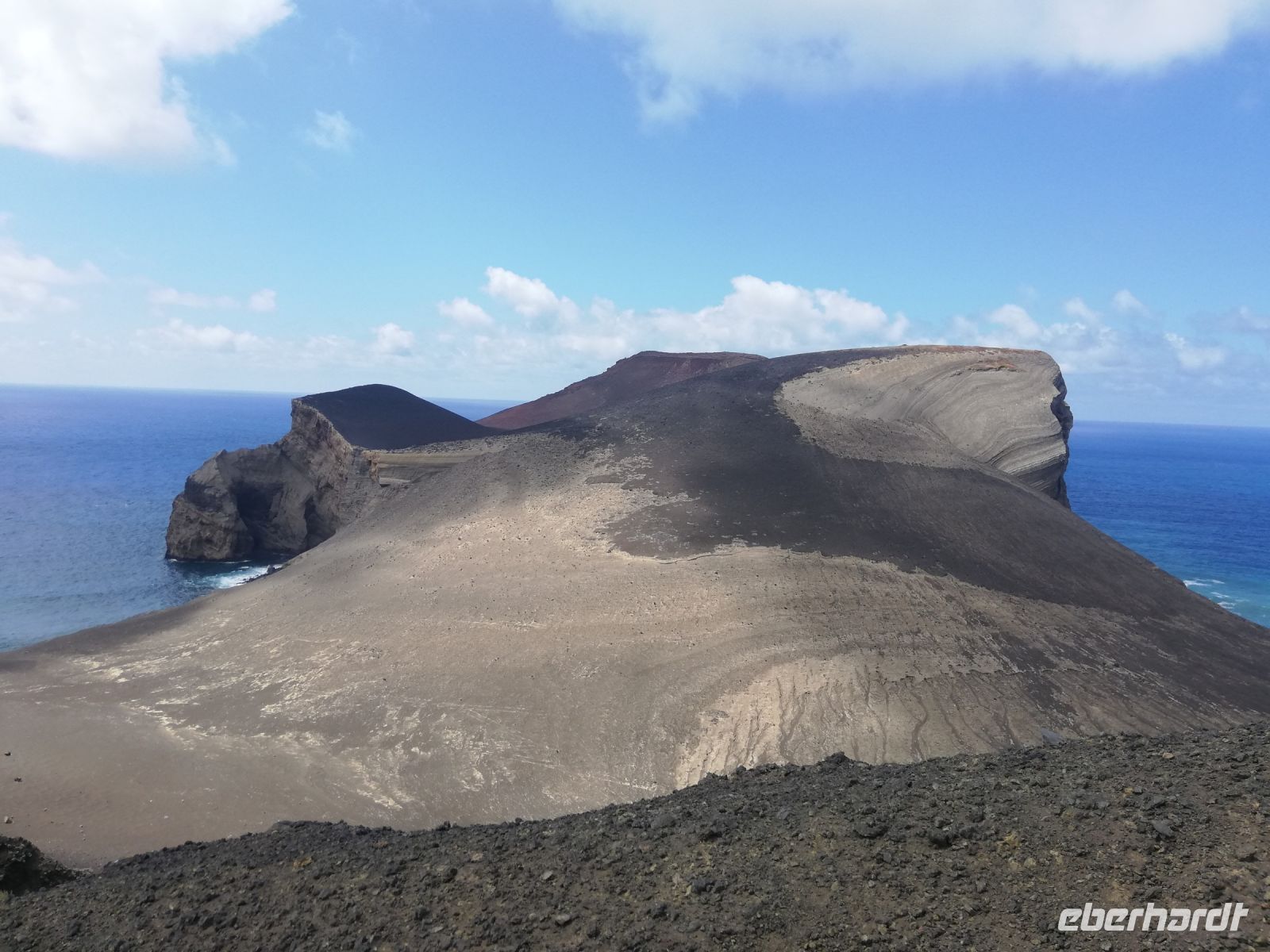 Anja hat uns bereits über das „Neue Land“ auf Faial erzählt, dass nach dem Ausbruch der Vulkans Capelinhos, der im September 1957 begann und hier ganze 13 Monate lang bebte. Dadurch entstand auf Faial etwas 2,4 km² neuer Fläche. Als wir uns schon den Vulkan näherten, dachten wir, wir sind vom einem grünen Paradies auf den Mond gelandet…eine riesige Bergwelle in allen Brauntönen mit Vulkansand bedeckt öffnet sich vor uns. Bizarr und auch etwas befremdlich. Die Sonne prallt auf den dunklen Vulkansand und Staub und wir haben wieder eine ganz klare Sicht. Es ist hier ein Leuchtturm mit der Möglichkeit hochzusteigen, um die Aussicht von oben zu genießen, das Interpretationszentrum über die Vulkantätigkeit anzuschauen, oder teils des Capelinhos zu besteigen. So teilt sich die Gruppe. Erst mit zwei Gästen steige ich hoch, ohne feste Schuhe kaum möglich, da der Vulkansand unter den Füßen rollt. Aber es sah mehr aus, als es wirklich war, in ca. 20 Minuten sind wir oben angekommen und lockten wohl weitere Gäste hoch zu klettern. Die Belohnung – neue Ausblicke auf die andere Seite der Küste – hier schlägt wieder das Herz der Wanderer.