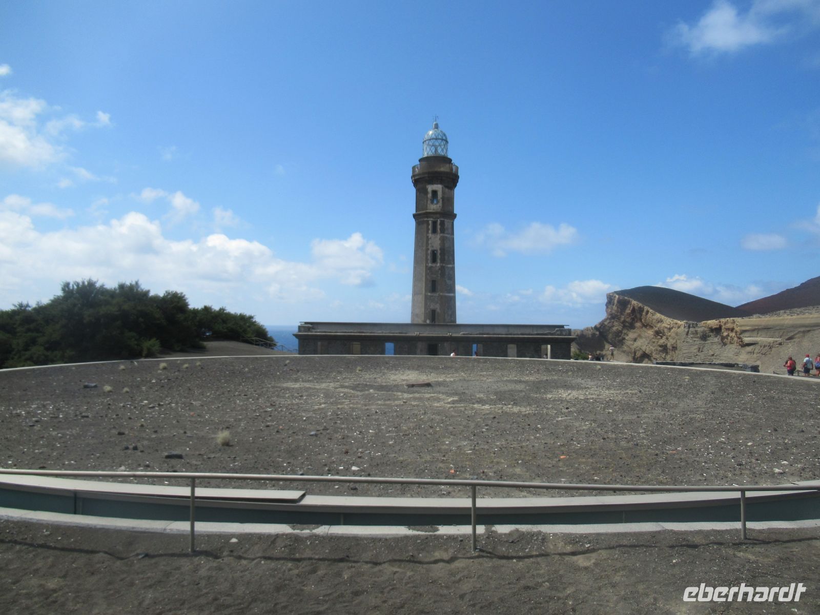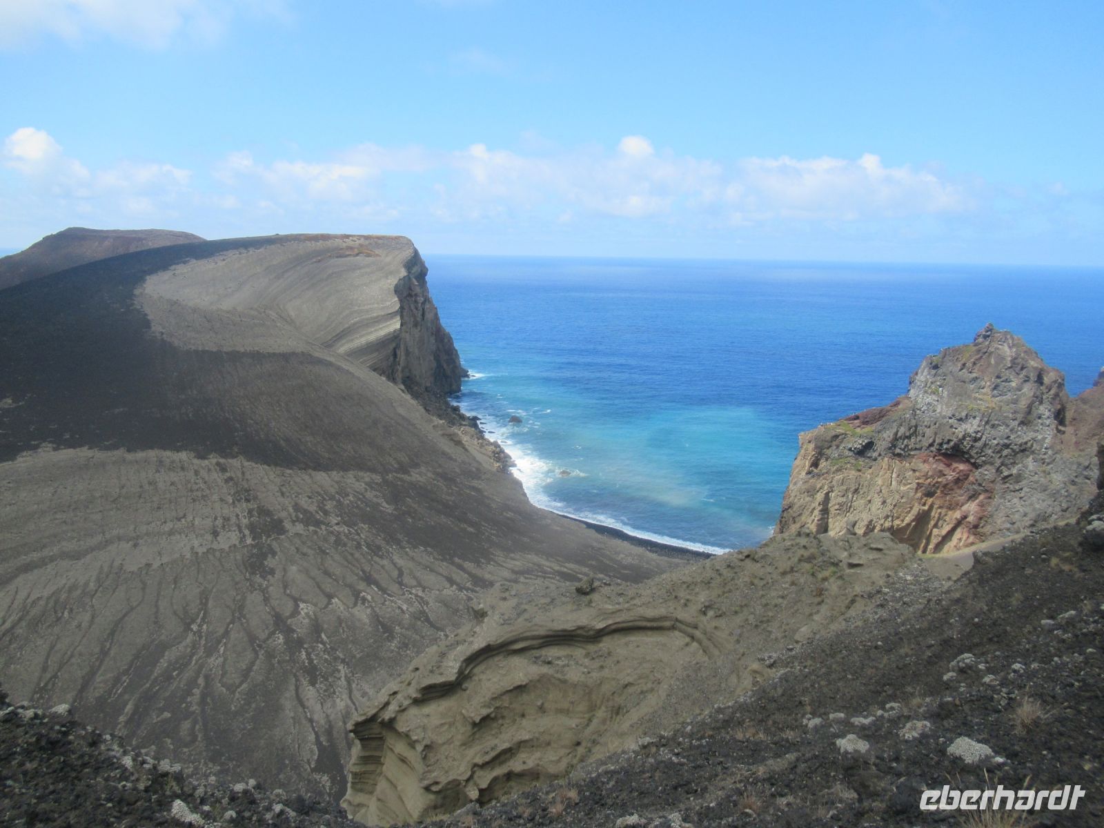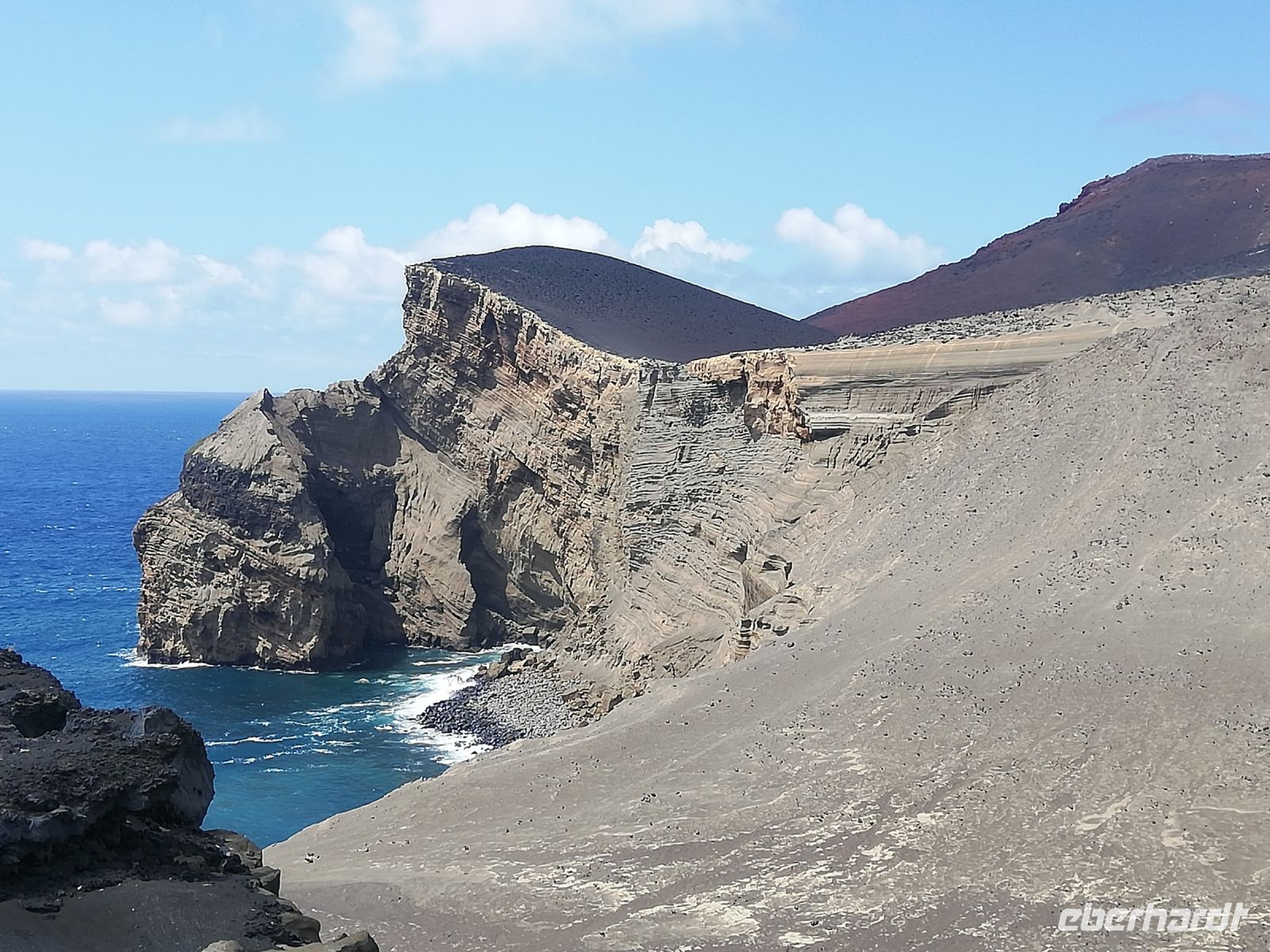 Anja hat uns bereits über das „Neue Land“ auf Faial erzählt, dass nach dem Ausbruch der Vulkans Capelinhos, der im September 1957 begann und hier ganze 13 Monate lang bebte. Dadurch entstand auf Faial etwas 2,4 km² neuer Fläche. Als wir uns schon den Vulkan näherten, dachten wir, wir sind vom einem grünen Paradies auf den Mond gelandet…eine riesige Bergwelle in allen Brauntönen mit Vulkansand bedeckt öffnet sich vor uns. Bizarr und auch etwas befremdlich. Die Sonne prallt auf den dunklen Vulkansand und Staub und wir haben wieder eine ganz klare Sicht. Es ist hier ein Leuchtturm mit der Möglichkeit hochzusteigen, um die Aussicht von oben zu genießen, das Interpretationszentrum über die Vulkantätigkeit anzuschauen, oder teils des Capelinhos zu besteigen. So teilt sich die Gruppe. Erst mit zwei Gästen steige ich hoch, ohne feste Schuhe kaum möglich, da der Vulkansand unter den Füßen rollt. Aber es sah mehr aus, als es wirklich war, in ca. 20 Minuten sind wir oben angekommen und lockten wohl weitere Gäste hoch zu klettern. Die Belohnung – neue Ausblicke auf die andere Seite der Küste – hier schlägt wieder das Herz der Wanderer.