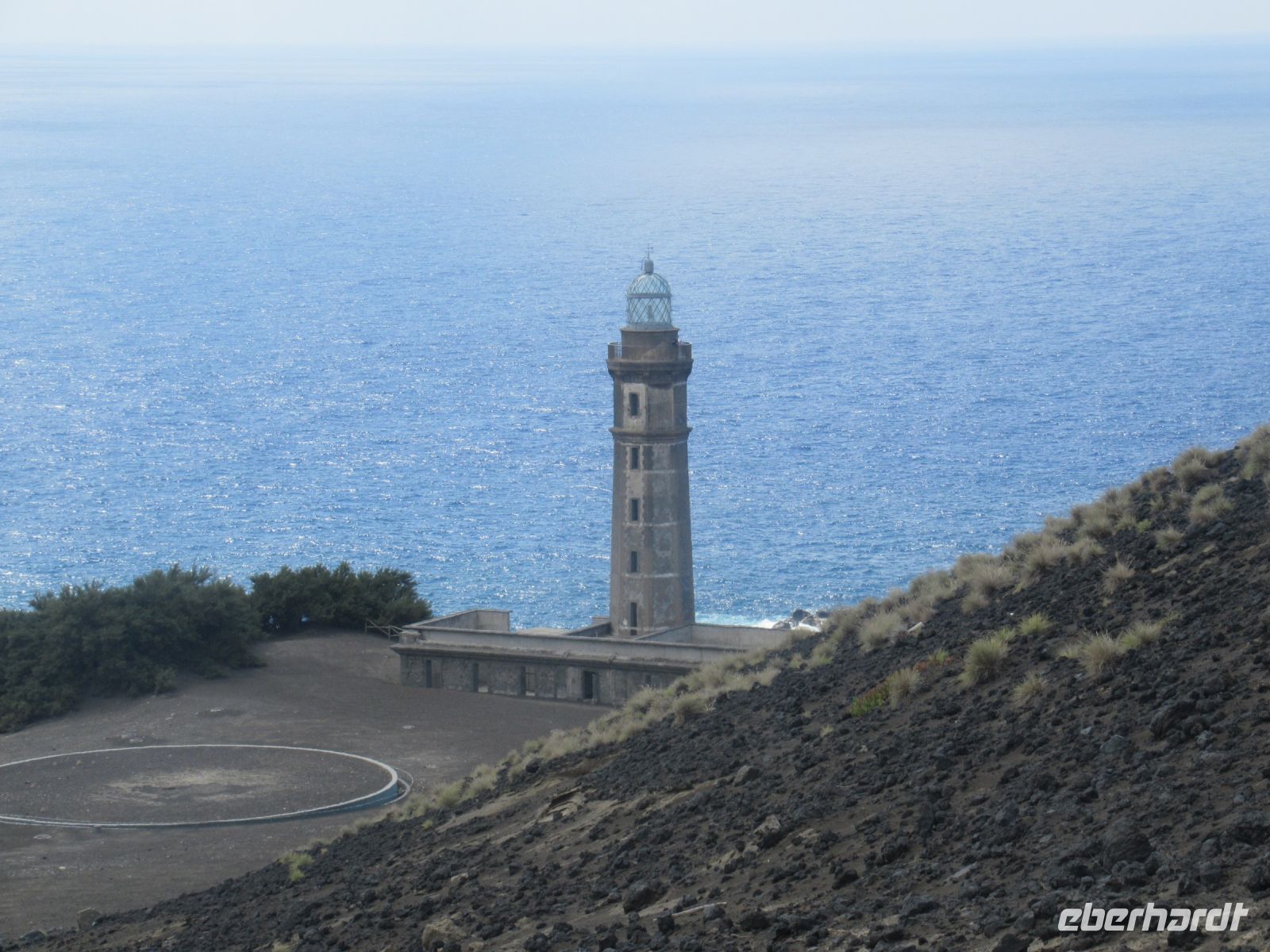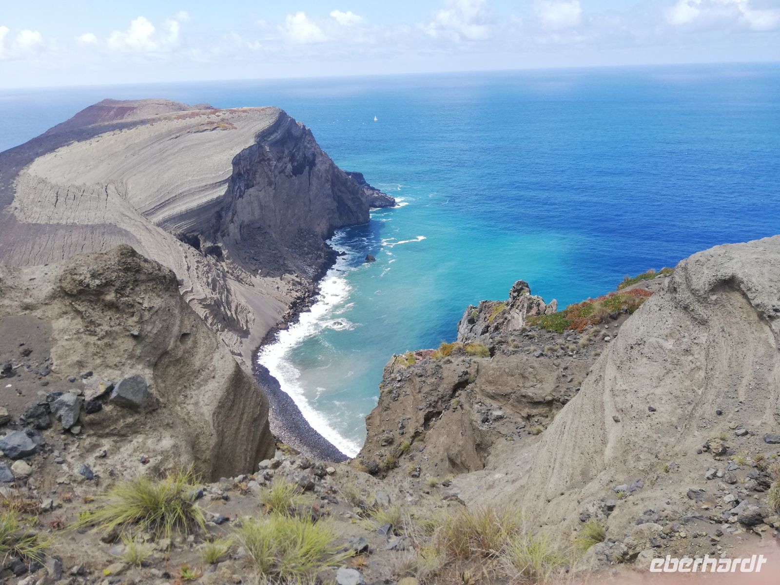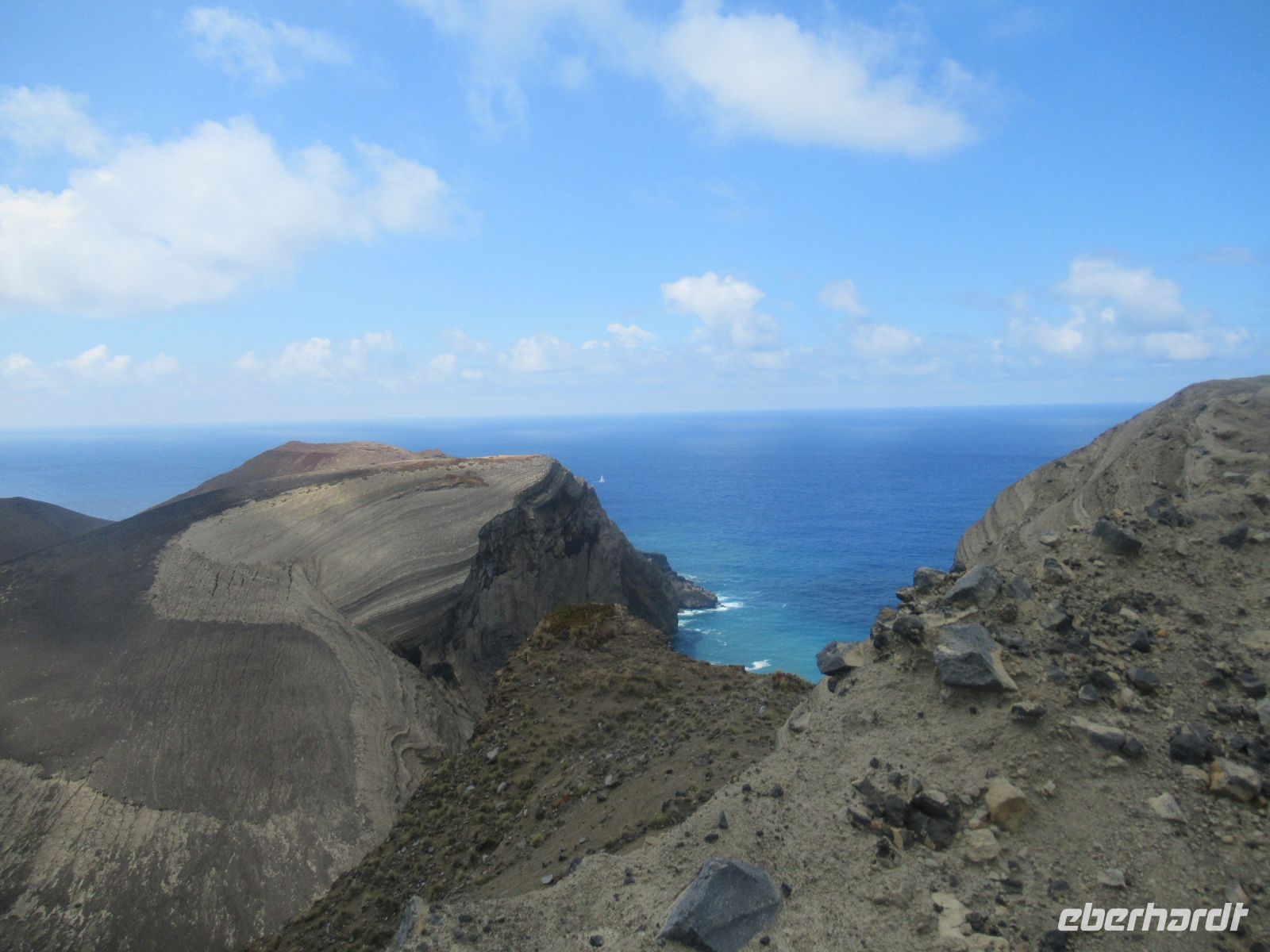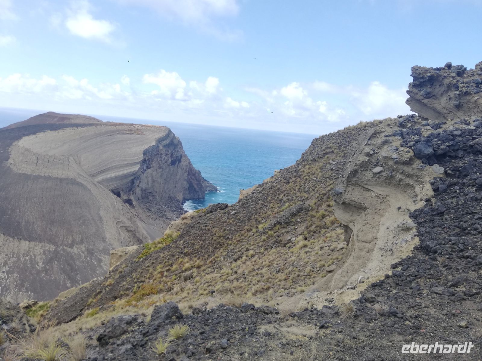 Anja hat uns bereits über das „Neue Land“ auf Faial erzählt, dass nach dem Ausbruch der Vulkans Capelinhos, der im September 1957 begann und hier ganze 13 Monate lang bebte. Dadurch entstand auf Faial etwas 2,4 km² neuer Fläche. Als wir uns schon den Vulkan näherten, dachten wir, wir sind vom einem grünen Paradies auf den Mond gelandet…eine riesige Bergwelle in allen Brauntönen mit Vulkansand bedeckt öffnet sich vor uns. Bizarr und auch etwas befremdlich. Die Sonne prallt auf den dunklen Vulkansand und Staub und wir haben wieder eine ganz klare Sicht. Es ist hier ein Leuchtturm mit der Möglichkeit hochzusteigen, um die Aussicht von oben zu genießen, das Interpretationszentrum über die Vulkantätigkeit anzuschauen, oder teils des Capelinhos zu besteigen. So teilt sich die Gruppe. Erst mit zwei Gästen steige ich hoch, ohne feste Schuhe kaum möglich, da der Vulkansand unter den Füßen rollt. Aber es sah mehr aus, als es wirklich war, in ca. 20 Minuten sind wir oben angekommen und lockten wohl weitere Gäste hoch zu klettern. Die Belohnung – neue Ausblicke auf die andere Seite der Küste – hier schlägt wieder das Herz der Wanderer.