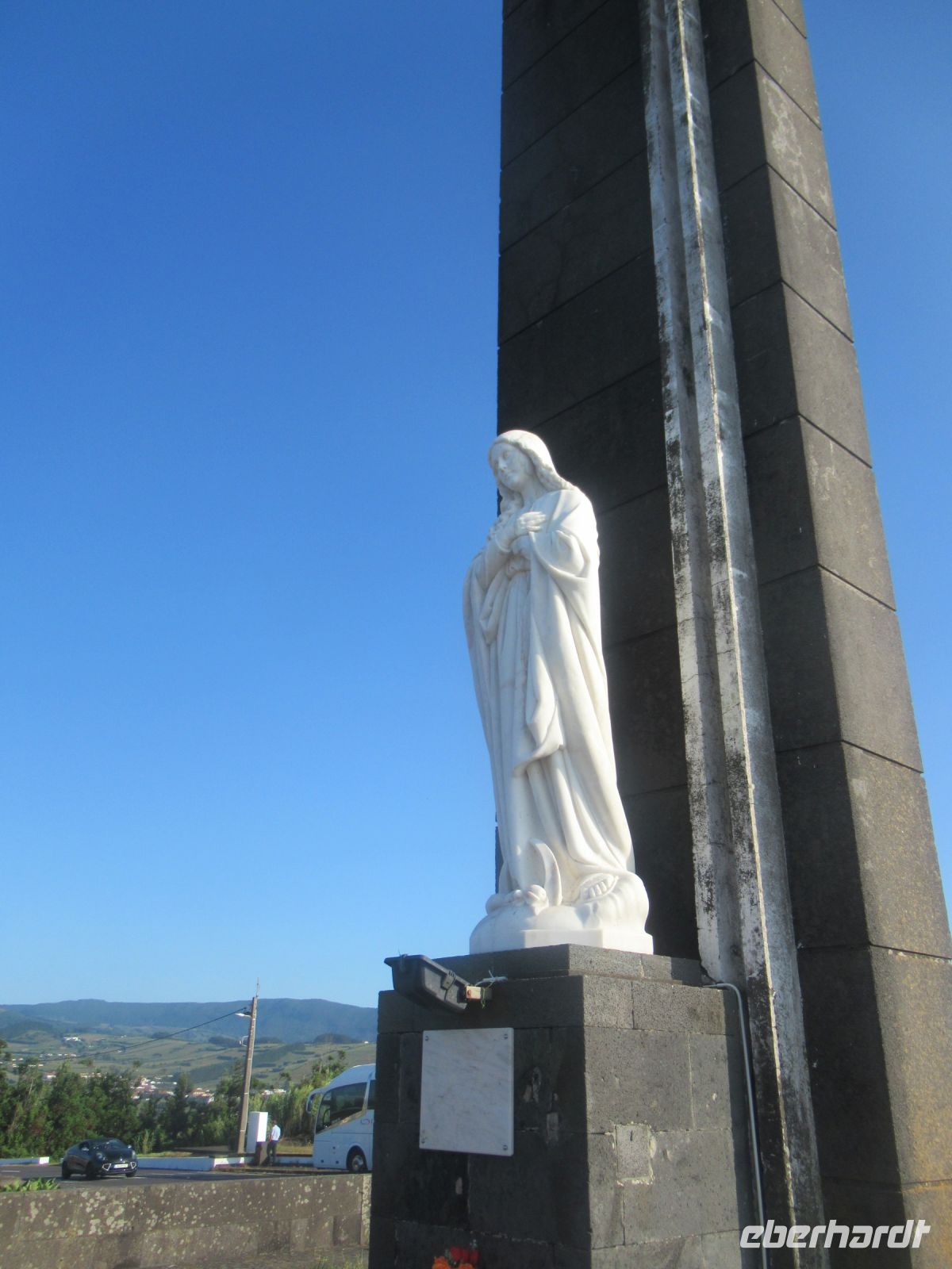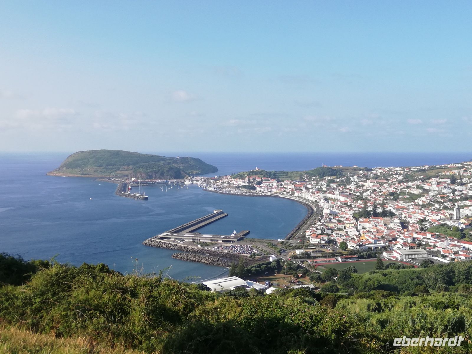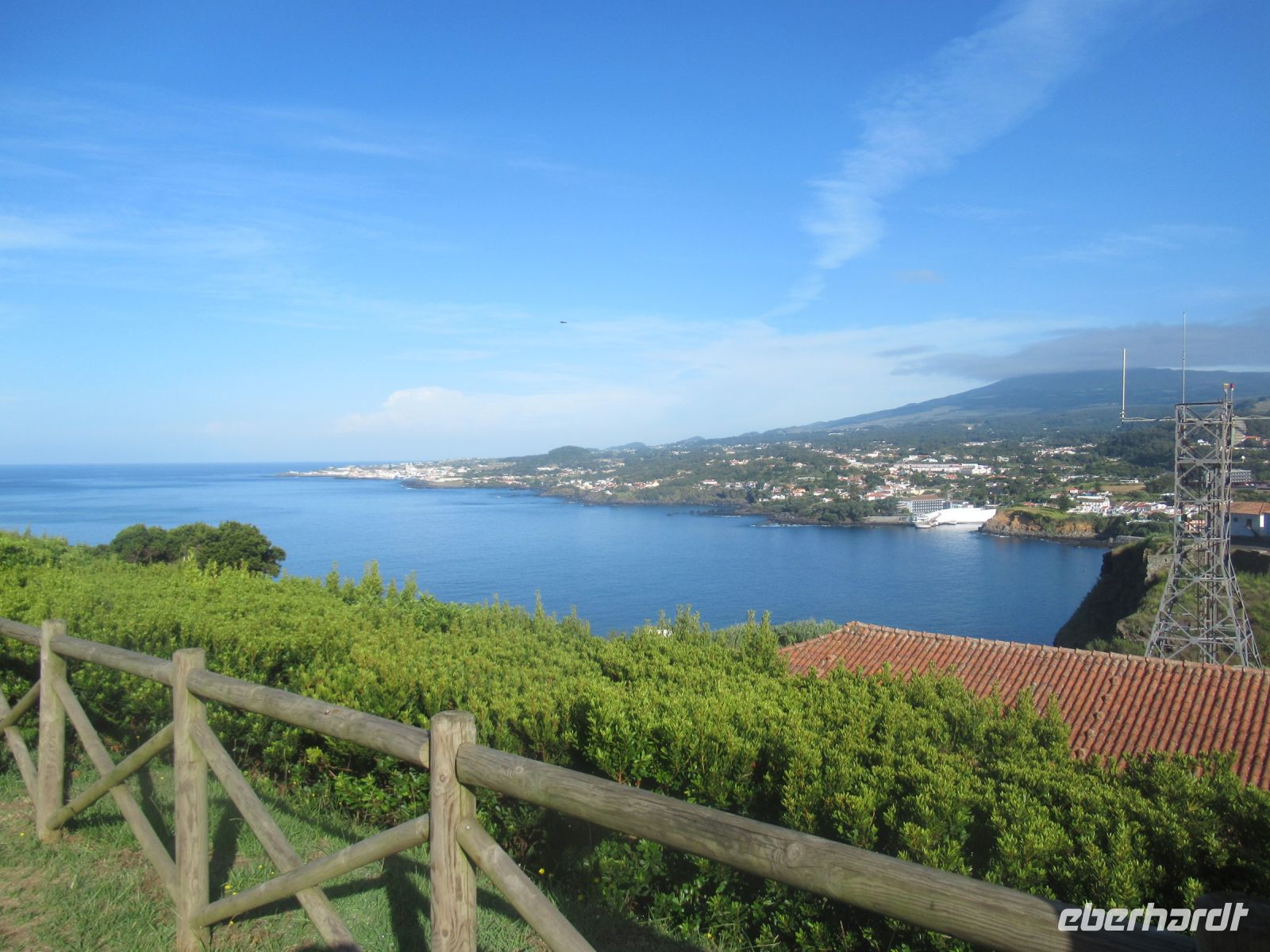 Dann geht hinauf zum Aussichtspunkt – „Miradouro de Nossa Senhora da Conceição“. Die Maria Statue finden wir an den Inseln immer wieder, man sieht welche Rolle die Religion hier spielt. Vor hier eröffnet sich ein wunderschöner Panoramablick auf die Stadt Horta, die Bucht und die gegenüberlegende Halbinsel Monte da Guia. Klare Sicht und Sonne pur ermöglicht uns die Bilder in den schönsten Farben zu verewigen.