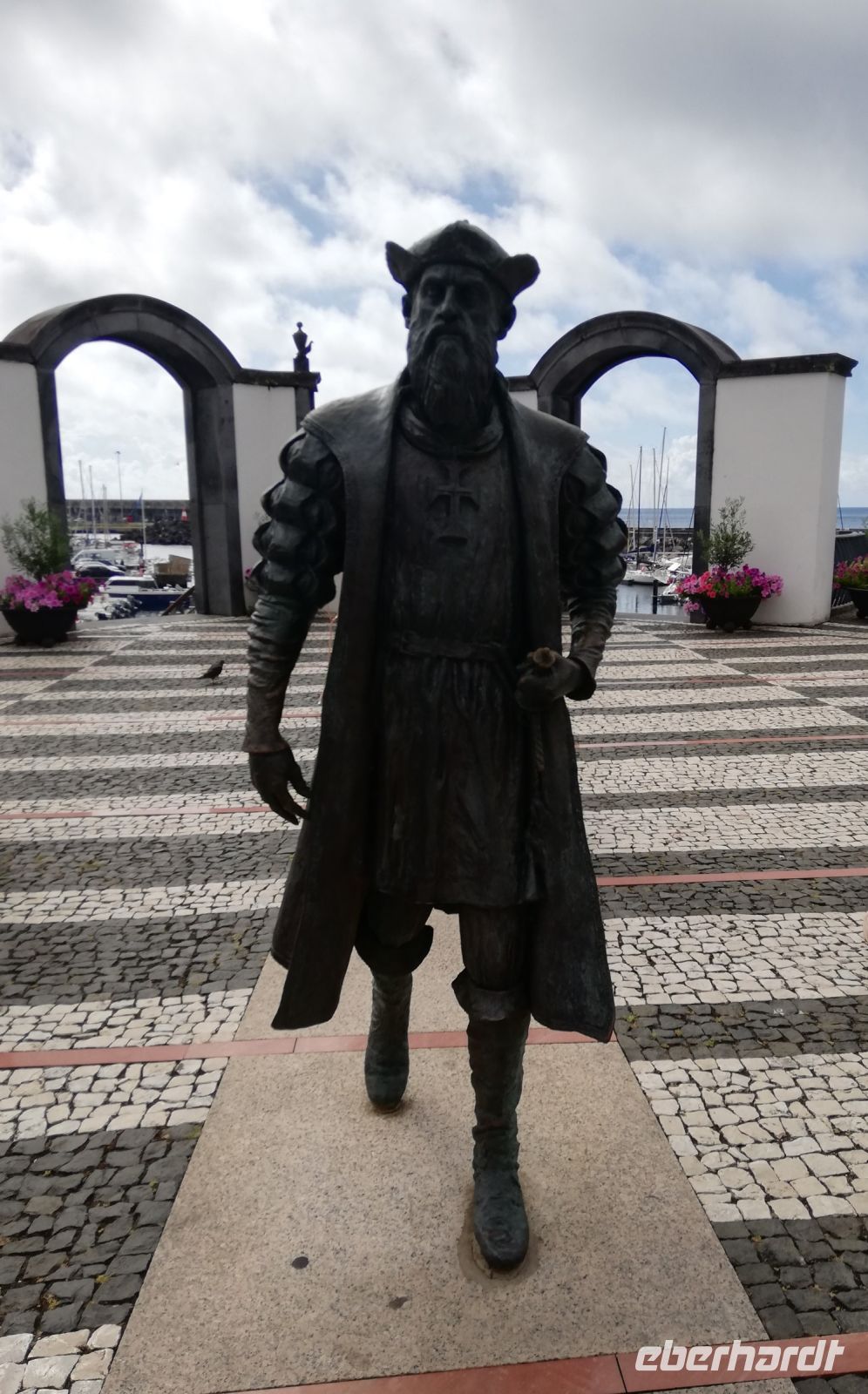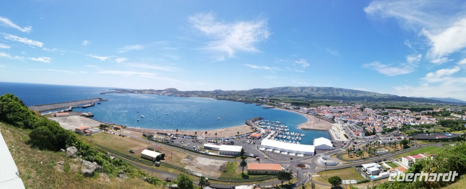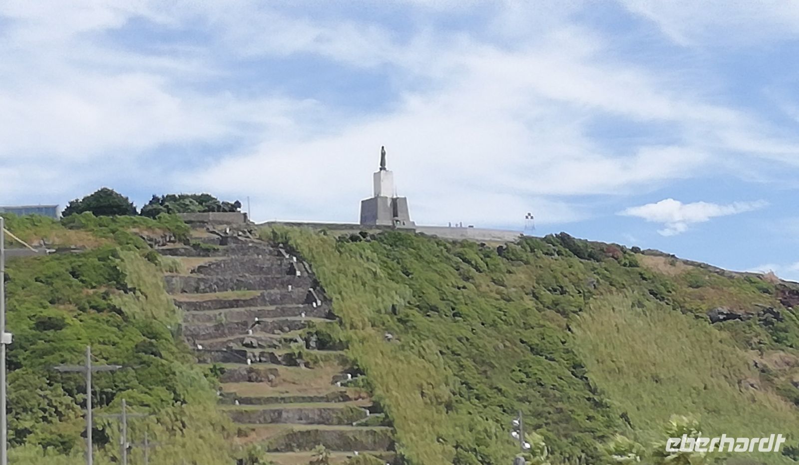 Dann geht hinauf zum Aussichtspunkt – „Miradouro de Nossa Senhora da Conceição“. Die Maria Statue finden wir an den Inseln immer wieder, man sieht welche Rolle die Religion hier spielt. Vor hier eröffnet sich ein wunderschöner Panoramablick auf die Stadt Horta, die Bucht und die gegenüberlegende Halbinsel Monte da Guia. Klare Sicht und Sonne pur ermöglicht uns die Bilder in den schönsten Farben zu verewigen.