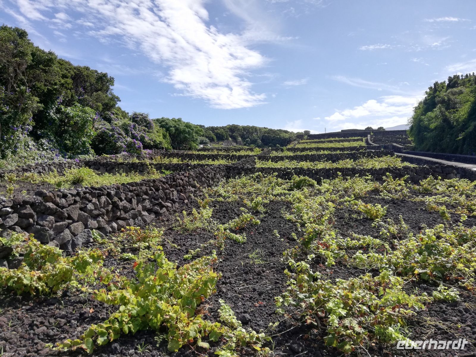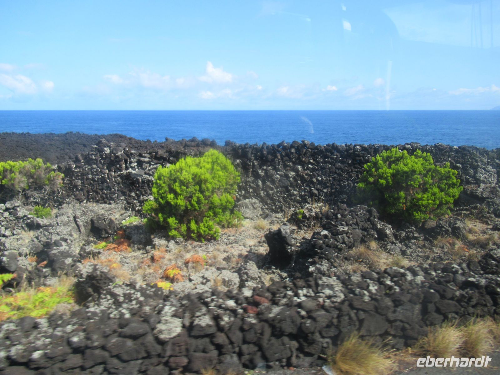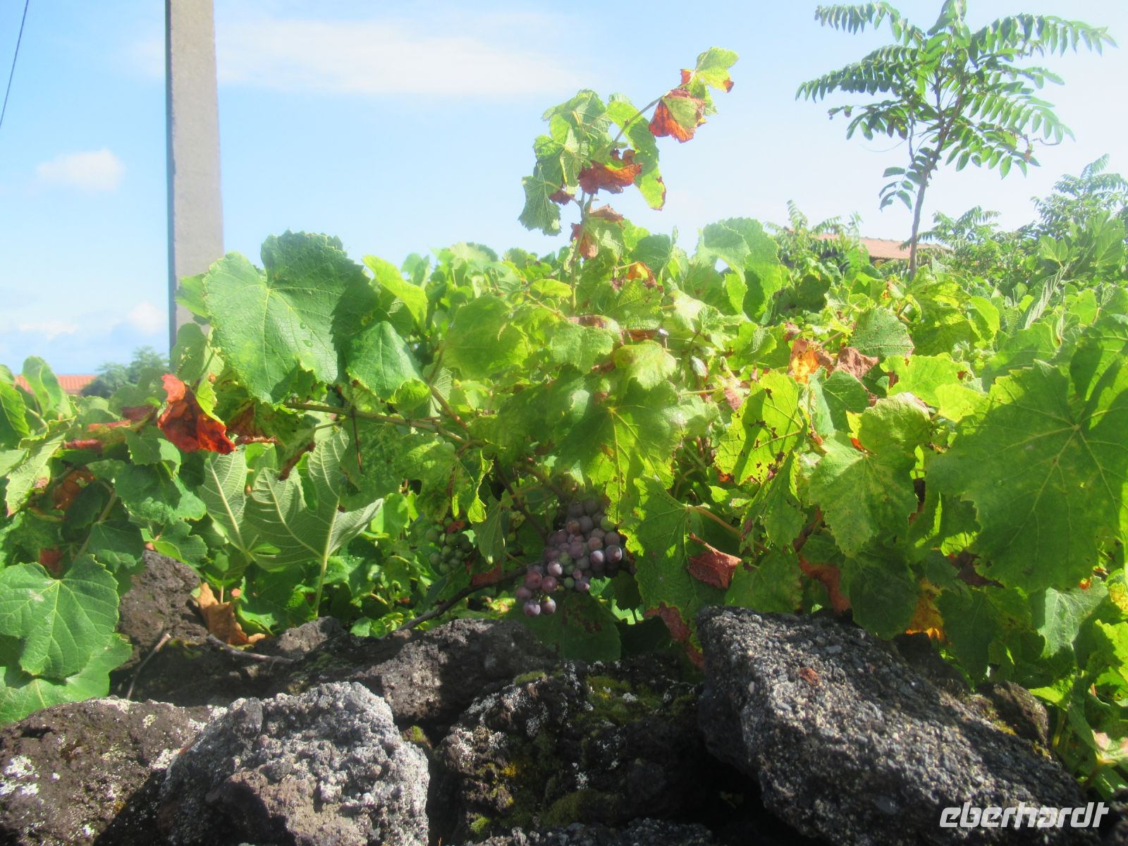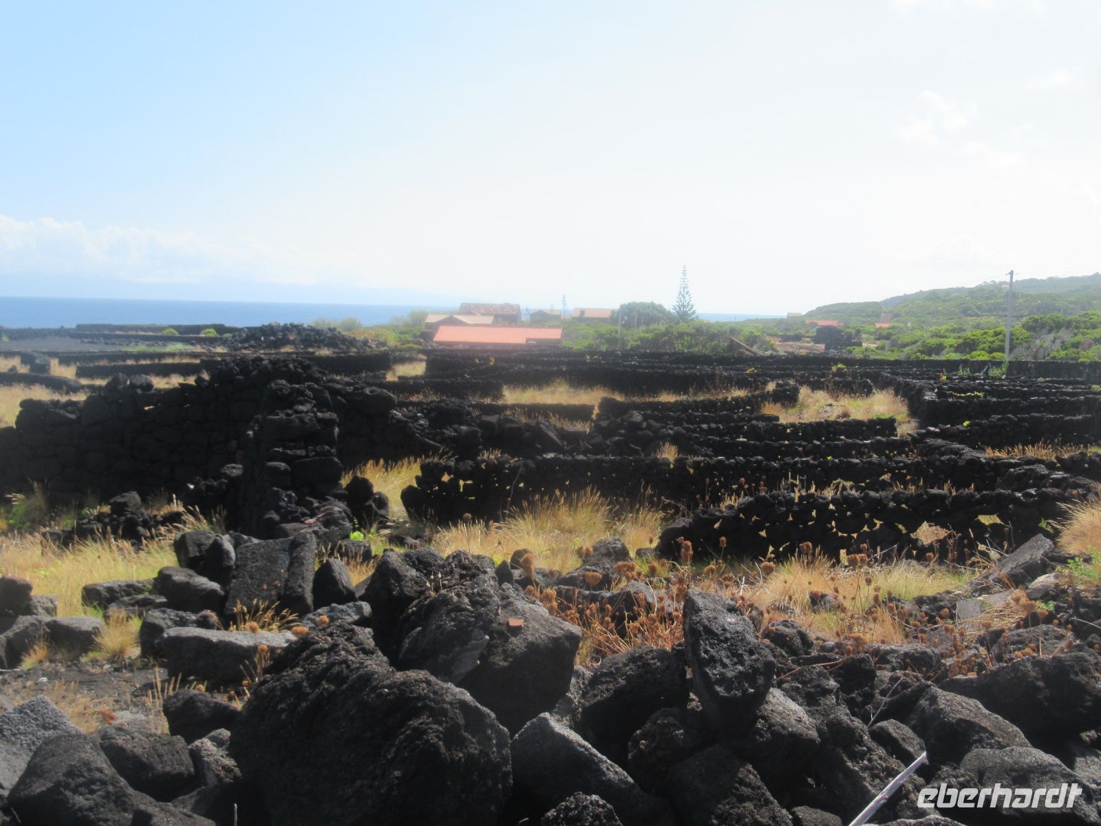 Kleine schwarze Steinmäuerchen, in Quadraten angelegt, wie kleine Gärtchen-„currais“,, an den sich die Weinreben ranken. Sie schützen die Rebenpflanzen vor den rauen Winden und dem Meeresklima. Es ist schon verwunderlich, dass man kaum Erde sieht – einfach nur Stein – und die Reben gedeihen und trotzen den rauen Bedingungen.