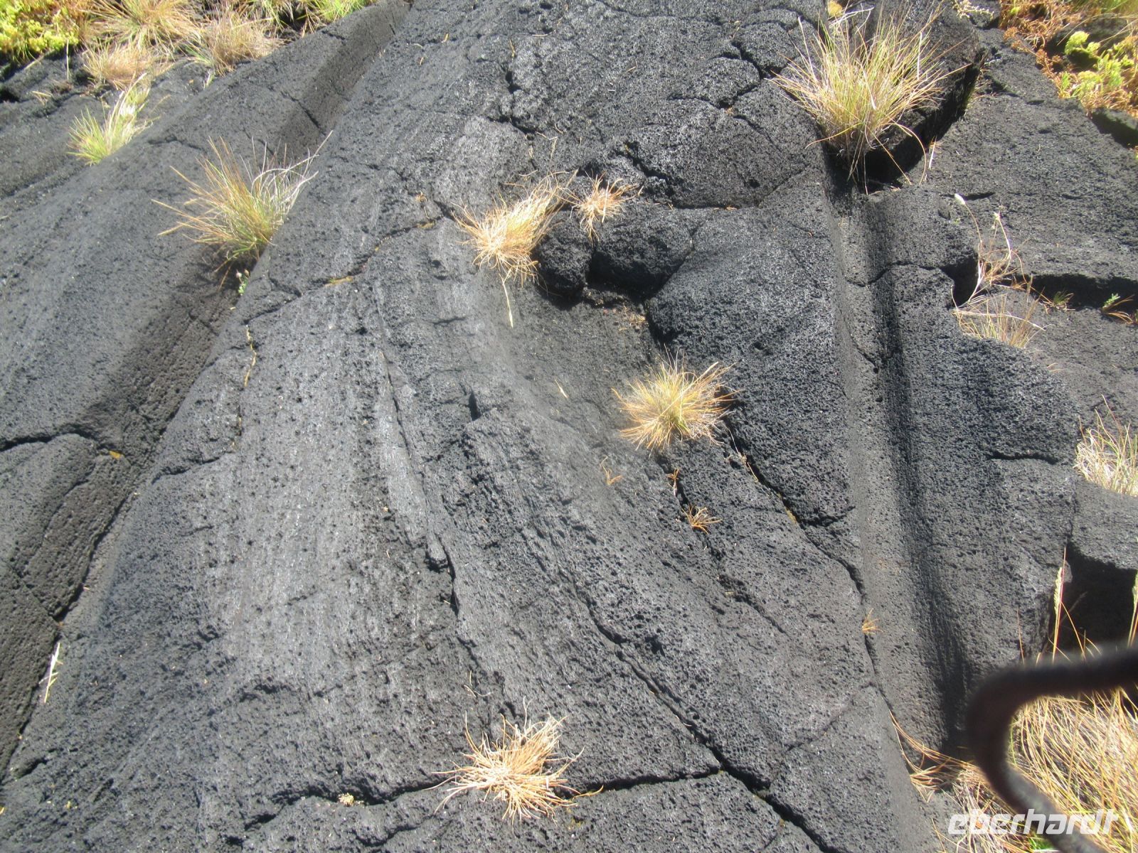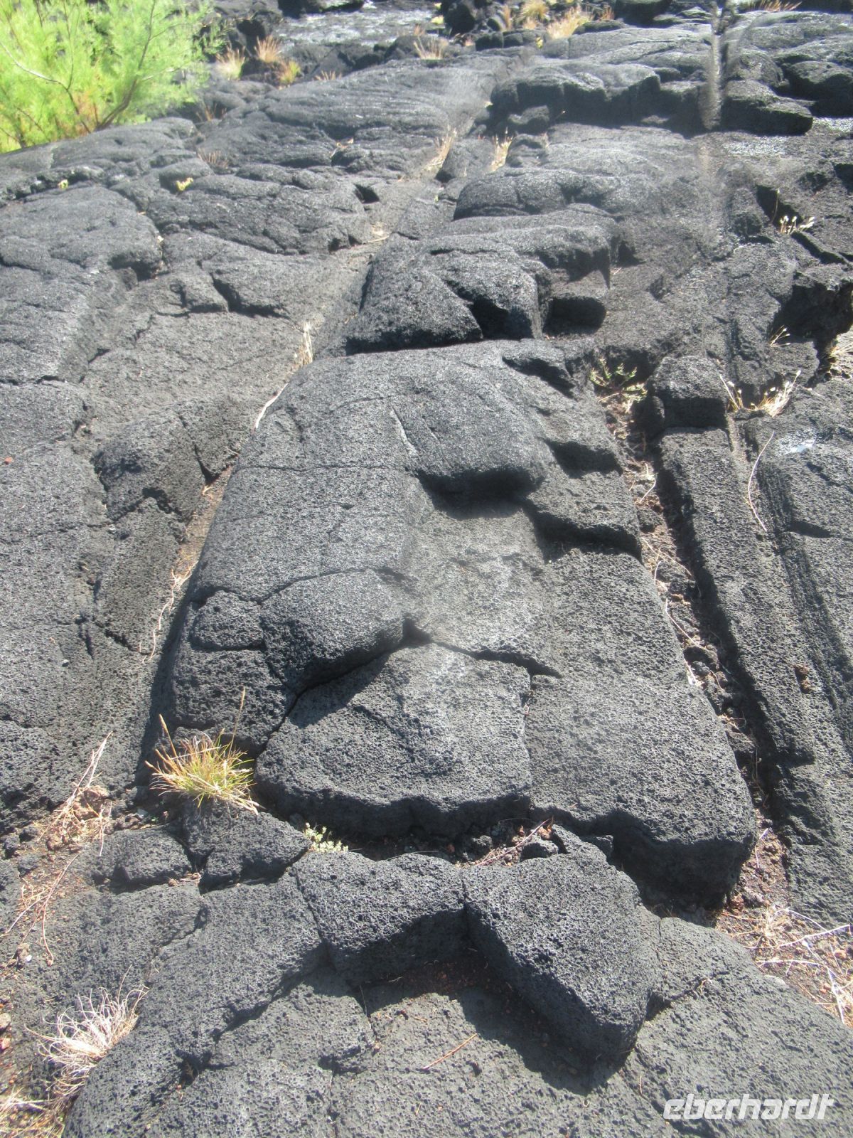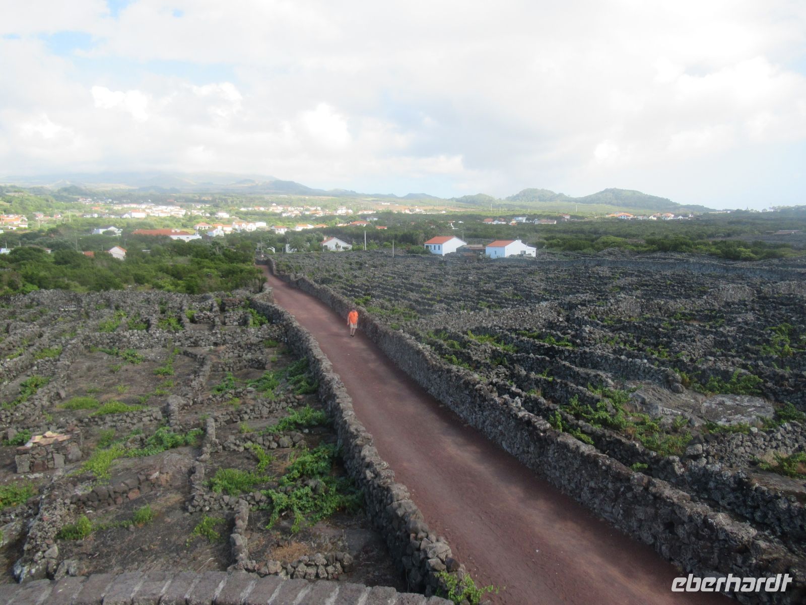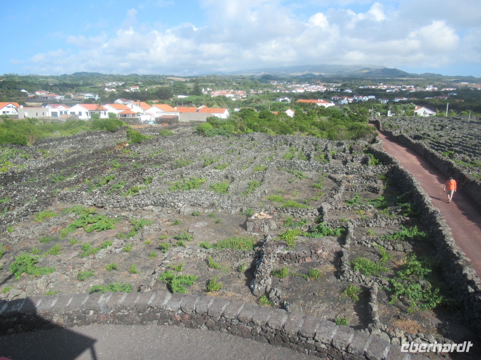 Kleine schwarze Steinmäuerchen, in Quadraten angelegt, wie kleine Gärtchen-„currais“,, an den sich die Weinreben ranken. Sie schützen die Rebenpflanzen vor den rauen Winden und dem Meeresklima. Es ist schon verwunderlich, dass man kaum Erde sieht – einfach nur Stein – und die Reben gedeihen und trotzen den rauen Bedingungen.