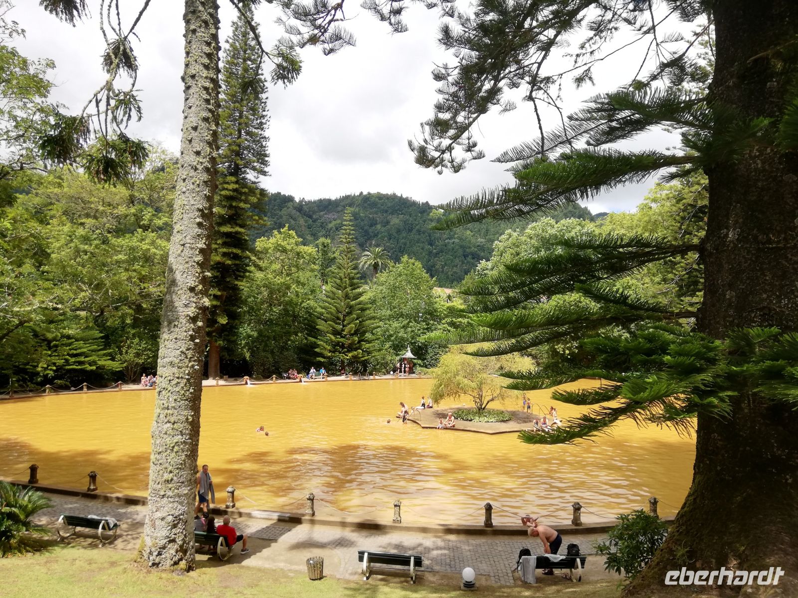In der Mitte des Parks befindet sich das große geothermische Thermalbecken, wo einige Menschen schwimmen oder einfach ruhen. Das Wasser im Becken hat eine charakteristische gelbbraune Färbung, die durch den hohen Eisengehalt verursacht wird, und eine angenehme Temperatur von etwa 35-40°C. Die mutigen probieren trotz den hohen Außentemperaturen das besondere Bad und es war aufgrund der hohen Luftfeuchtigkeit und hohen Temperaturen angenehm und sogar erfrischend.