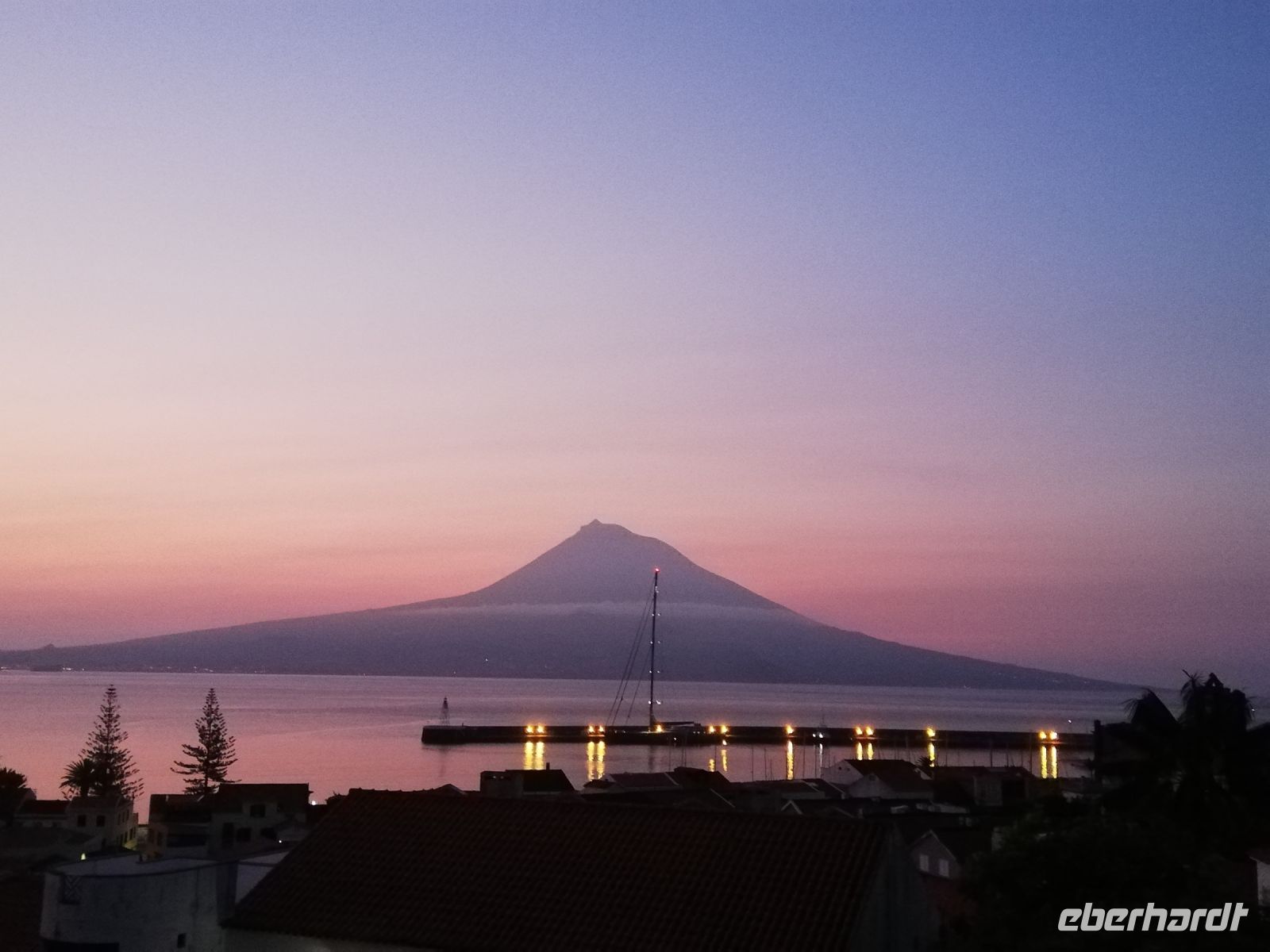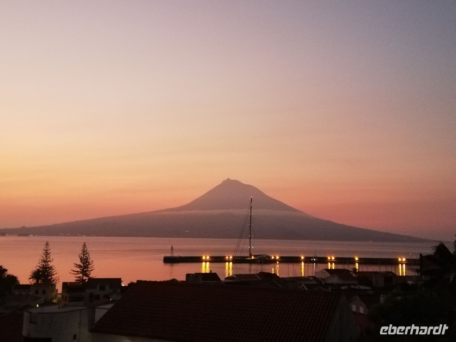 Der Morgen beginnt mit einem wunderschönen Ausblick vom Balkon des Zimmers auf den Hafen von Horta und einen Bilderbuch-Sonnenaufgang hinter dem gigantischen Pico. Was für ein Anfang des Tages…