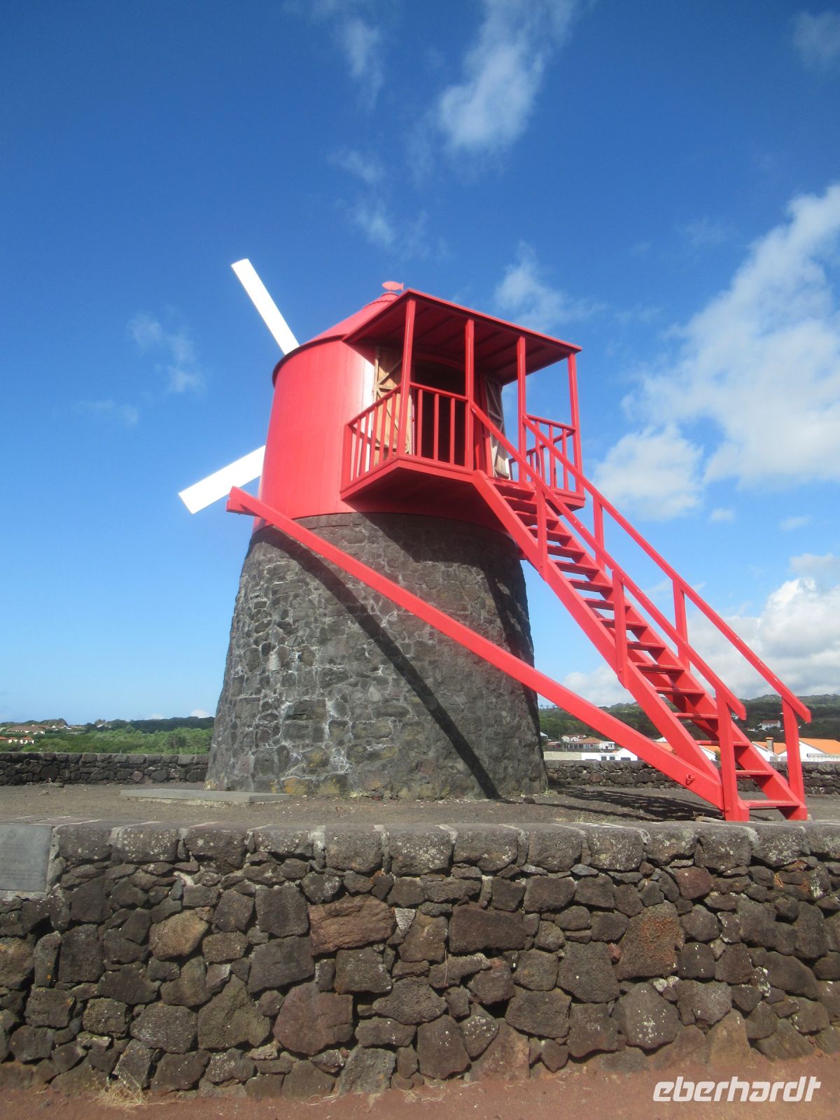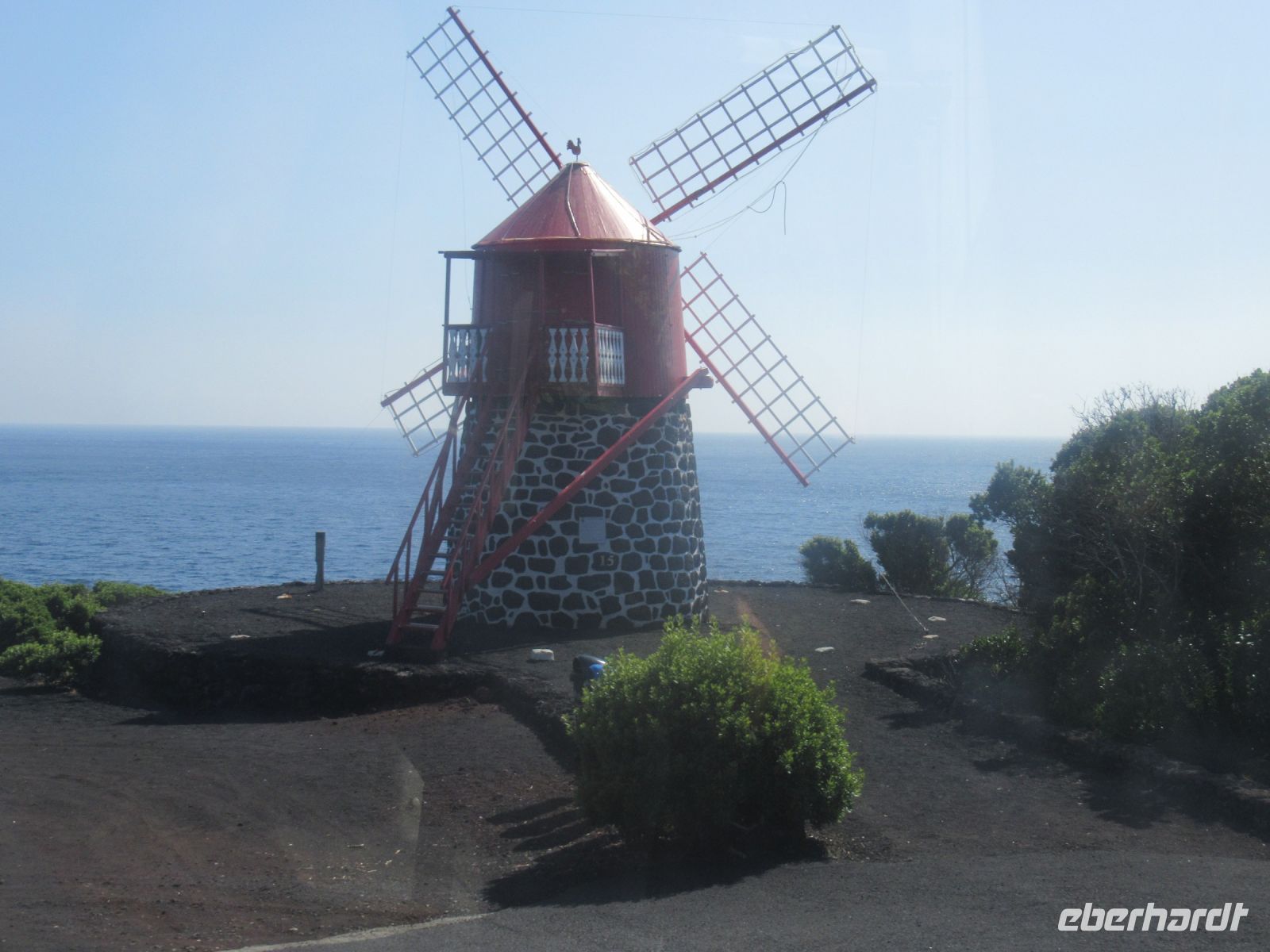 Jetzt haben wir noch kurz Freizeit für Getränk oder Eis und fahren weiter die Südküste entlang. Und nehmen langsam Abschied von der wunderschönen „Schwarzen“ Insel. Unterwegs sehen wir noch die verbliebenen Windmühlen, die allerdings nicht mehr im Betrieb sind. Jetzt landen wir wieder am Fährenterminal in Madalena und übersetzen auf Faial.