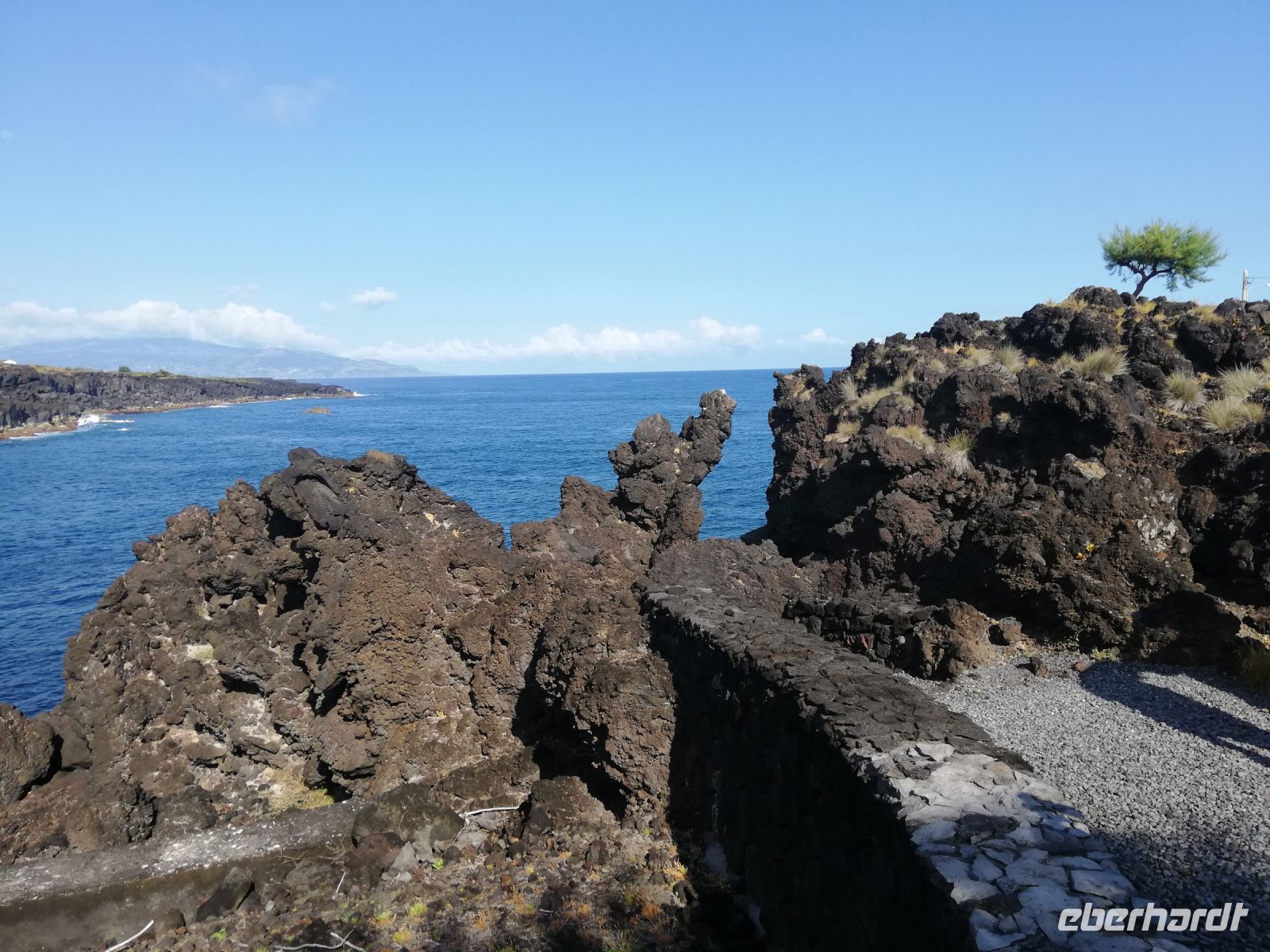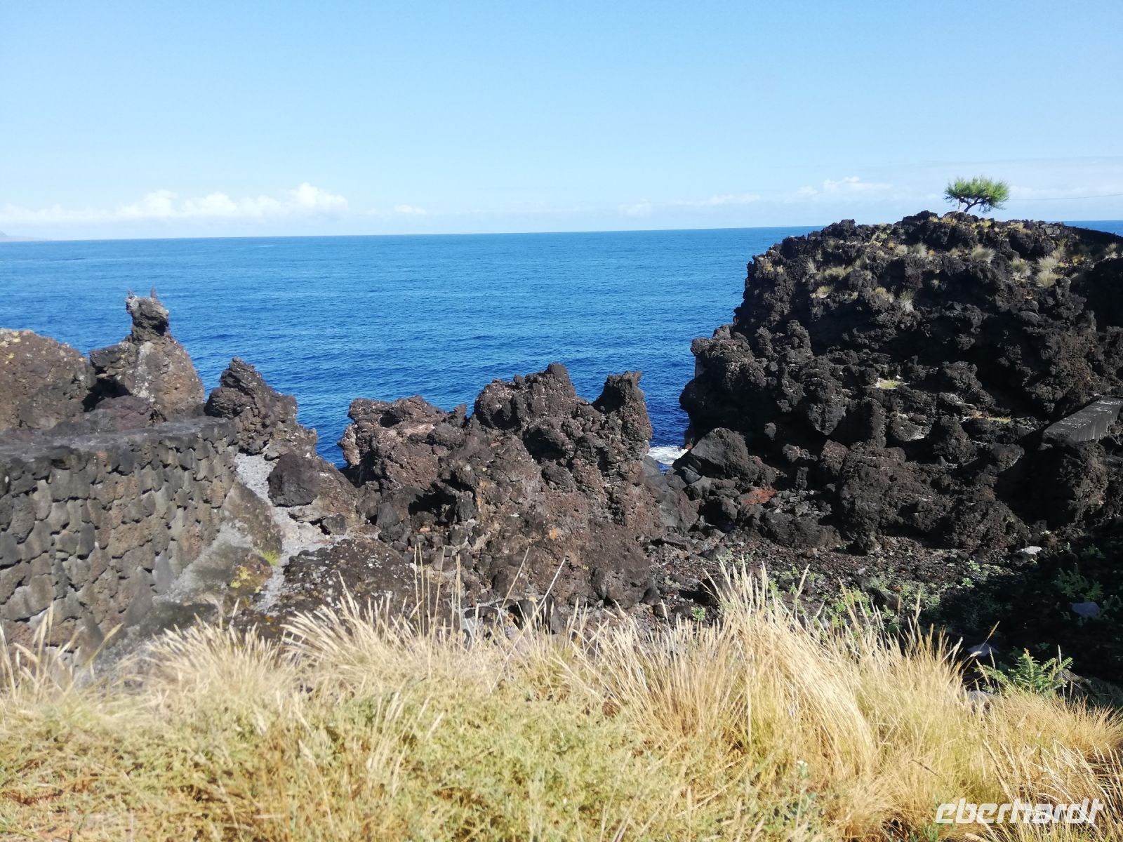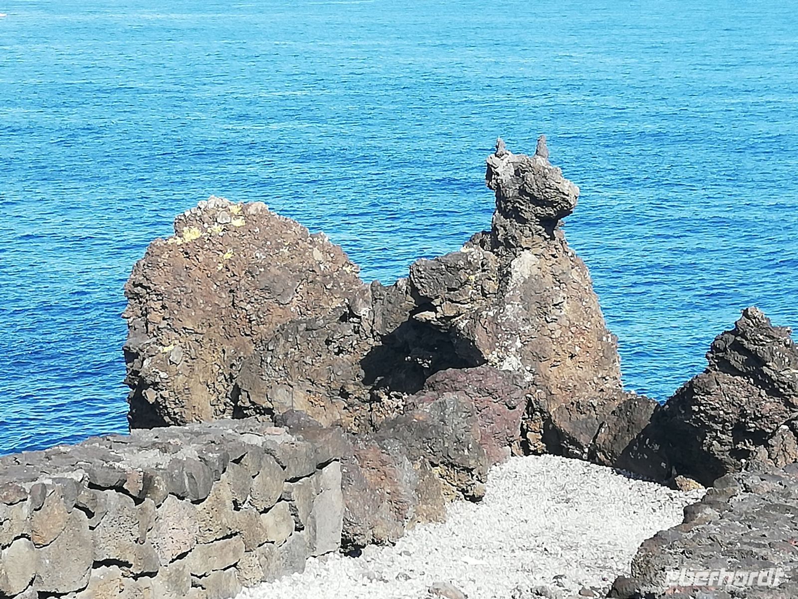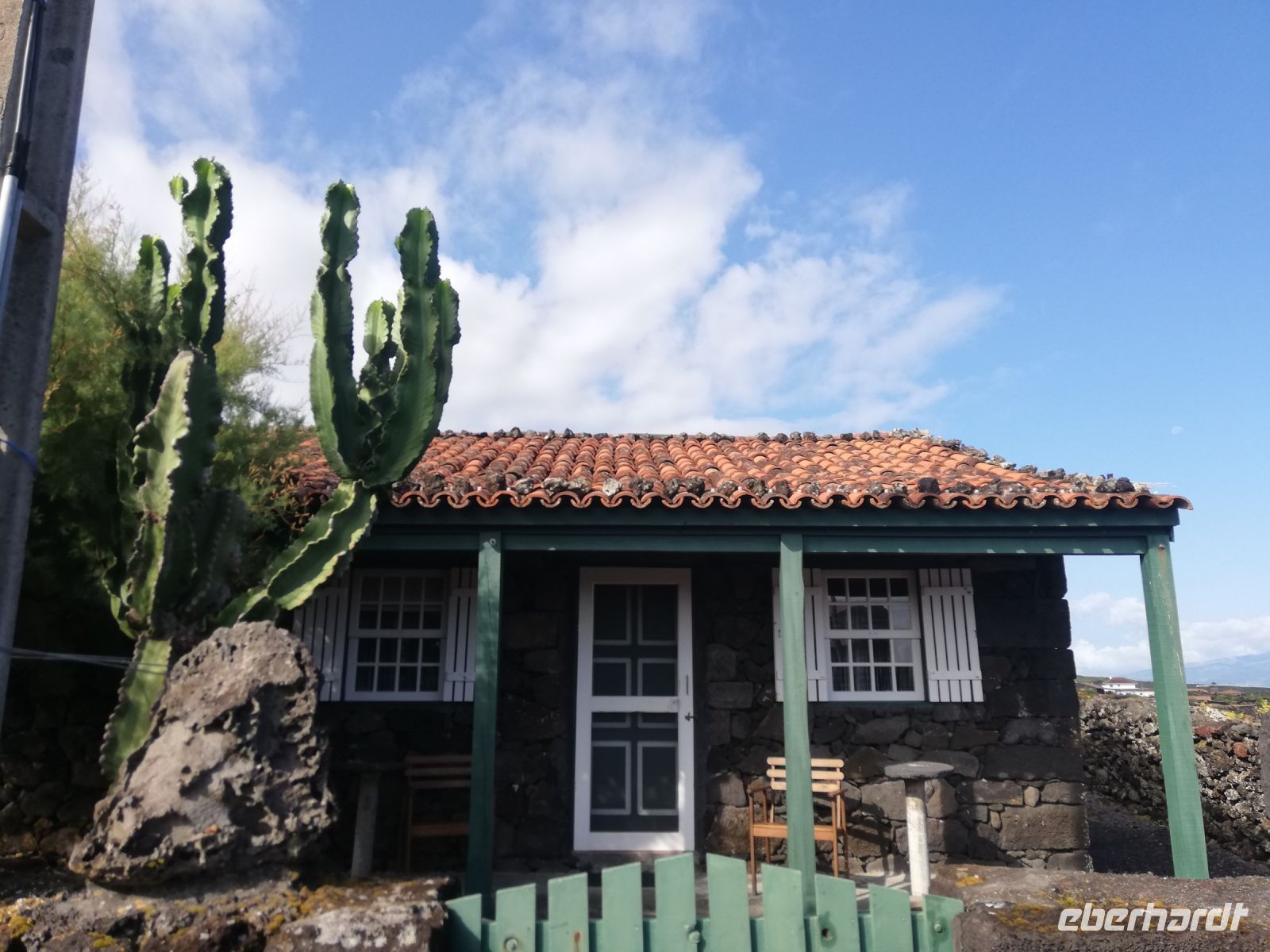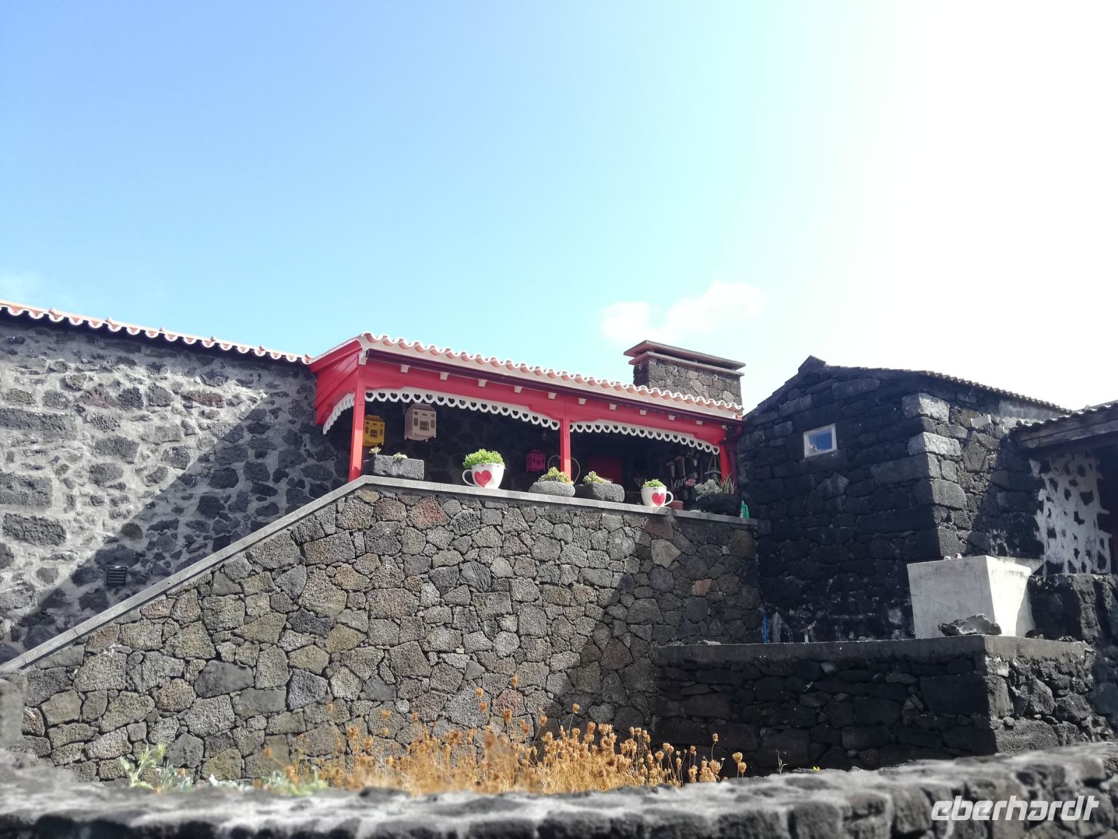 Wir halten in einem kleinen Winzerort, wo nur eine Handvoll Häuser zu sehen sind - Cachorro – (Cachorro bedeutet auf Portugiesisch - Hund). Die Architektur der Häuser wirkt wie im Märchen - Mauer aus schwarzem Basalt und die weißen Fenster mit roter Holzverkleidung verleihen den Häuser einen besonderen Charme. Wir bewundern die einfachen Bauten. Bald sind wir an der Küste – und was sehen wir hier – einen Felsen mit „Ohren“ – ja das ist der Hund, nach dem der Ort den Namen erhalten hat.