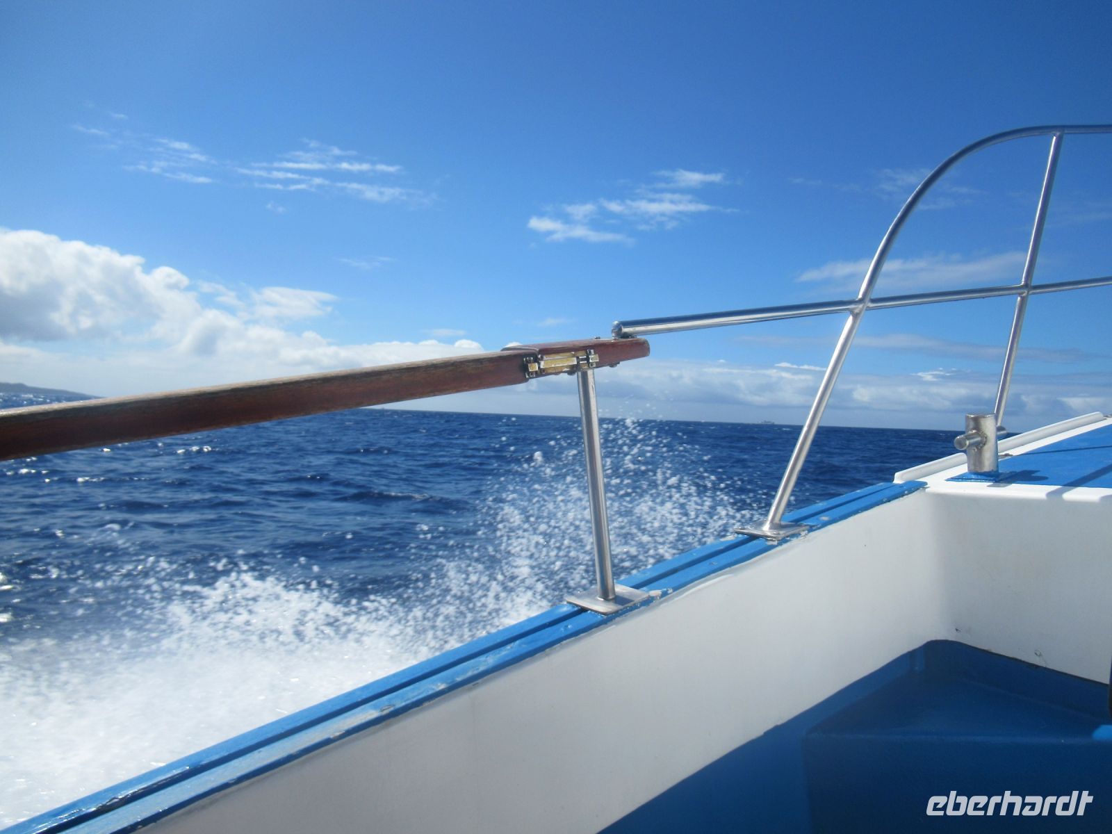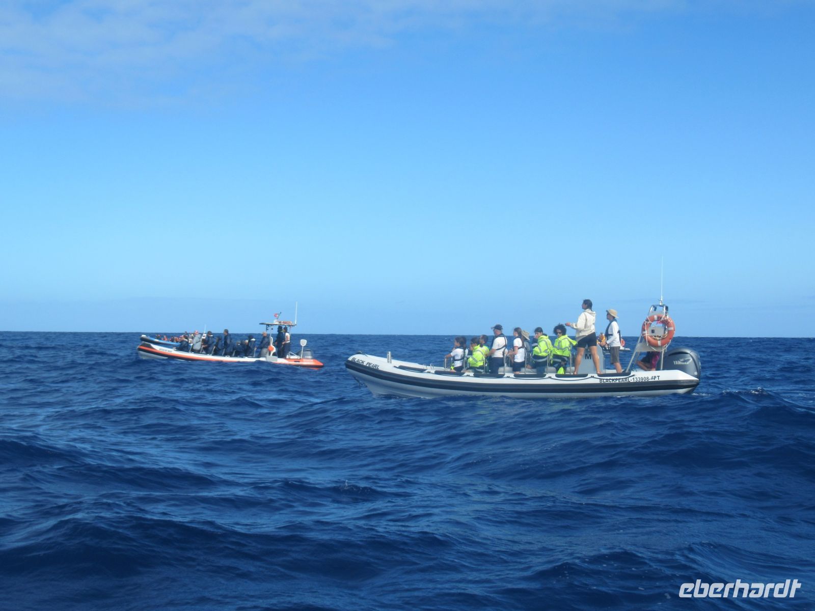 Unser Schiff ist ein Katamaran für 16 Personen, da wir 13 sind, ist fast das ganze Schiff für uns. Raquel gibt uns Sicherheitshinweise, Westen haben wir allerdings nicht. Los geht´s auf die hohe See! Mit großem Speed fahren wir in die Wellen des Atlantiks und wir haben jetzt einen Ausblick auf Horta vom Wasser. Das Schiff schaukelt ganz ordentlich und wir sind froh, dass wir nicht im Schlauchboot sitzen. Fast eine Stunde fahren wir bis wir die Gewässer erreichen, wo die Wale Ihren Lebensraum haben. Hier bleiben wir stehen oder fahren nur langsam, jetzt dürfen wir uns auch ans Geländer stellen, um besser die Meeresfläche zu beobachten. Bald meldet uns Raquel – hier in diese Richtung schauen, hier gibt es Bewegung: Und wir sehen sie tatsächlich – die Pottwale - zunächst die „Fontäne“ die sie durch das Ausatmen durch Ihr Blasloch verursachen und sich so bemerkbar machen, dann die riesigen Rücken oder auch die Flosse. Wow, hört man von den Gästen bei jeder Bewegung– leider ist es ganz schwierig es in Fotoapparat zu erfassen. Was für ein Glück, trotz der nicht so guten Chancen heute Morgen.