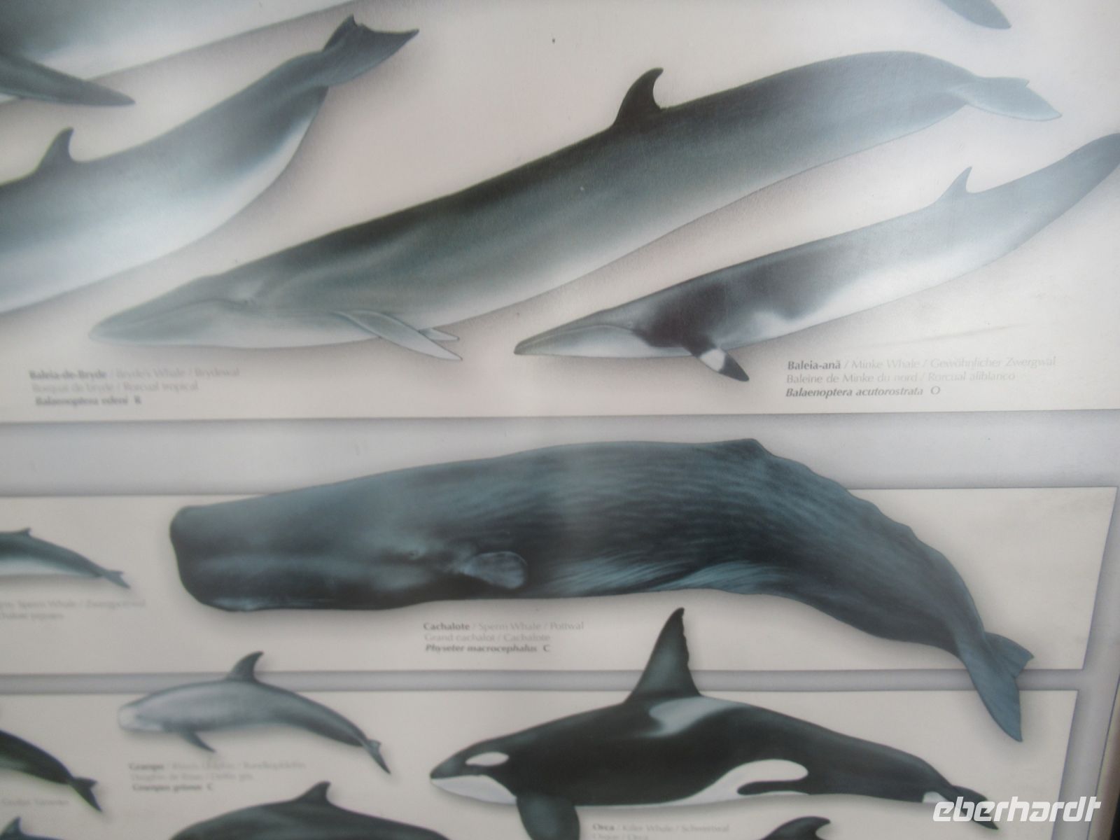 Raquel erklärt uns mit einer großen Tafel die Arten Wale und Delphine, die es in der Region zu sehen gibt. Es sind vor allem Pottwale und Delphine. Die Pottwale kommen in die Gewässer der Azoren, weil diese Region ideale Bedingungen für sie bietet. Insbesondere durch die reichhaltigen Nahrungsquellen und ganzjährig gute Bedingungen für das Leben der Wale. Die Meeressäuger tauchen in große Tiefen bis zu 3000 M und jagen vor allem Tintenfische. Nun sind wir zuversichtlich, dass wir diese auch sehen werden.