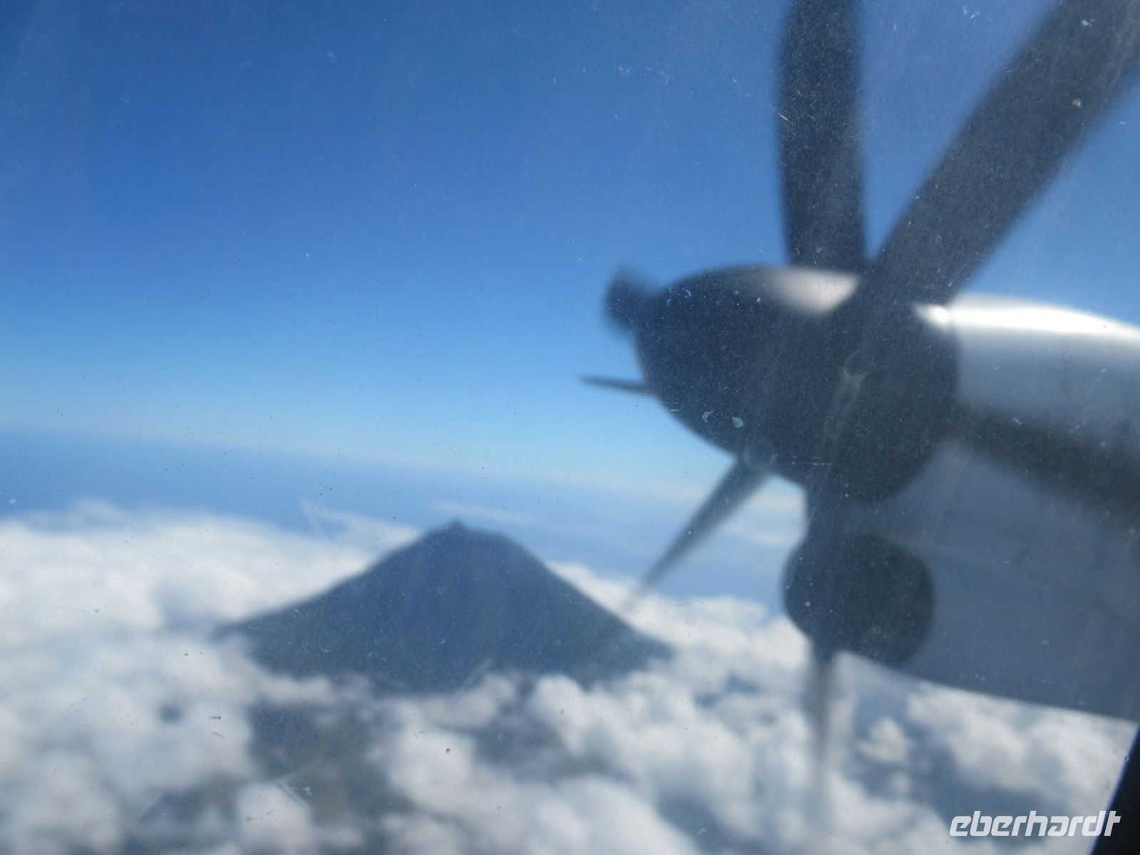 Zurück am Flughafen „same procedure“ noch mal und dann noch ein zweiter Snack. Jetzt fliegen wir endlich mit einer Propellermaschine und haben einen fantastischen Blick auf den Berg Pico auf der gleichnamigen Insel. Wir landen in Horta, unsere Reiseleiterin Anja erwartet uns mit Bus und wir beziehen die Zimmer im Hotel Horta und nehmen das Abendessen vom Büffet in Restaurant. Wir löschen den Durst und auch etwas Frust…morgen ist ein neuer Tag.
