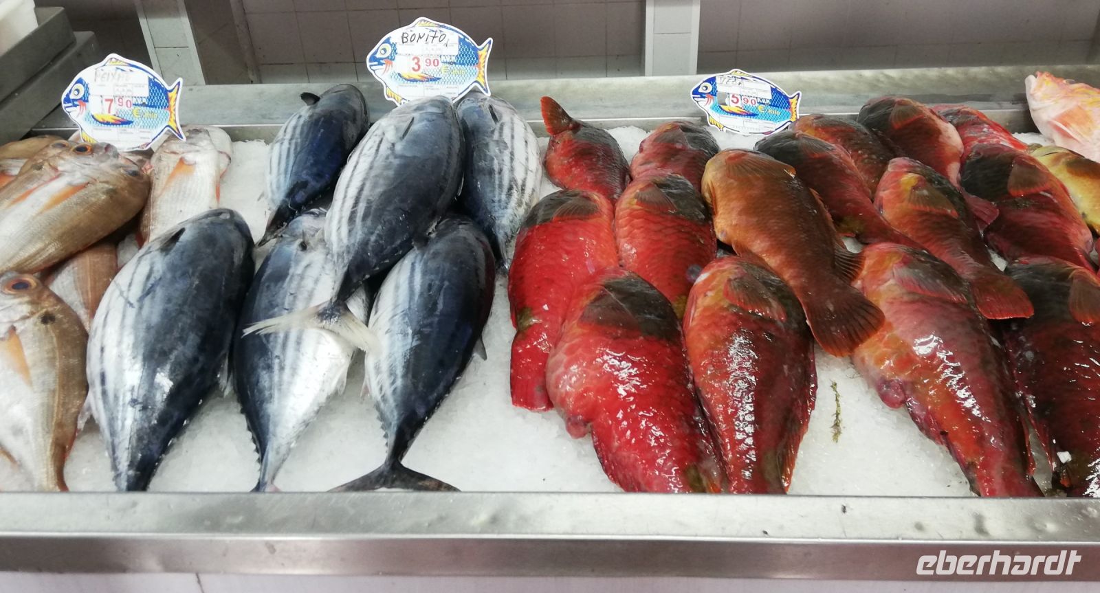 Wir schlendern weiter durch die Stadt und besuchen die kleine Markthalle mit frischem Fisch, regionalen Obst und Gemüse.