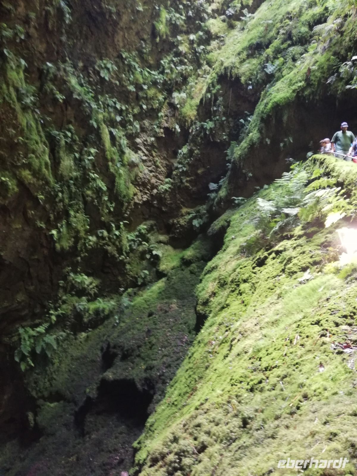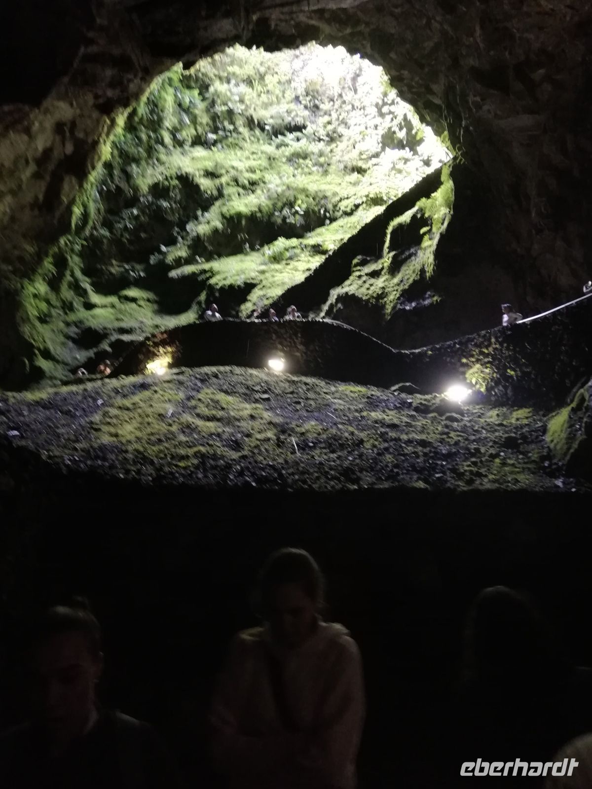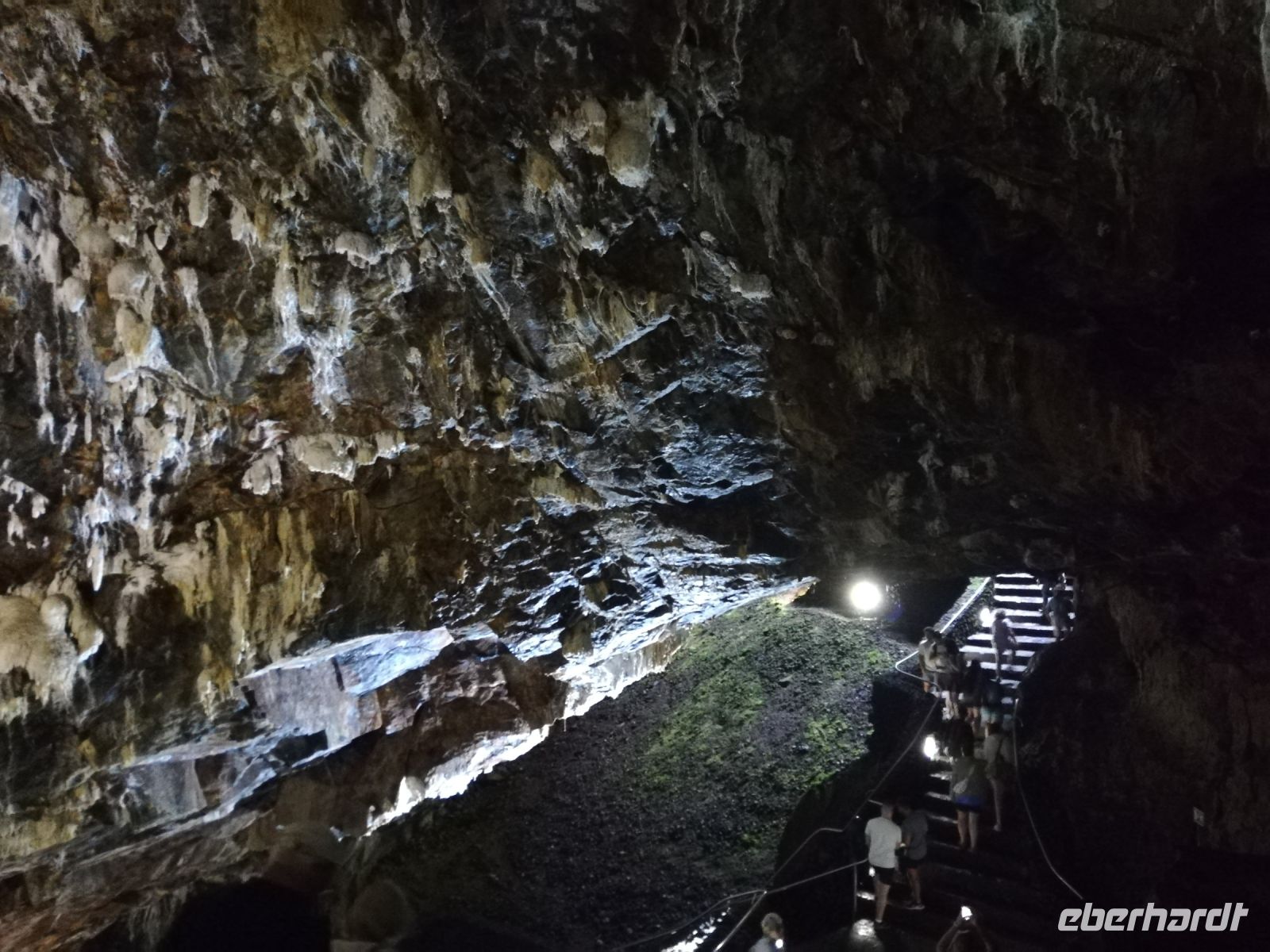 Die Vulkanhöhle „Agrar do Calvão“ entstand vor etwa 1000 Jahren durch einen Vulkanausbruch. Sie ist eine Lava-Röhre, die durch den Fluss von Lava gebildet wurde, an der Oberfläche abkühlte und eine Tunnelstruktur hinterließ. Die Höhle ist berühmt für ihre atemberaubenden Stalaktiten und Stalagmiten, die durch die Ablagerung von Mineralien im Wasser entstanden sind. Es ist schon spektakulär, dass man von einer anfangs grünen Röhre in die unterirdische so farbenfrohe Unterwelt kommt. Hier kühlen wir uns wenigstens etwas ab…