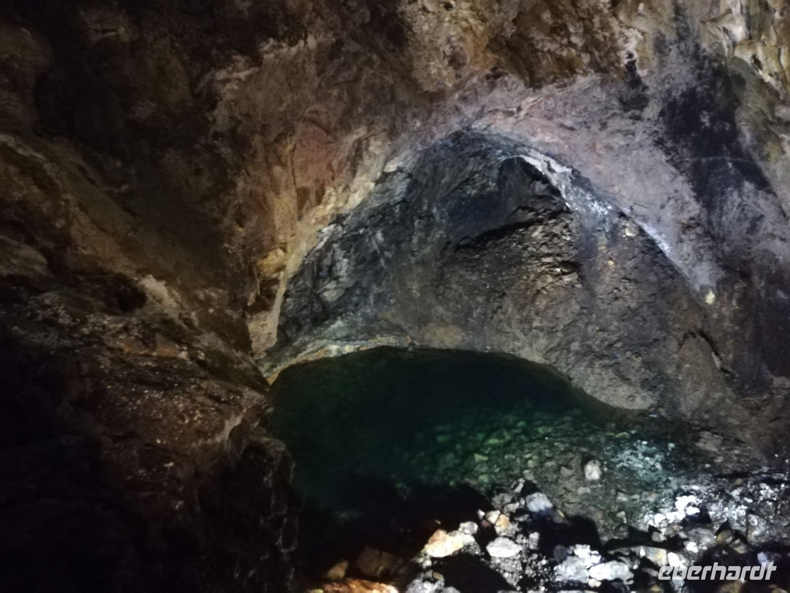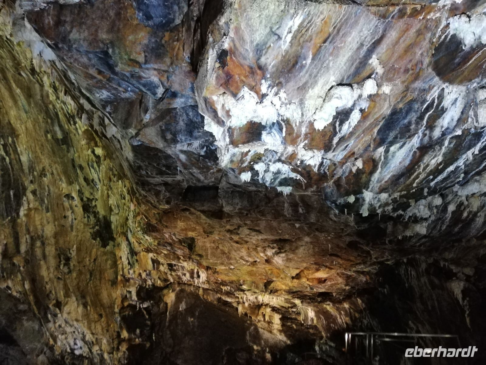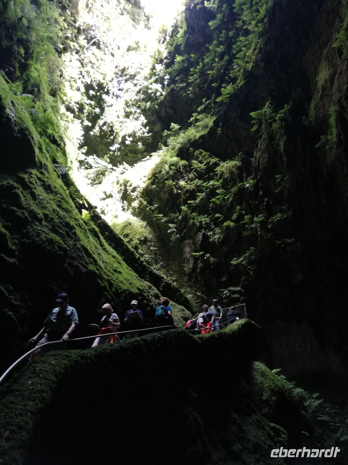 Die Vulkanhöhle „Agrar do Calvão“ entstand vor etwa 1000 Jahren durch einen Vulkanausbruch. Sie ist eine Lava-Röhre, die durch den Fluss von Lava gebildet wurde, an der Oberfläche abkühlte und eine Tunnelstruktur hinterließ. Die Höhle ist berühmt für ihre atemberaubenden Stalaktiten und Stalagmiten, die durch die Ablagerung von Mineralien im Wasser entstanden sind. Es ist schon spektakulär, dass man von einer anfangs grünen Röhre in die unterirdische so farbenfrohe Unterwelt kommt. Hier kühlen wir uns wenigstens etwas ab…