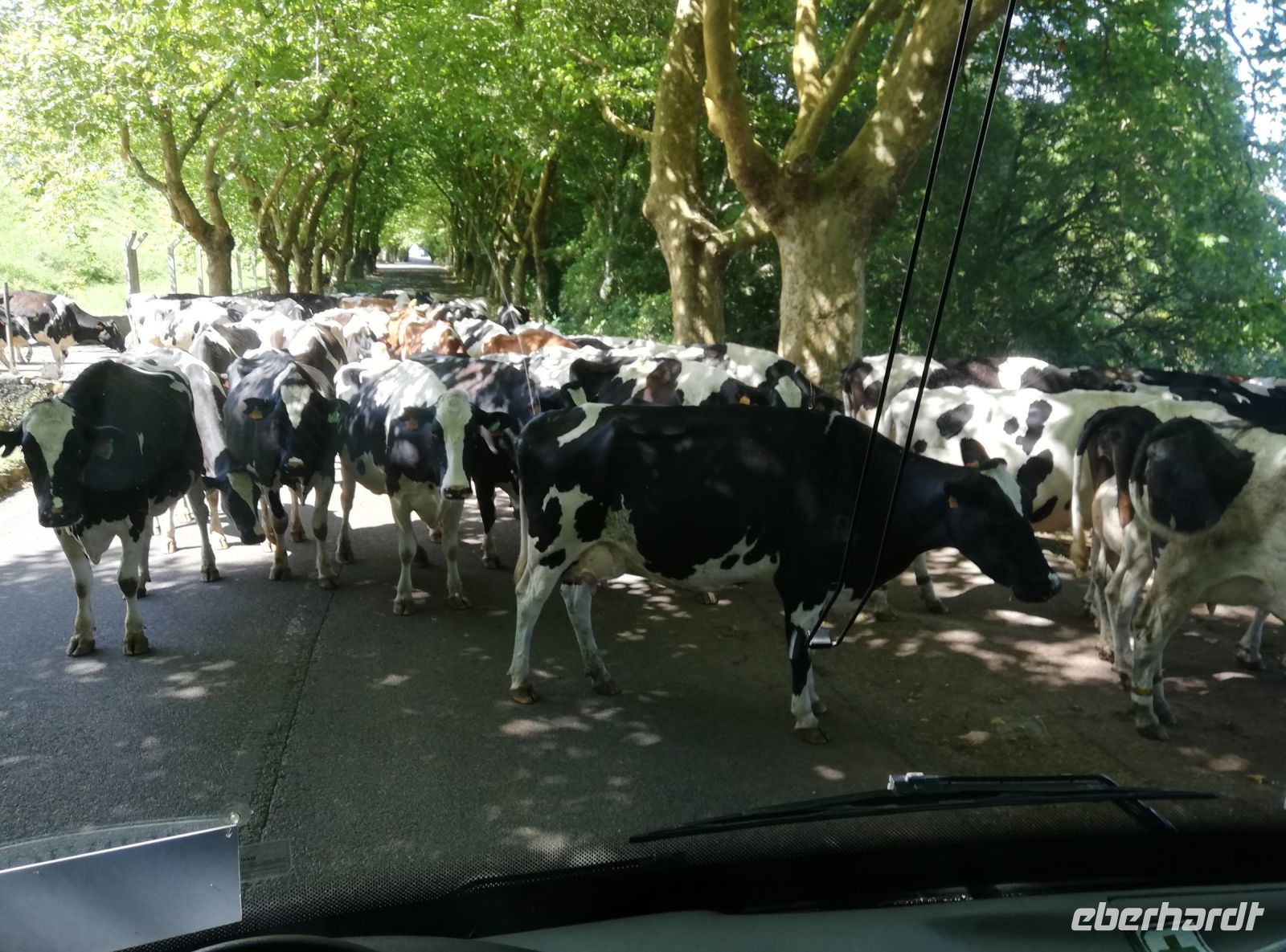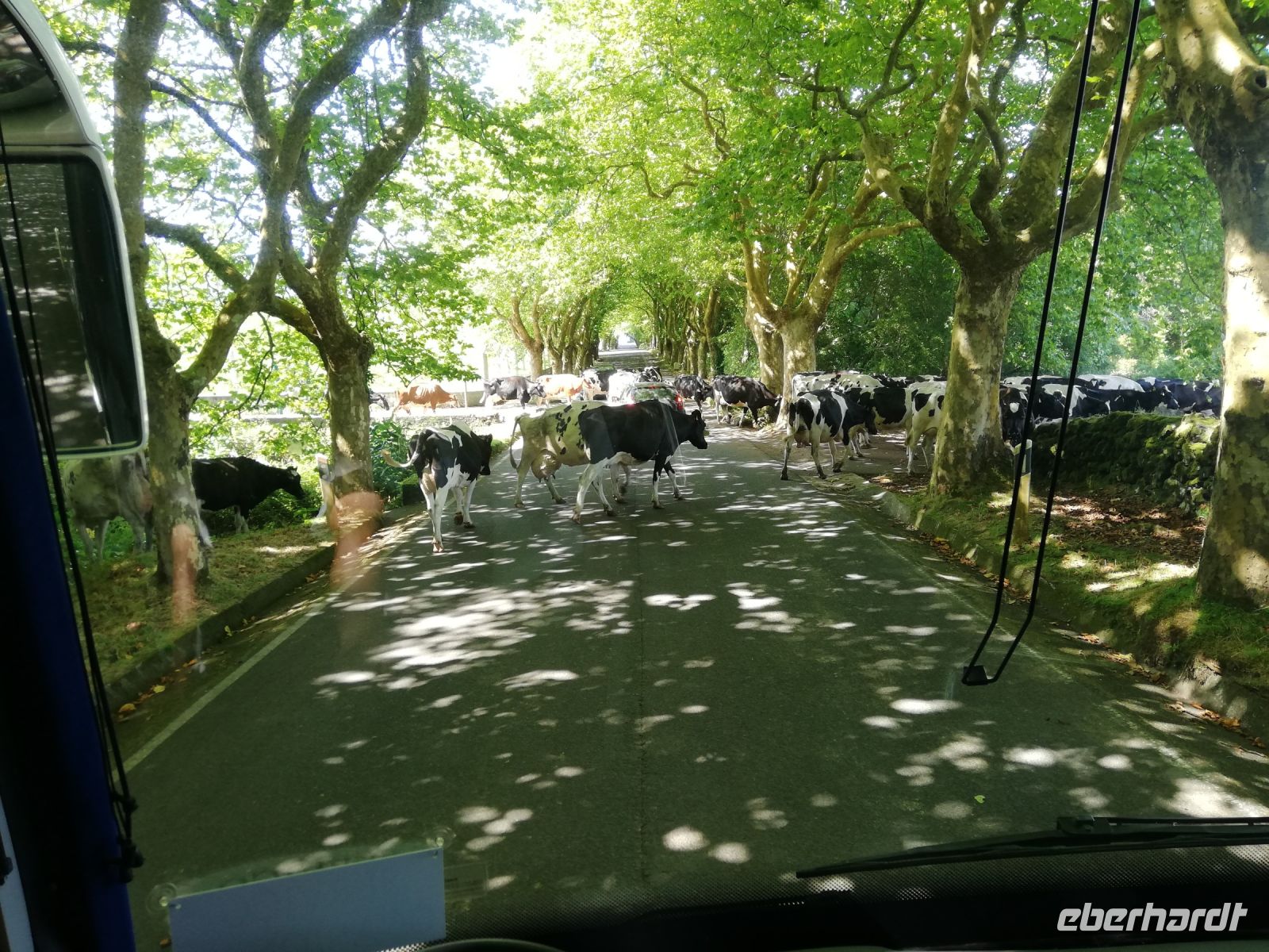 Der Bus fährt weiter durch bewaldete Landschaften und auf einmal haben wir nicht nur Autos auf dem Weg, sondern jede Menge Kühe – die spazieren seelenruhig durch die befahrene Straße und lassen sich von den Autos und unserem Bus gar nicht beeindrucken, bis am Ende ein Schäfer sie doch über die Straße steuert. Jetzt wissen wir woher der leckere Käse kommt.