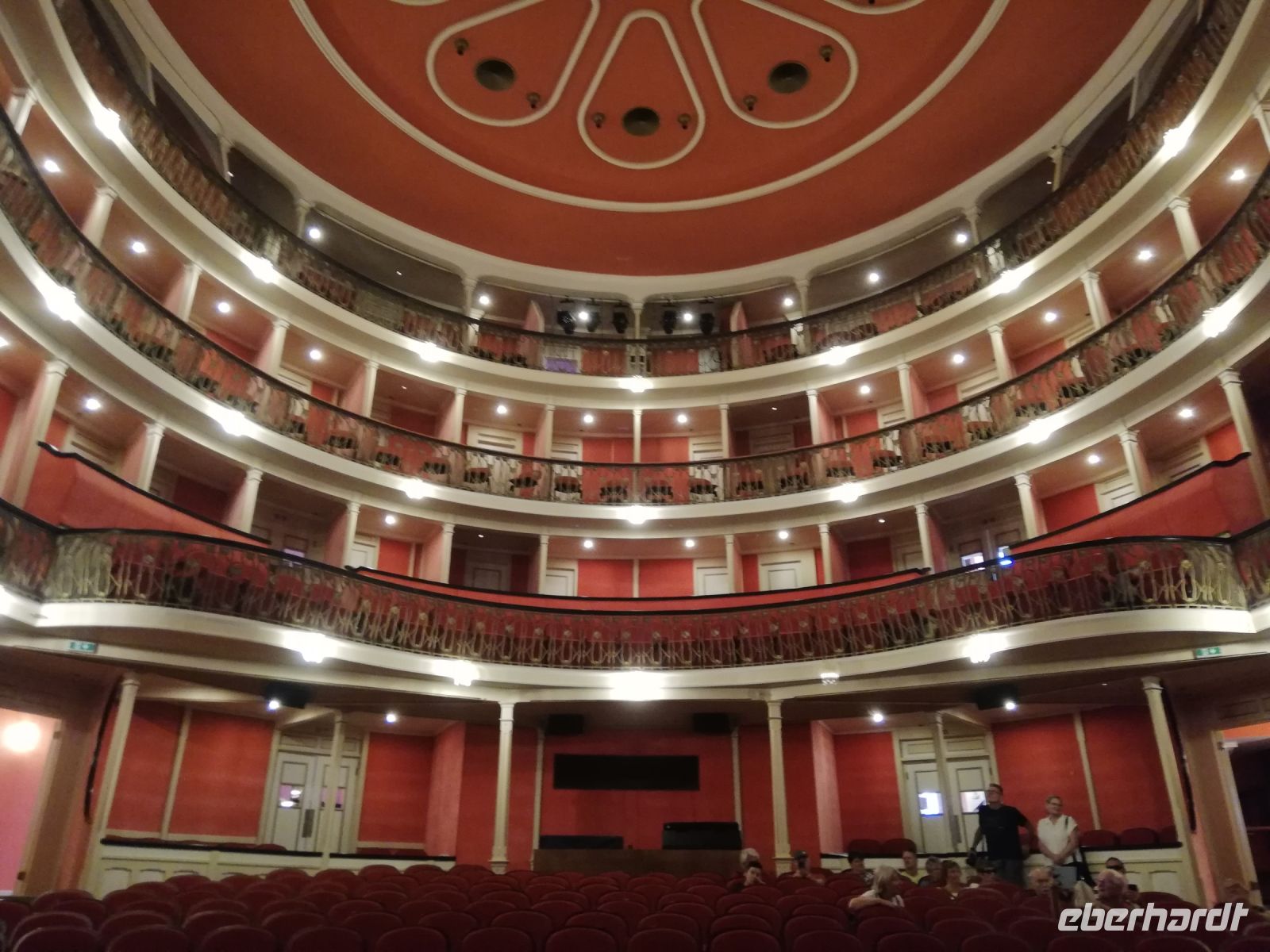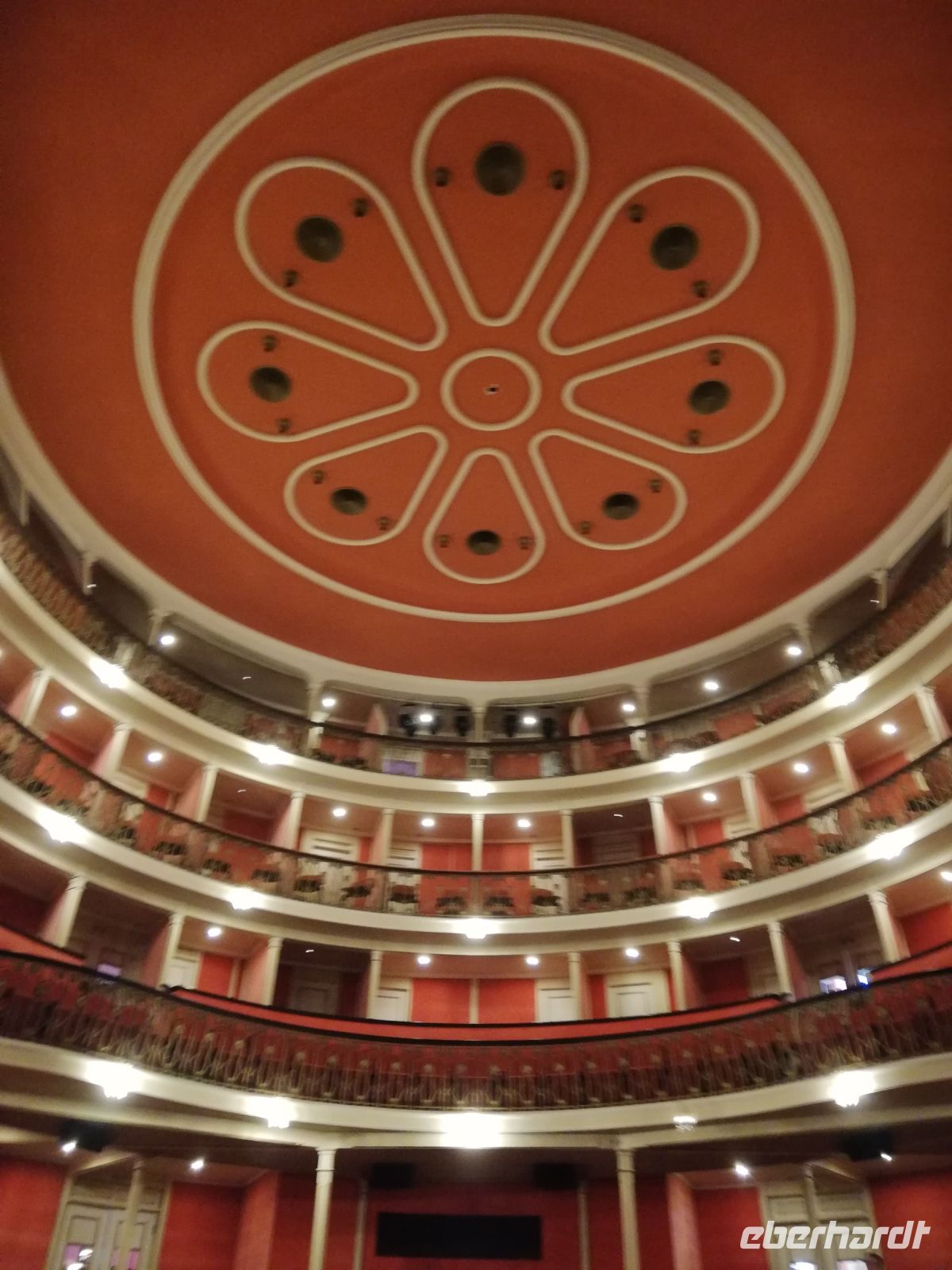 Gleich um die Ecke führt uns Thomas in ein Gebäude und wir staunen nicht schlecht… ein prächtiges Theater in Rot-Gold. Das Teatro Angrense mit 400 Sitzplätzen wurde 1861 eröffnet und dient seitdem als kulturelles Zentrum der Stadt. Es wurde in einer Zeit errichtet, in der das Theater in Portugal und auf den Azoren eine wichtige Rolle im gesellschaftlichen und kulturellen Leben spielte. Das hätten wir hier nicht erwartet.