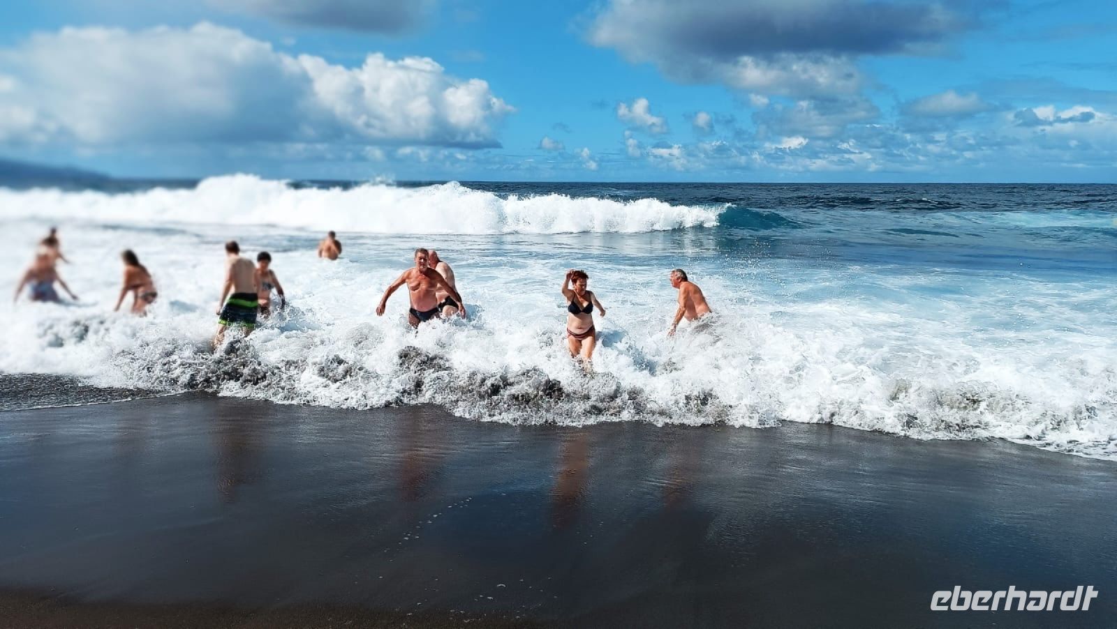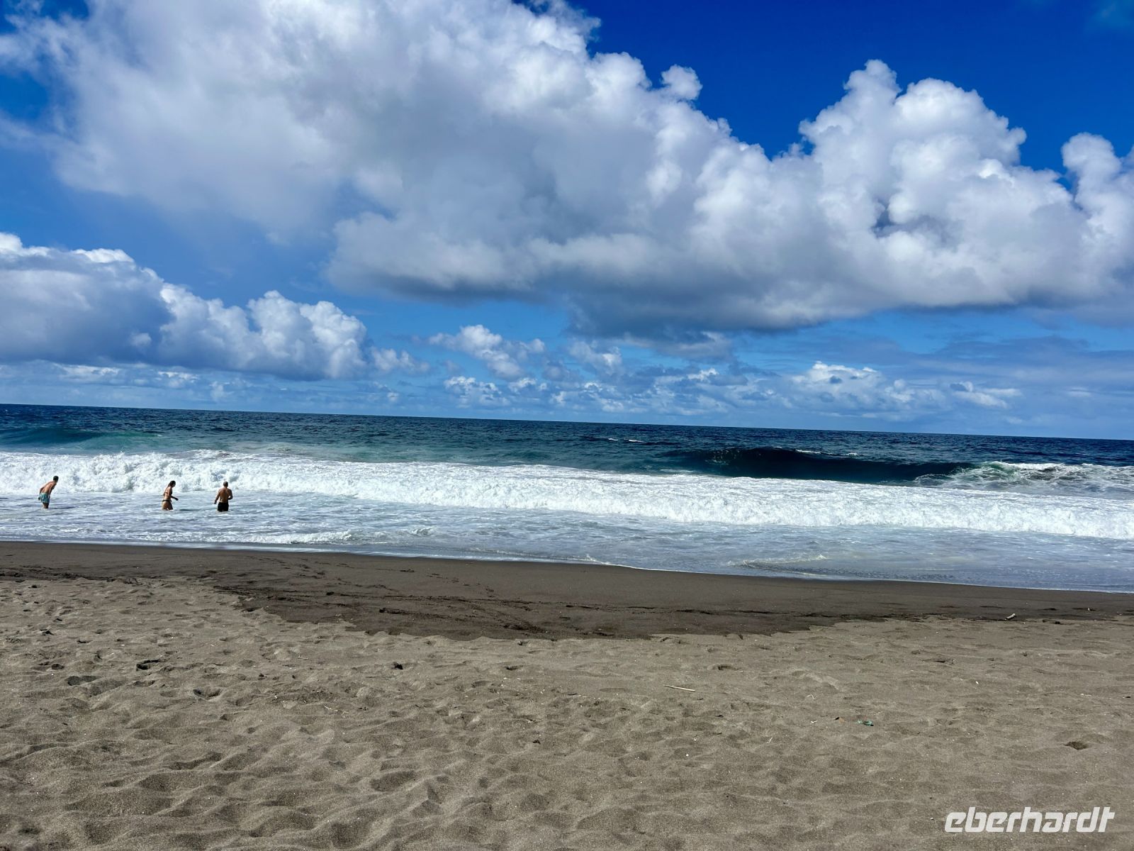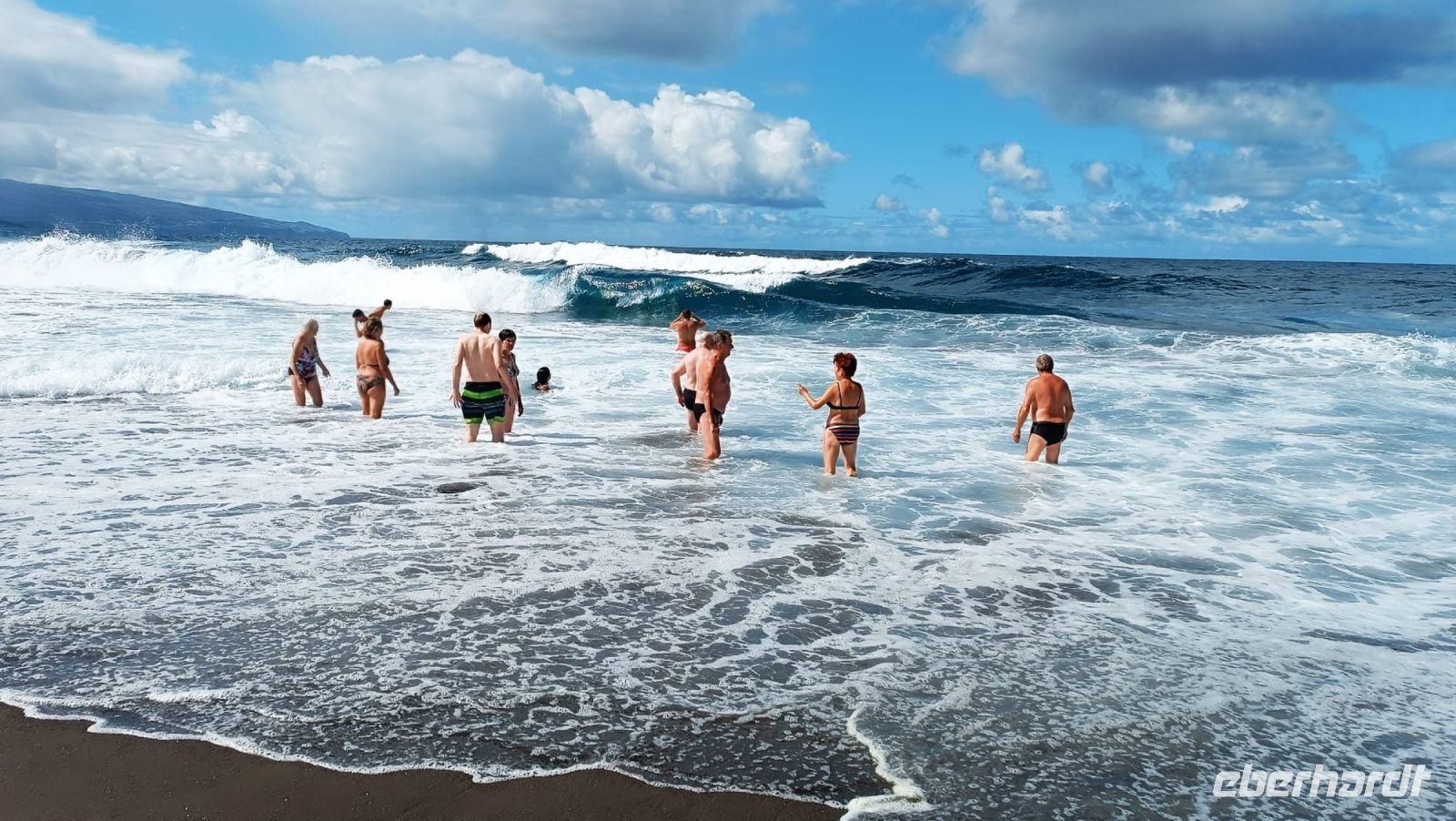 Und nun stand ein Abstecher an den schwarzen Sandstrand an - natürlich - ein Bad in den warmen Fluten des Atlantik durfte nicht fehlen. Und was war das für ein Spass! Die riesigen Wellen rollten heran und überschlugen sich und man musste schon richtig standfest sein, um nicht umgeworfen zu werden. Doch der Strandabschnitt ist bewacht und so ist das Baden ungefährlich möglich. Eine tolle Erfahrung!