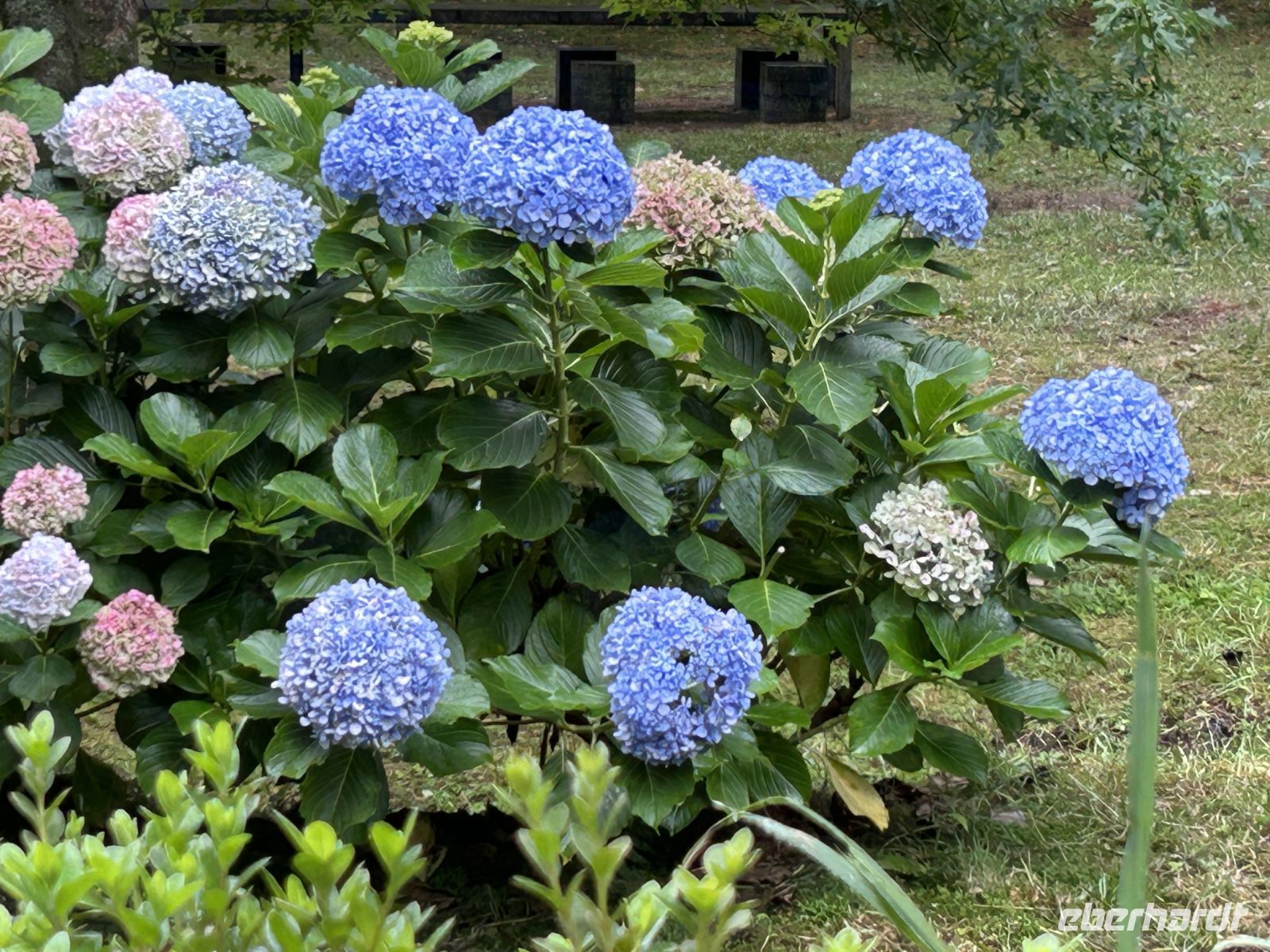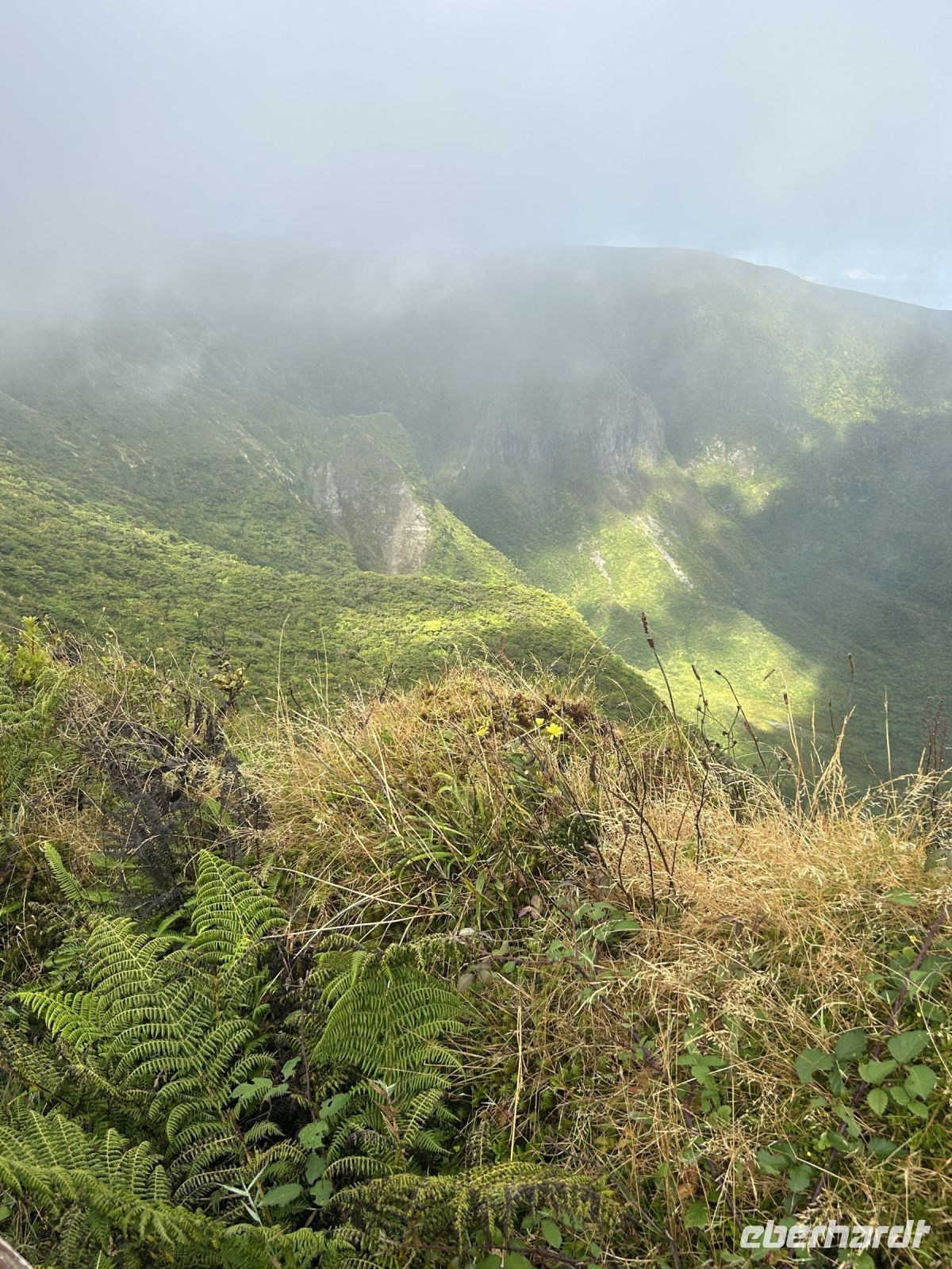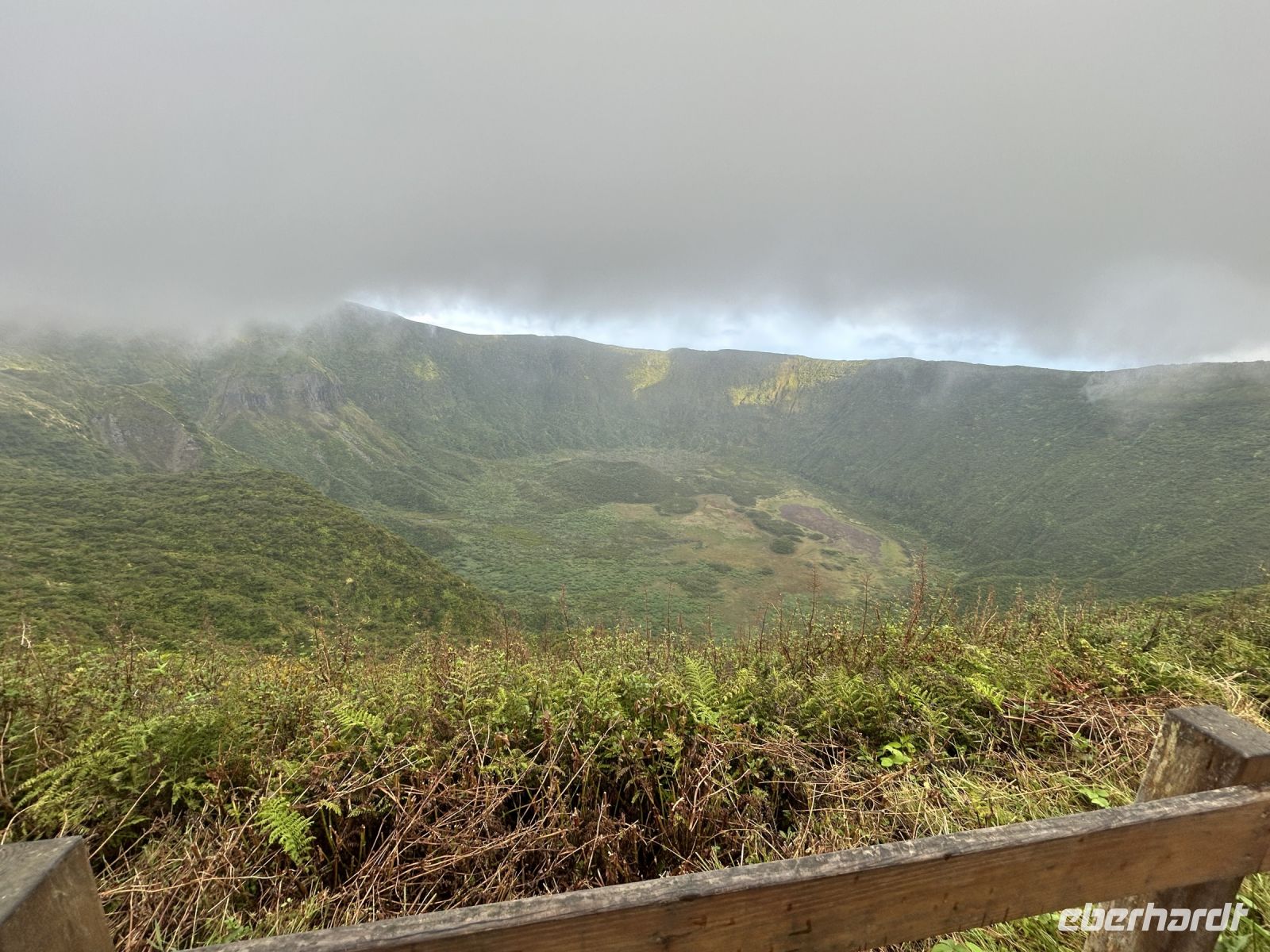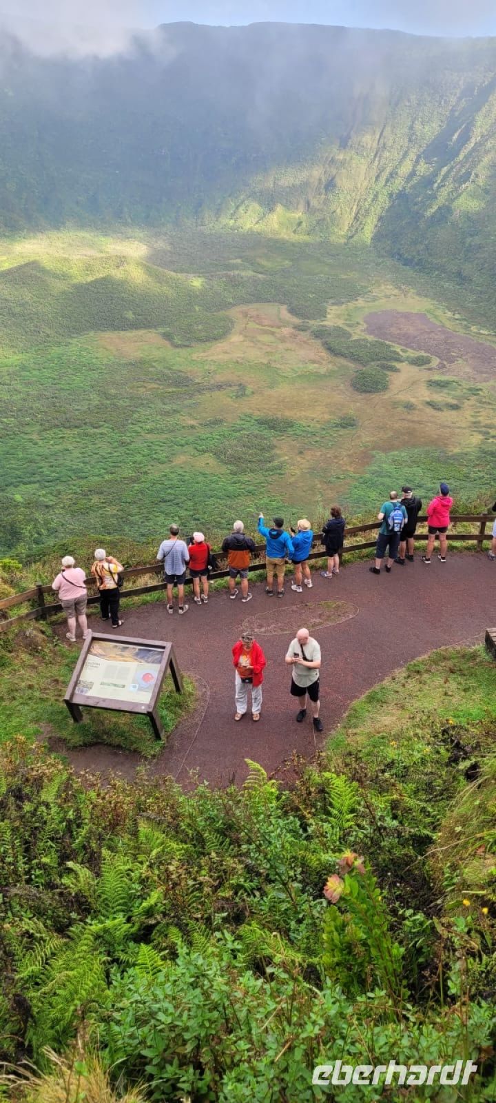 Faial wird oft die blaue Inse genannt, dank der zahlreichen Hortensien, die hier wachsen. Unsere Inselrundfahrt führte uns durch eine Landschaft, die von dramatischen Vulkanen geprägt ist. Immer wieder Straßen mit langen Reihen Hortensien. Ein Stopp an der Caldeira do Faial - es ist ziemlich diesig und wir fahren durch dicke Wolken. Doch es zieht kurz auf, wir sehen den Krater (2km Durchmesser, 400m hohe Kraterwände, grün bewachsen) und können Fotos machen.