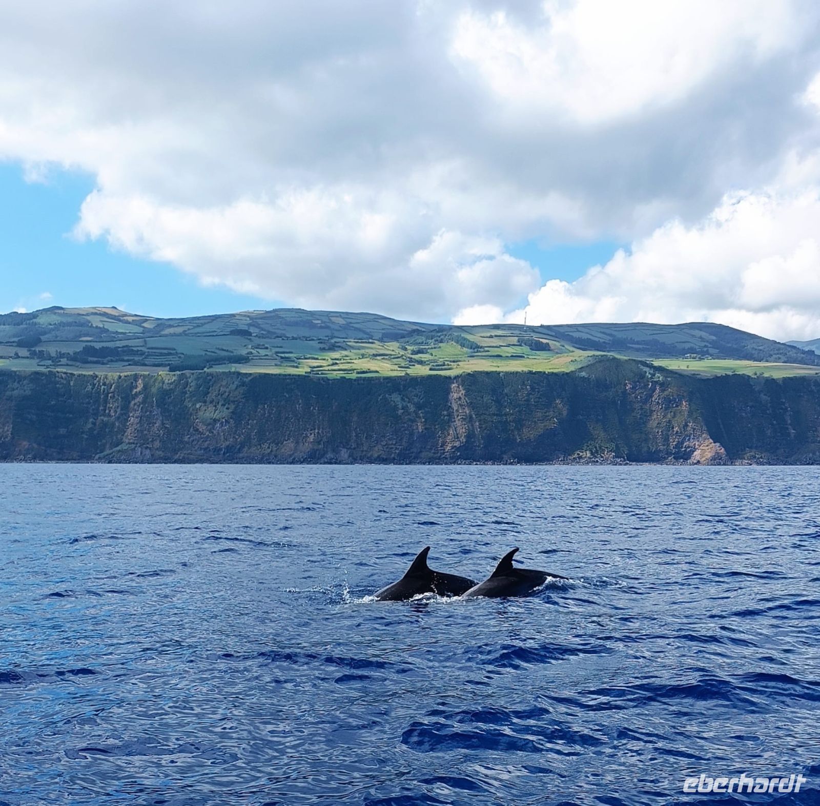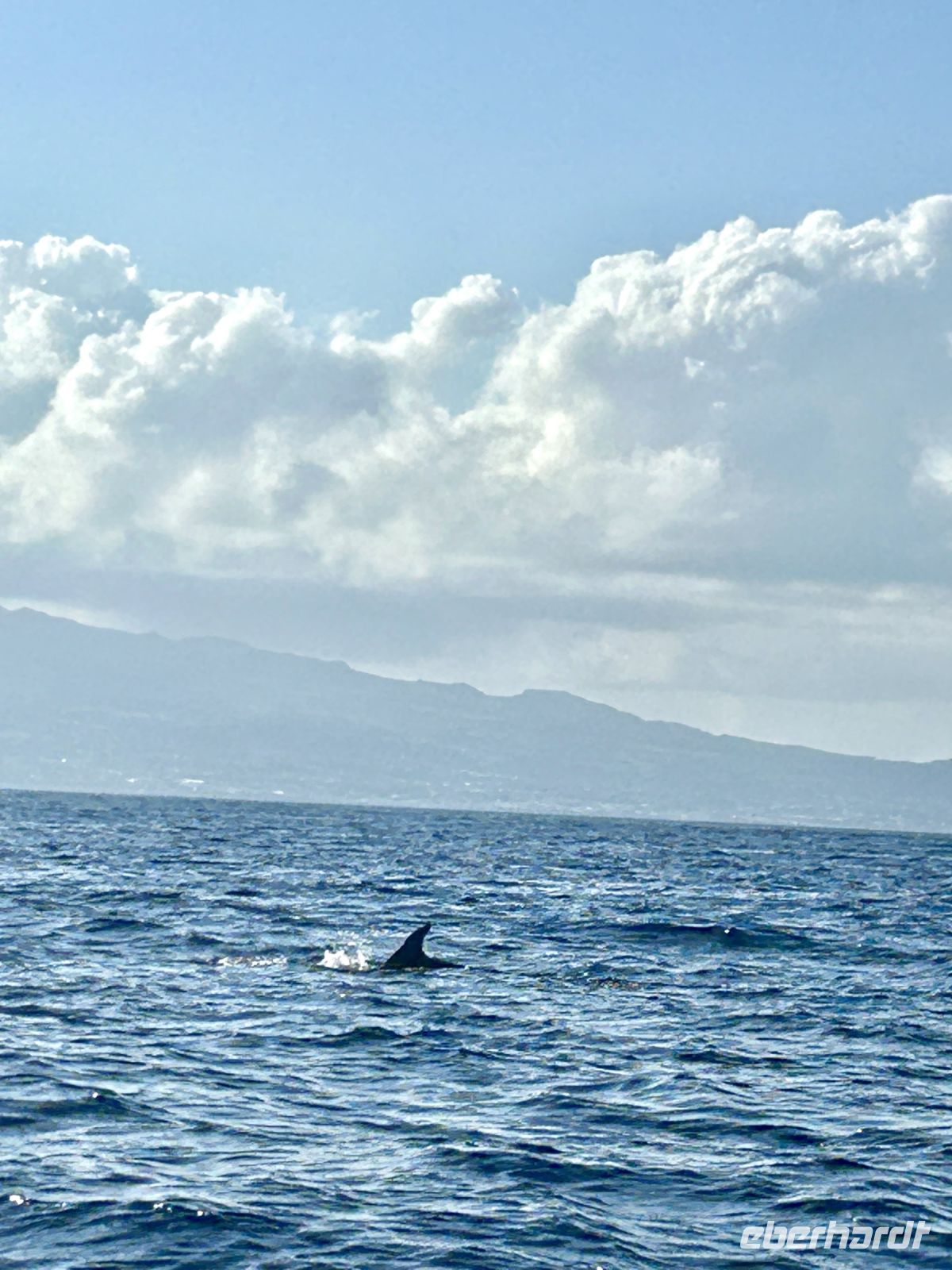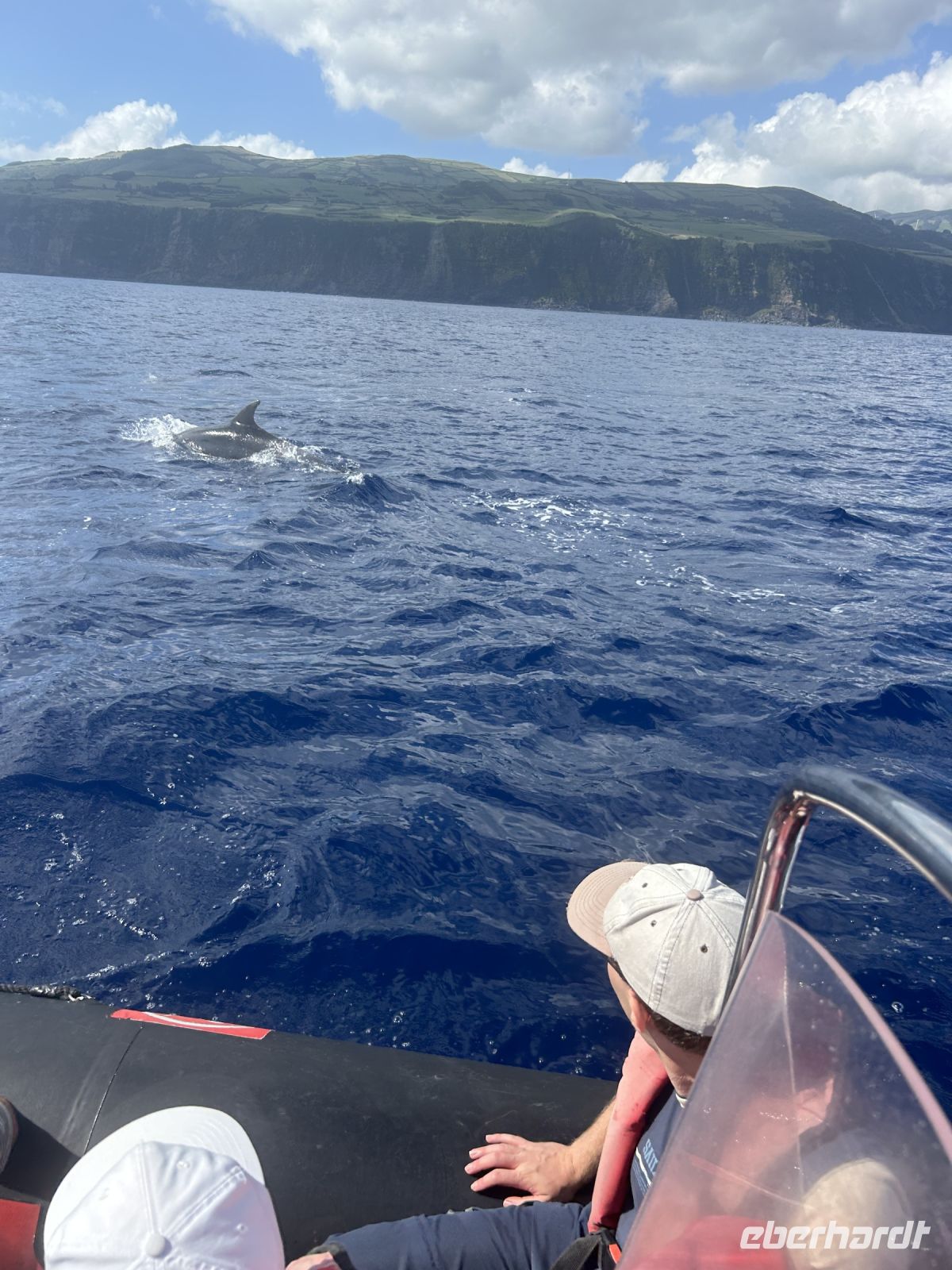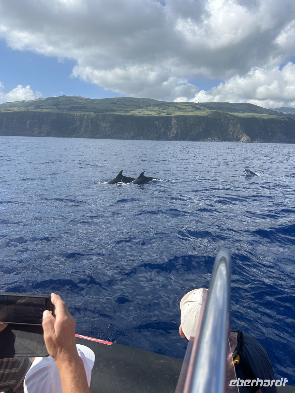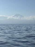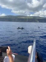Der achte Tag bot uns die Möglichkeit zur Entspannung oder zur Teilnahme an einer Walbeobachtungstour. Und dies ließen sich die allermeisten natürlich nicht entgehen! Die Gewässer um die Azoren sind bekannt für ihre reiche Meeresfauna, und die Sichtung von Walen und Delfinen ist ein unvergessliches Erlebnis. Etwas Geduld ist schon erforderlich, denn zunächst sind die Aufenthaltsorte ausfindig zu machen. Dafür gab es schon früher „Späher“, die am Hang in einem Häuschen sitzen und das Meer beobachten und nach Wal-Fontänen Ausschau halten. Wir fuhren mit einem schnellen Motorboot und folgten den Funkanweisungen des Spähers. Die Wale waren schneller als wir und tauchten dann wieder ab, doch einen Flossenschlag konnten wir auf dem Foto festhalten. Dafür hatten wir umso mehr Freude mit zahlreichen Delfinen rund ums Boot. Ganze Delfinfamilien begleiteten uns. Was für ein herzerfüllendes Erlebnis!
