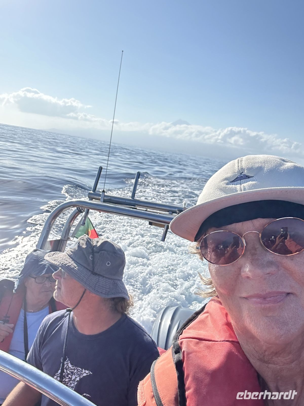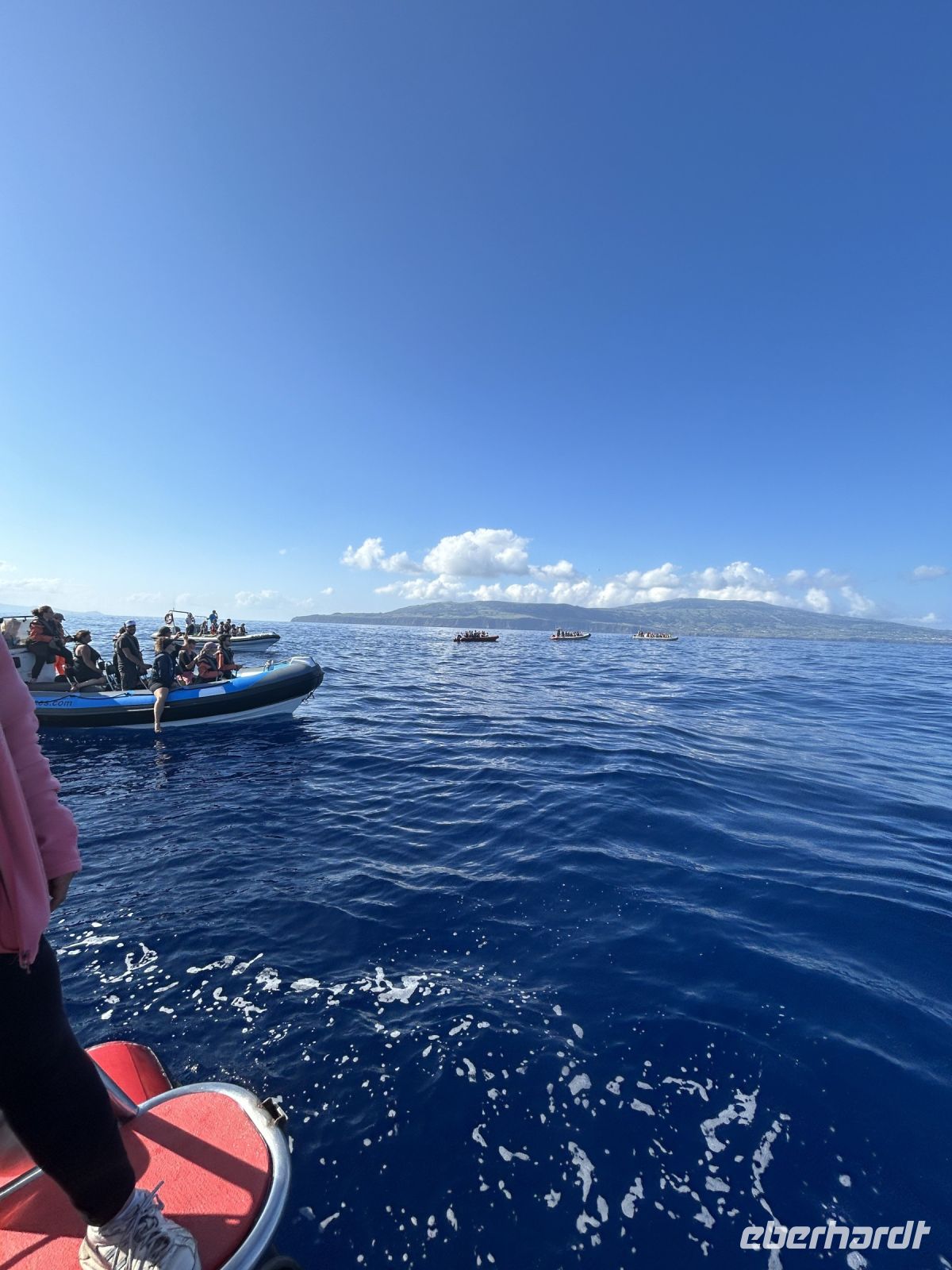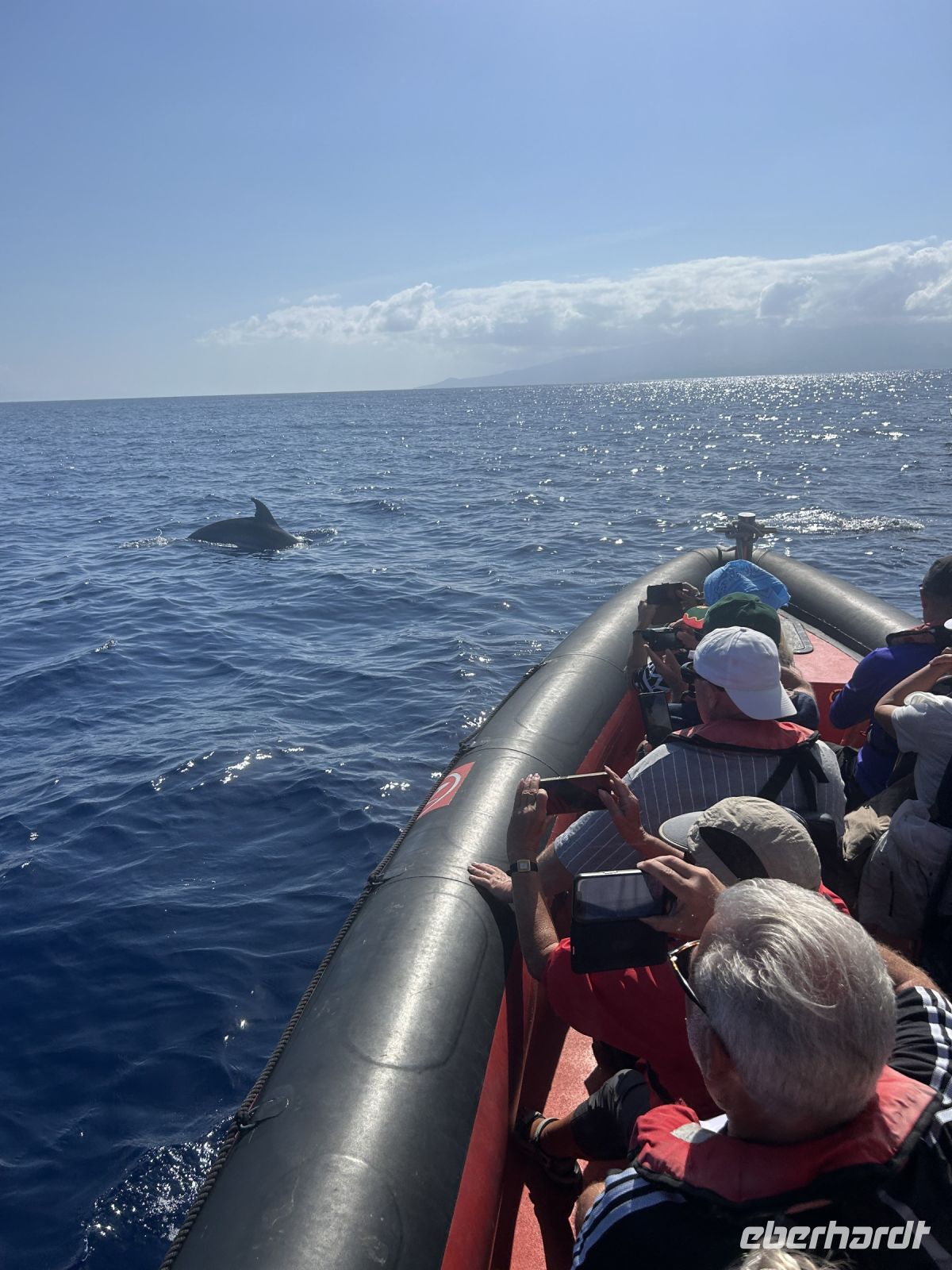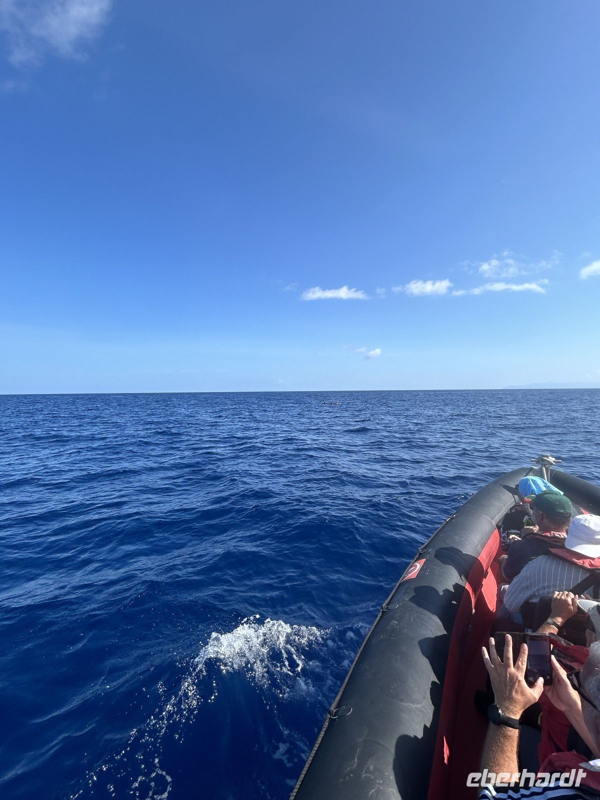Der achte Tag bot uns die Möglichkeit zur Entspannung oder zur Teilnahme an einer Walbeobachtungstour. Und dies ließen sich die allermeisten natürlich nicht entgehen! Die Gewässer um die Azoren sind bekannt für ihre reiche Meeresfauna, und die Sichtung von Walen und Delfinen ist ein unvergessliches Erlebnis. Etwas Geduld ist schon erforderlich, denn zunächst sind die Aufenthaltsorte ausfindig zu machen. Dafür gab es schon früher „Späher“, die am Hang in einem Häuschen sitzen und das Meer beobachten und nach Wal-Fontänen Ausschau halten. Wir fuhren mit einem schnellen Motorboot und folgten den Funkanweisungen des Spähers. Die Wale waren schneller als wir und tauchten dann wieder ab, doch einen Flossenschlag konnten wir auf dem Foto festhalten. Dafür hatten wir umso mehr Freude mit zahlreichen Delfinen rund ums Boot. Ganze Delfinfamilien begleiteten uns. Was für ein herzerfüllendes Erlebnis!