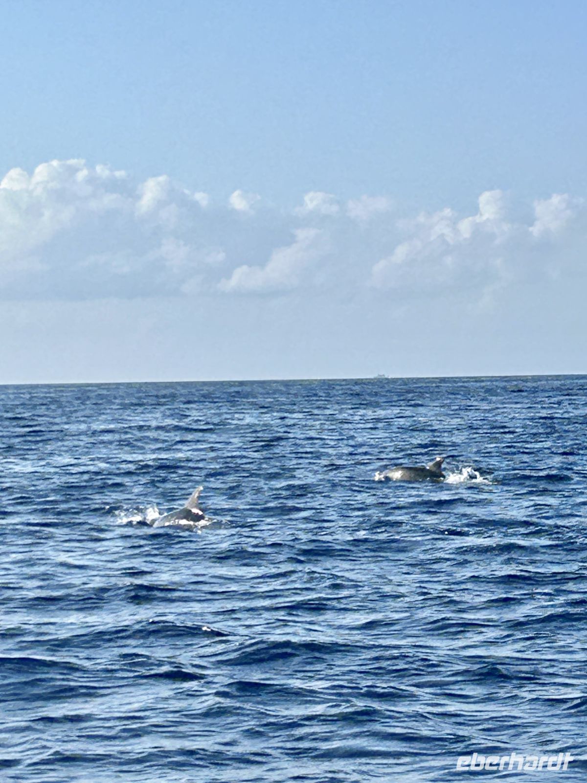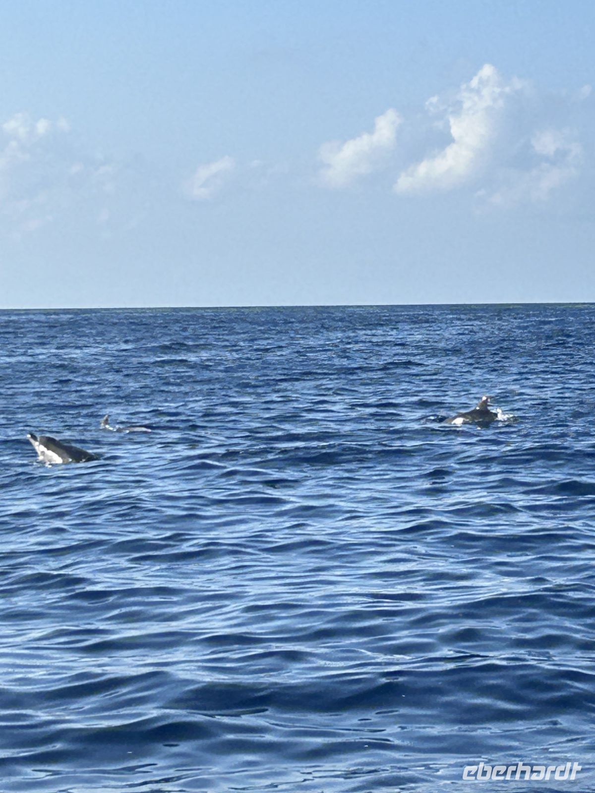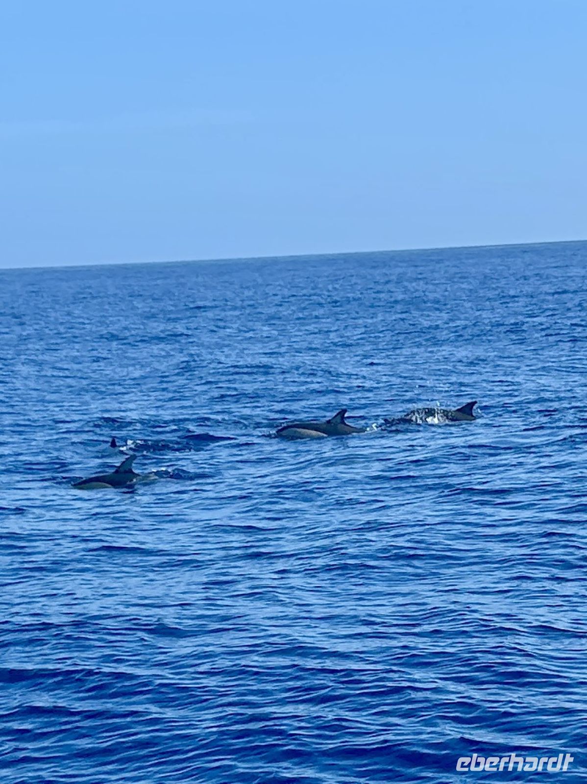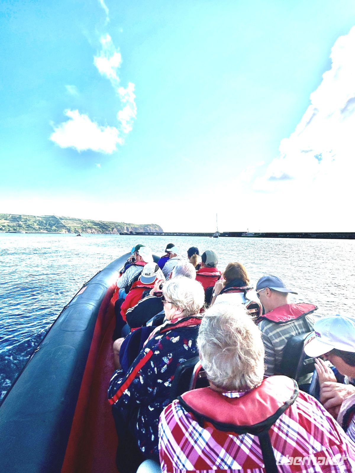 Der achte Tag bot uns die Möglichkeit zur Entspannung oder zur Teilnahme an einer Walbeobachtungstour. Und dies ließen sich die allermeisten natürlich nicht entgehen! Die Gewässer um die Azoren sind bekannt für ihre reiche Meeresfauna, und die Sichtung von Walen und Delfinen ist ein unvergessliches Erlebnis. Etwas Geduld ist schon erforderlich, denn zunächst sind die Aufenthaltsorte ausfindig zu machen. Dafür gab es schon früher „Späher“, die am Hang in einem Häuschen sitzen und das Meer beobachten und nach Wal-Fontänen Ausschau halten. Wir fuhren mit einem schnellen Motorboot und folgten den Funkanweisungen des Spähers. Die Wale waren schneller als wir und tauchten dann wieder ab, doch einen Flossenschlag konnten wir auf dem Foto festhalten. Dafür hatten wir umso mehr Freude mit zahlreichen Delfinen rund ums Boot. Ganze Delfinfamilien begleiteten uns. Was für ein herzerfüllendes Erlebnis!