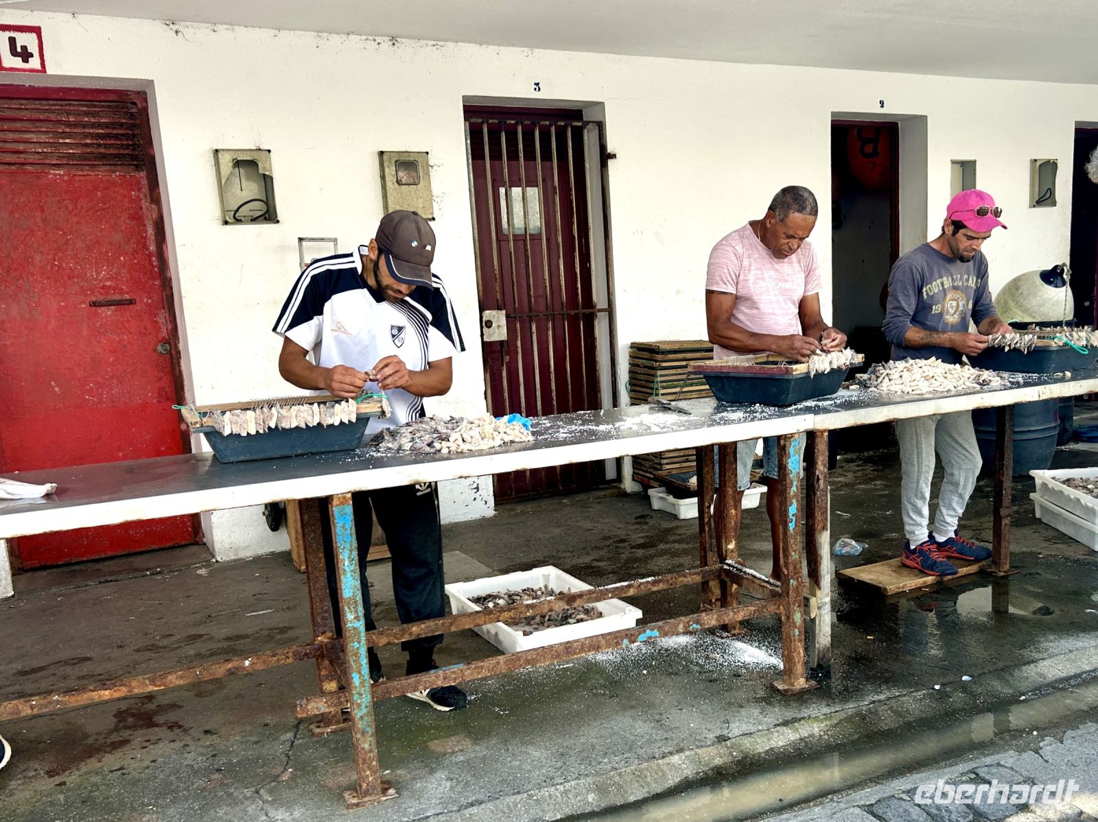 Am nächsten Tag stoppten wir kurz vor Lagoa und spazierten entspannt auf der Promenade in den Ort bis zum Fischereihafen. Einige wenige Fischer waren noch mit Arbeiten an Land beschäftigt, sie erstellten Köder für die nächste Ausfahrt. Die bunten Fischerboote waren schon entladen.