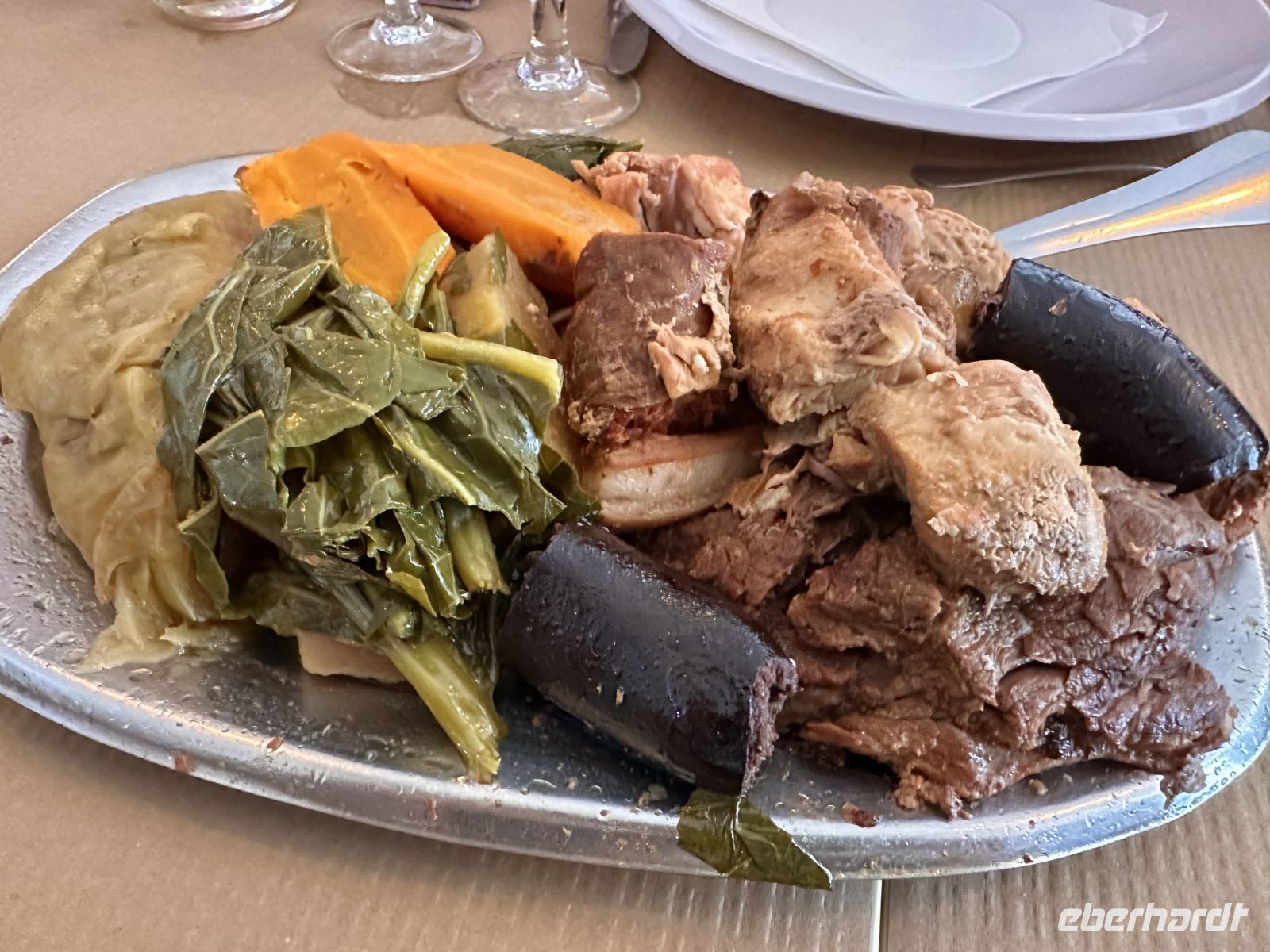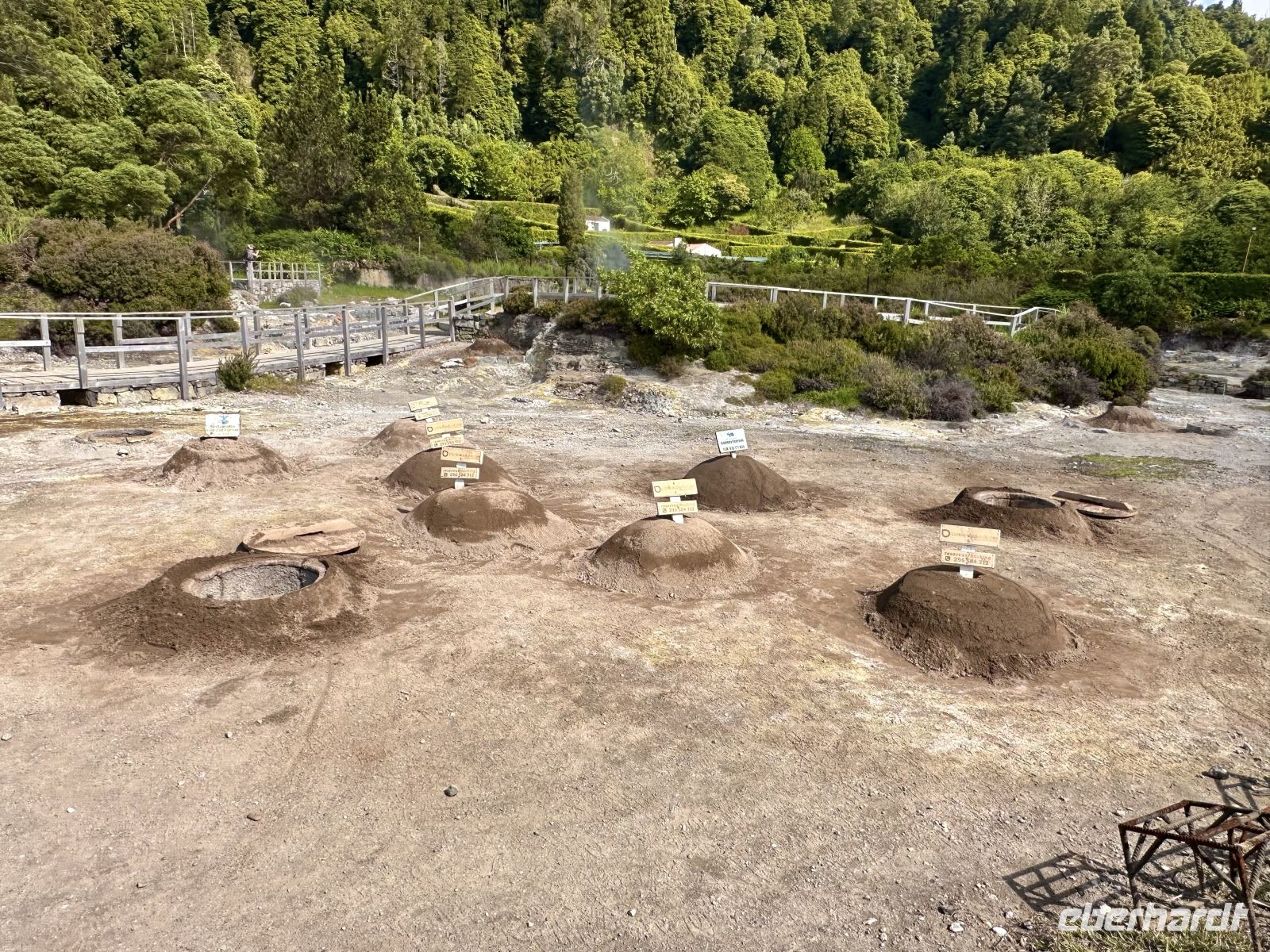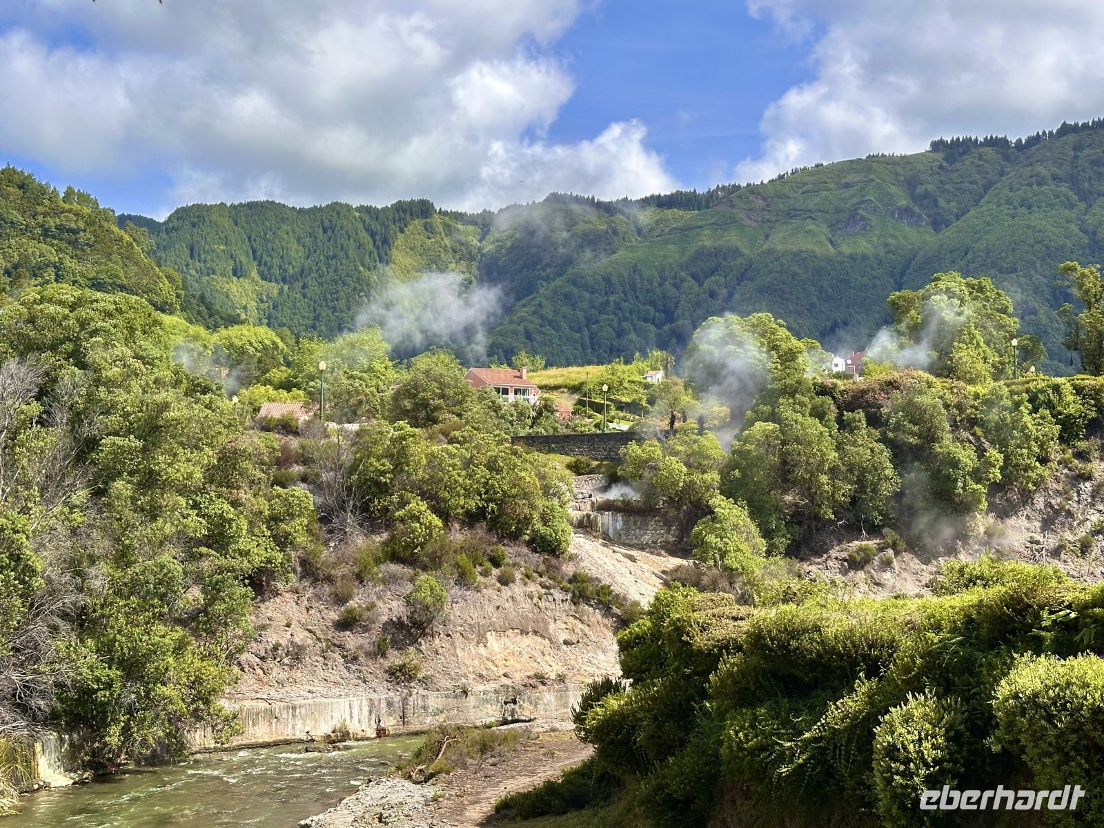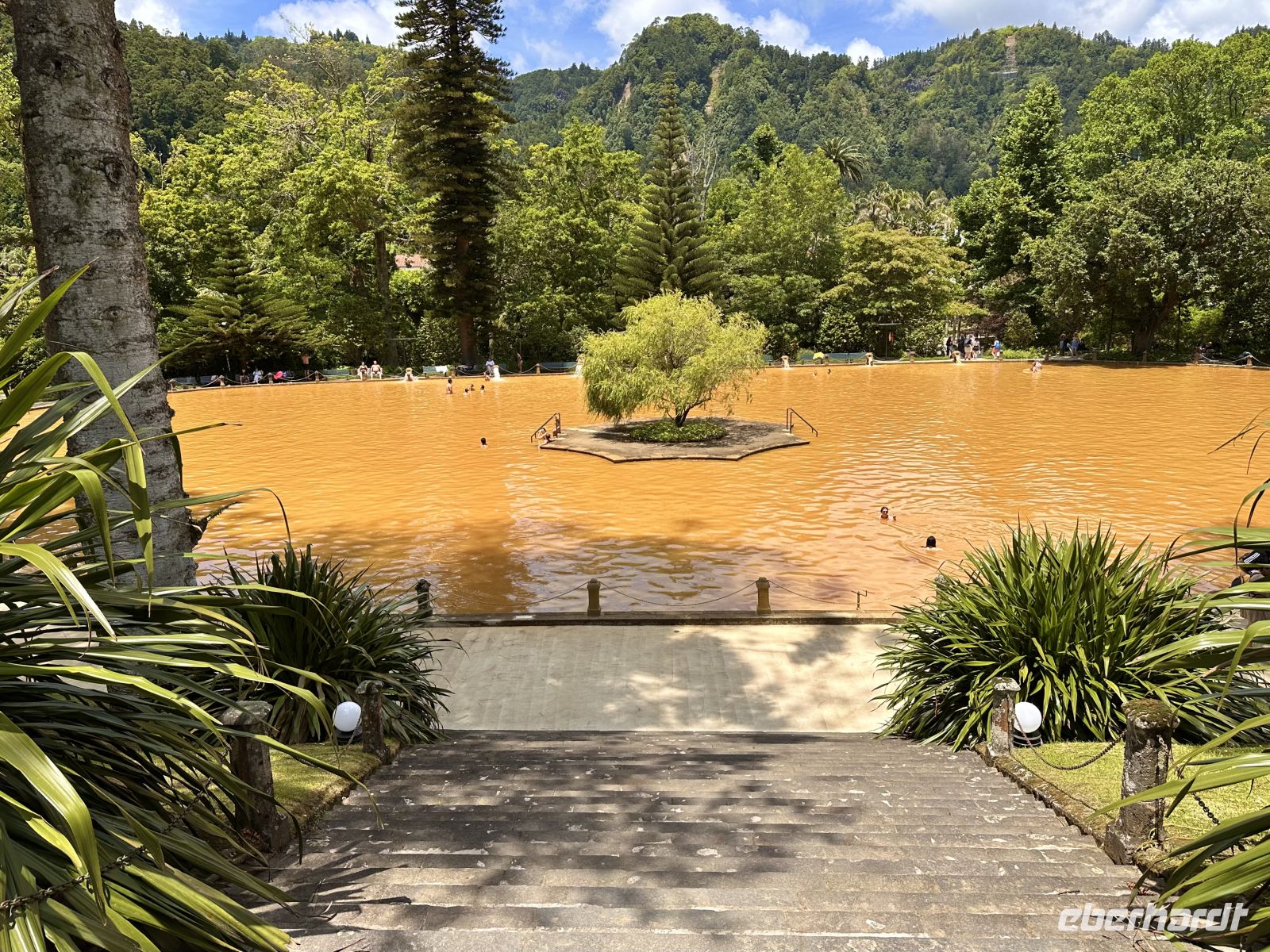 Gleich zu Beginn unserer Reise werden wir heute eines der Highlights der Azoren erleben. Wir fahren zusammen mit unserem örtlichen Reiseleiter nach Furnas zu den dampfenden heißen Quellen. Auf dem Weg dahin nutzen wir die Möglichkeit bei schönen Aussichtspunkten halt zu machen, um die ersten Urlaubsfotos zu schiessen. In Furnas angekommen können wir die dampfenden und brodelnden Quellen beobachten und ganz nebenbei auch schon unser Mittagessen sehen. Die Gastronomen der Insel machen sich die heißen Quellen zu Nutze und garen in dem heißen Dampf verschiedene Gerichte. Unter anderem auch den „Cozido das Furnas“. Die ist ein Inselgericht bei dem verschiedene Fleisch- und Wurstsorten zusammen mit verschiedenem Gemüse 6-7 Stunden im Topf in ein Erdloch gelassen wird, um im Dampf zu garen. Nach unserer Tour entlang der Quellen haben wir bei unserem Mittagessen die Gelegenheit dieses traditionelle Inselgericht zu genießen und sehr positiv überrascht. Gut gestärkt verbringen wir den Nachmittag im nahegelegenen Park Terra Nostra. Die Besonderheit der Parkanlage ist das riesige Thermalbecken mit seinem 38grad warmen eisenhaltigen Wasser. Auf unserer Erkundungstour durch die schöne Parkanlage entdecken wir viele schöne und interessante botanische Blickfänge, die wir so auch gern in unseren heimischen Gärten hätten. Auf dem Weg zurück nach Ponta Delgada runden wir unser Naturprogramm noch mit etwas besonderem ab. Wir besuchen das einzige europäische Teeanbaugebiet. Wir streifen die Teeplantagen und besichtigen eine kleine urige Fabrik, in der der Tee von den angrenzenden Plantagen und Terrassenfeldern verarbeitet wird. Eine sehr interessante Sache die man so halt nur auf den Azoren erleben kann.