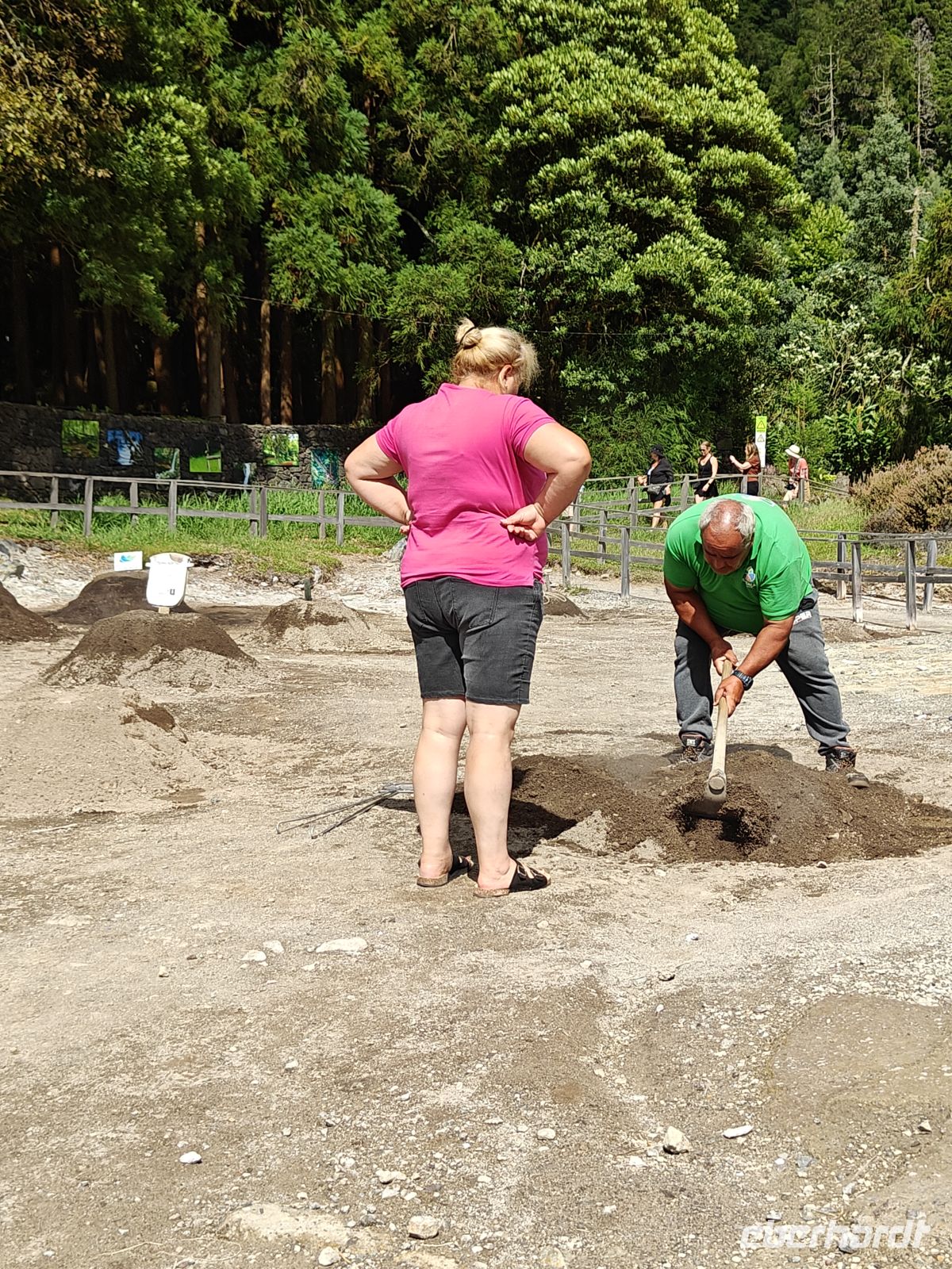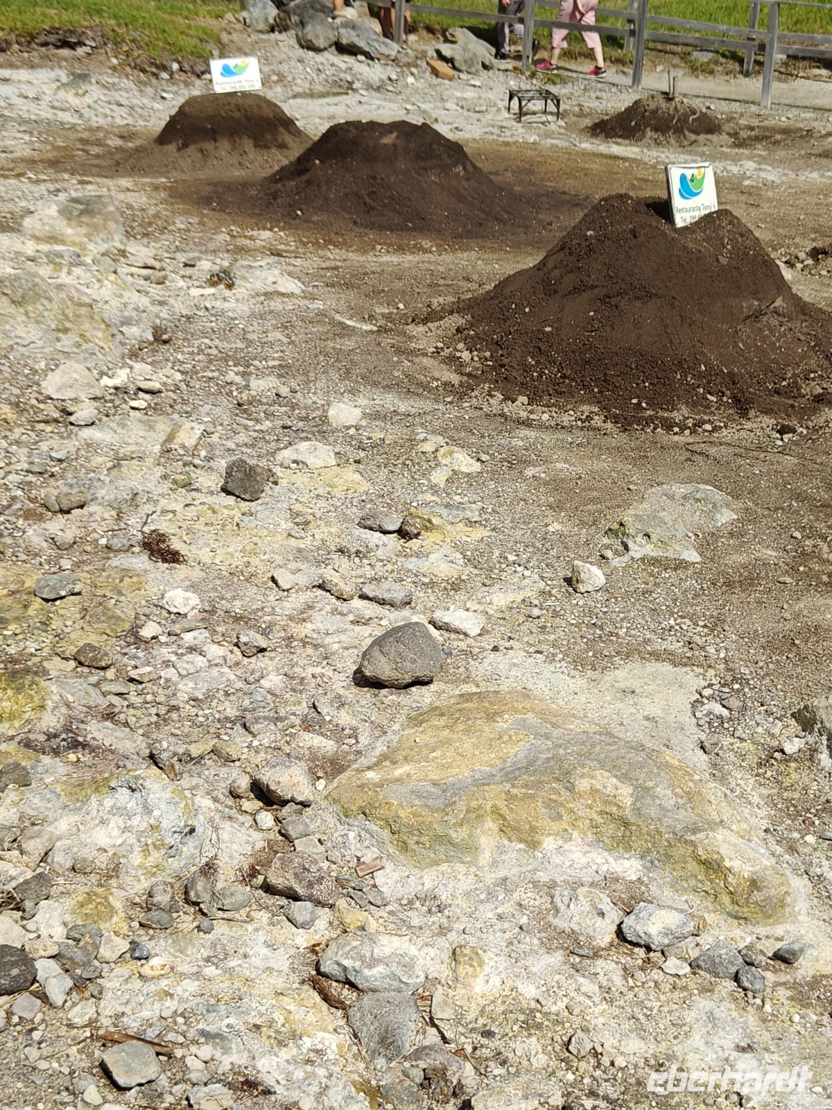 Schon bald grüßt uns die Schwefelluft der schwelenden unterirdischen Vulkanherde. Seit langem werden sie als Kochlöcher genutzt: der große Suppentopf wird mit Kartoffeln, Kohl, Gemüse und verschiedenen Würsten und Fleischsorten vollgestopft, in einen Sack gehüllt, und dann 6 Stunden im Kochloch gegart. Es blubbert überall! In der Erde, im Topf. So schmort unser Mittagessen im Grabhügel für Suppentöpfe und hinterher tun wir uns gütlich!