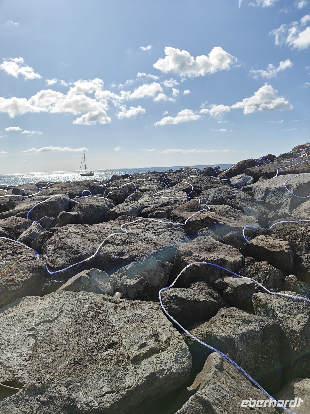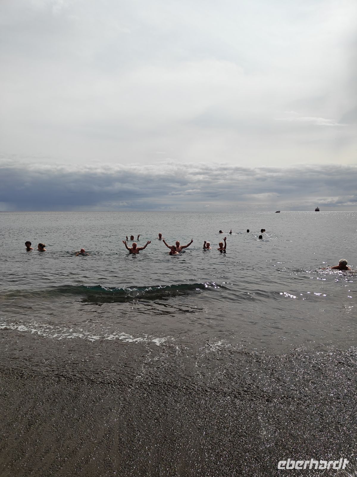 Also zunächst Kaffeepause im Ort und dann Rundgang. Sehr hügelig hier! Da das Wetter so prächtig ist gehen die meisten Gästen wieder schwimmen und genießen eine wohlverdiente Pause am wenig besuchten Strand.
