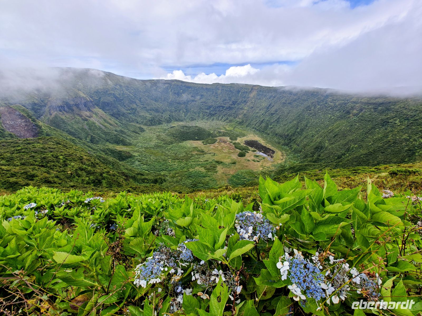 Frederick, unser örtlicher Reiseleiter lebt fast sein ganzes Leben lang auf dieser schönen Insel. Ursprünglich aus Norddeutschland, kam er als Kleinkind mit seinen Eltern hierher, und spricht somit perfektes Deutsch – und ist doch ein Insulaner! Als erstes zeigt er uns Água de Pao, das Dorf aus dem er stammt. Hortensienköpfe in sattem Blau säumen dieses hübsche Dörfchen.
