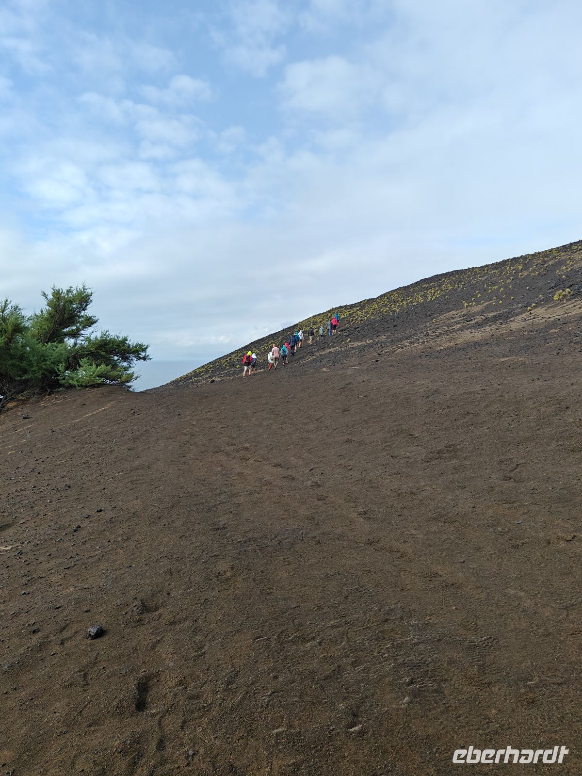 Weiter geht’s nach Varadouro. Ein kleines Pizzarestaurant gibt’s dort, und sonst sind wir umgeben von wilden Felsen, Lavagestein und einem herrlichen Naturschwimmbad. Heute jedoch kein Schwimmen, denn es geht weiter nach Caldeira, der „Vulkanschüssel“. Heute mal kein Schnaps, dafür zeigt uns Frederick dass die wilden Ingwerlilien, die sich rasant überall ausbreiten, einen köstlichen süßen Saft im Stängel haben – auch lecker.