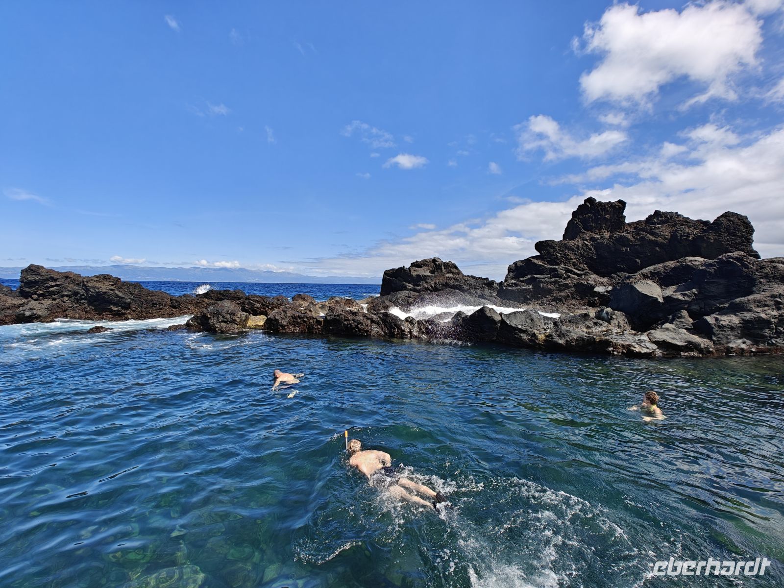 Auch an diesem Tag macht das Wetter mit und wir fahren nach Biscoitos zum letzten Schwimmen im Naturschwimmbad in den Felsen.