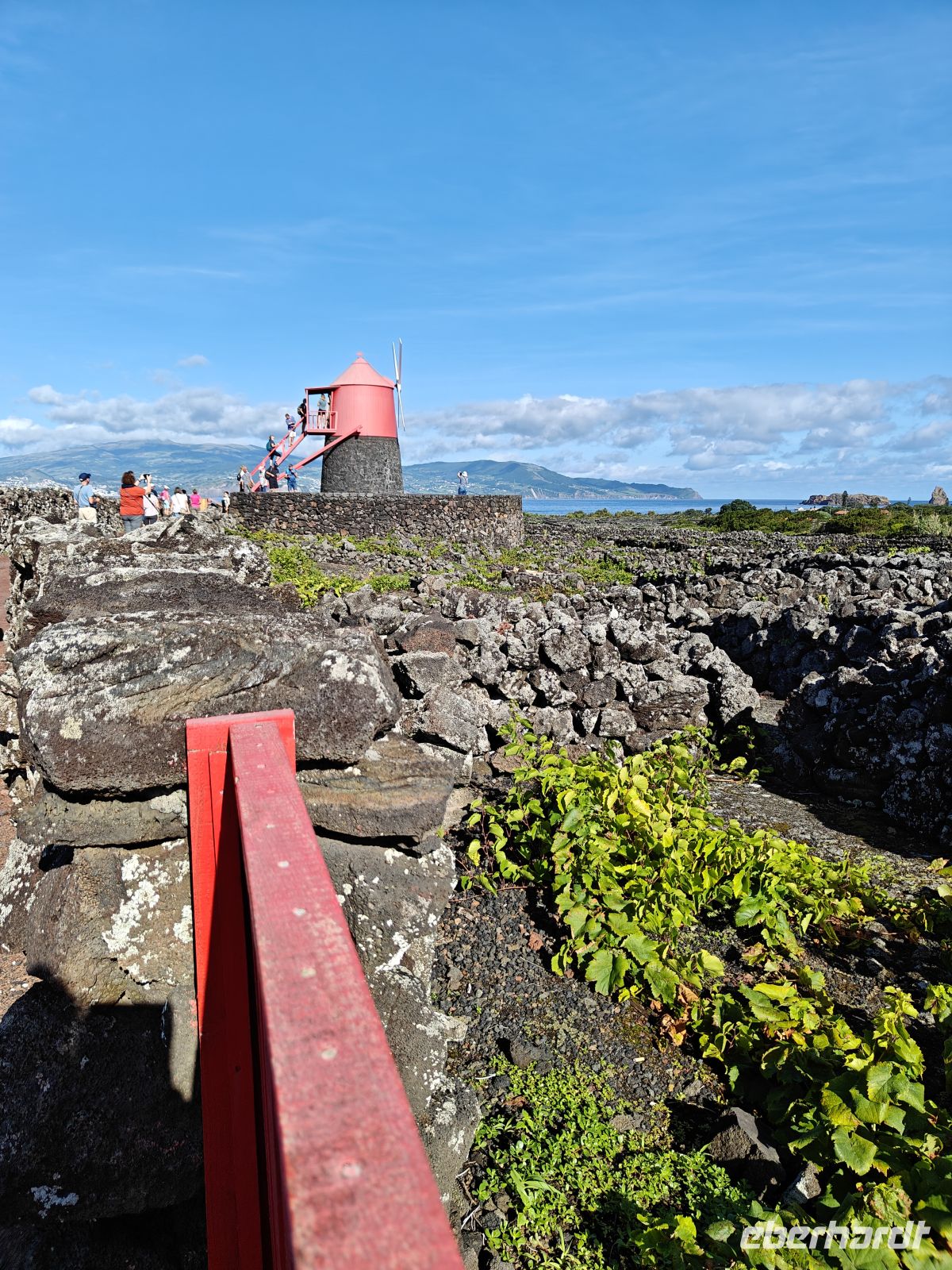 Eine rote Mühle (eisenhaltige Farbe die gegen Regen und Wetter schützt) leuchtet aus der Ferne und oben gibt’s Weintrauben zu kaufen.