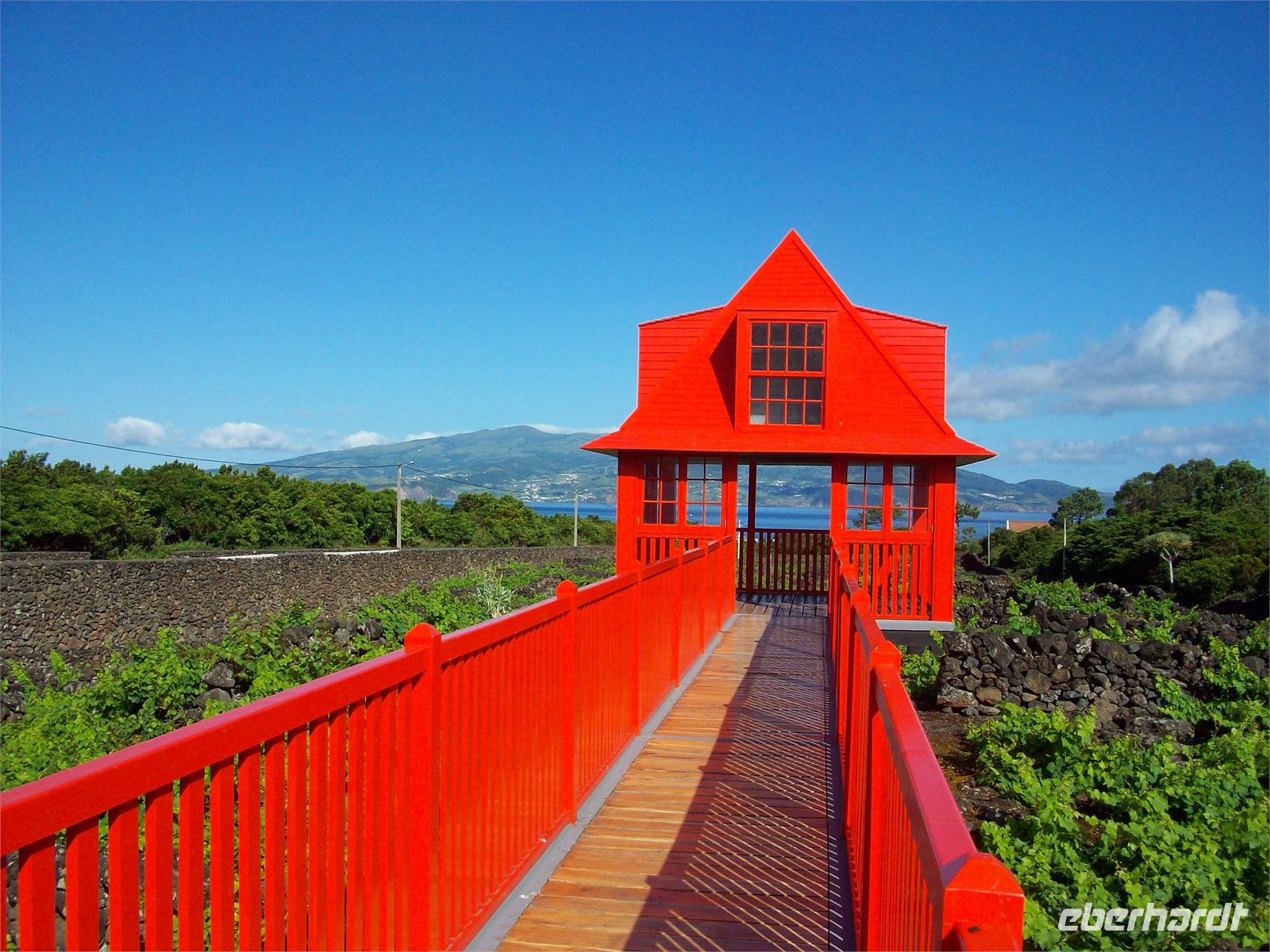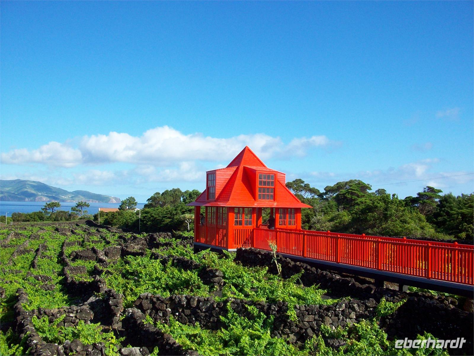 Als nächstes machen wir Stopp in Porto Cachorro. Übersetzt heißt die Stadt "Kleiner Hund". Dieser Name stammt von einer Felsformation am Meer, welche die Form eines Hundekopfes hat. Ich hab hierzu aber noch ein kleines Geheimnis, aber niemanden weiter verraten: Die Ohren des Hundes sind nachträglich erst angeklebt worden! Tststs, die Azoreaner! Ein weiters Naturschauspiel des Ortes ist die Küste mit ihrem wundersamen Lava-Labyrinth von Höhlen, Bögen, Brücken, Schluchten und Becken. Und noch etwas Besonderes gibt es hier, nicht nur das man den leckeren Wein und Likör von Pico kosten kann, nein man kann hier sogar lustige Schürzen mit Kühen erstehen. Da kann selbst ich nicht widerstehen! Pico ist aber nicht nur bekannt für seinen Wein sondern auch für den Walfang. Seit 1984 darf auf den azorischen Insel zwar kein Wal mehr gefangen werden, aber man hat noch immer die Chance eine ehemalige Walverabreitungsfabrik zu begutachten. Dies tun wir in Sao Roque do Pico im "Museu Instudrial da Baleira". Hier lernen wir die einzelnen Schritte der Verwertung kennen und auch welche Produkte daraus hergestellt wurden. Nach einem solchen Erlebnis brauchen wir erstmal einen starken Kaffee! Wieder fit und munter geht unsere Fahrt über das Landesinnere hinweg in den Süden der Insel, nach Lajes do Pico. Und hier haben wir die Möglichkeit