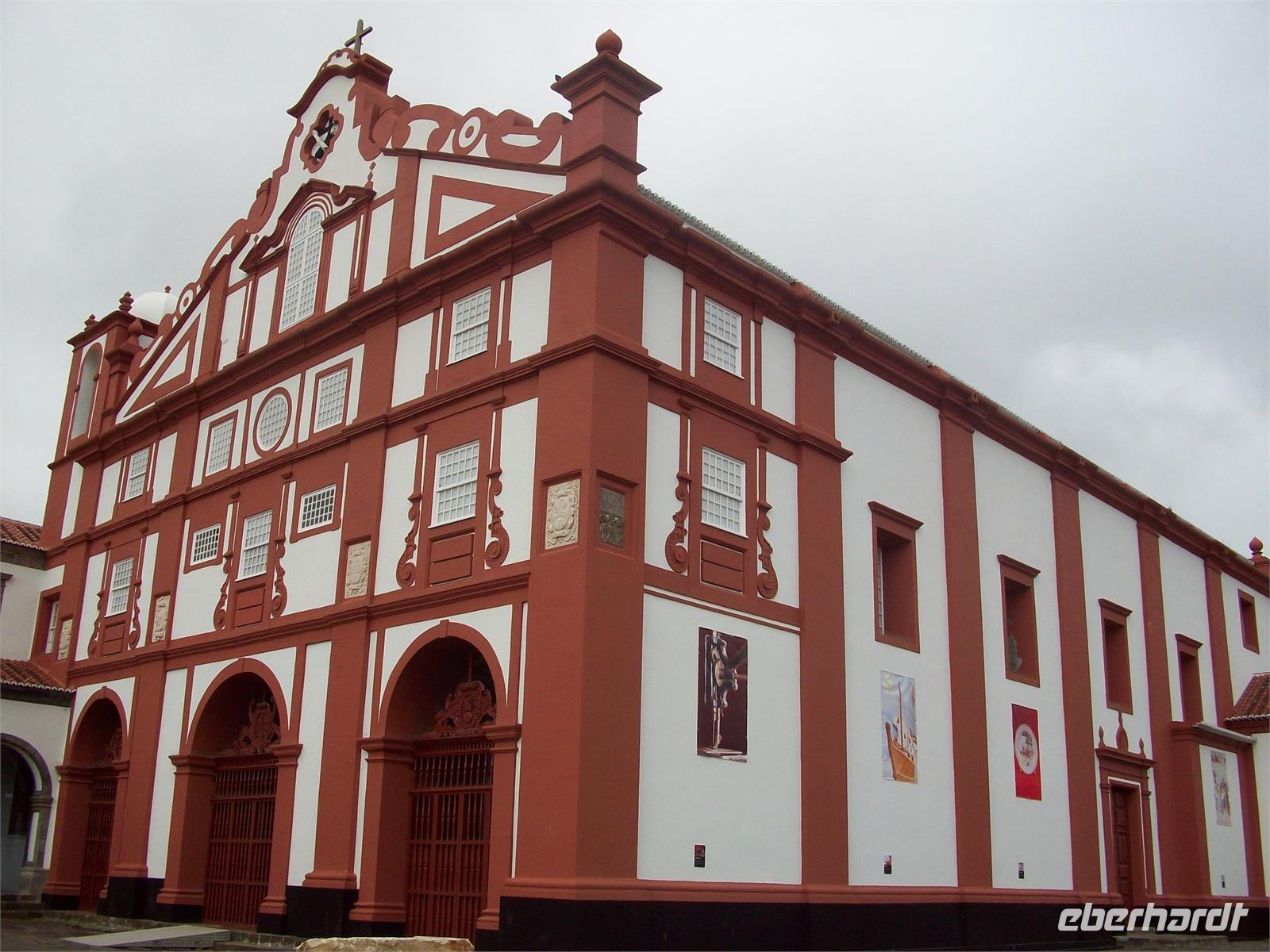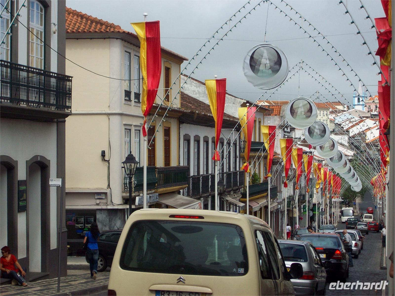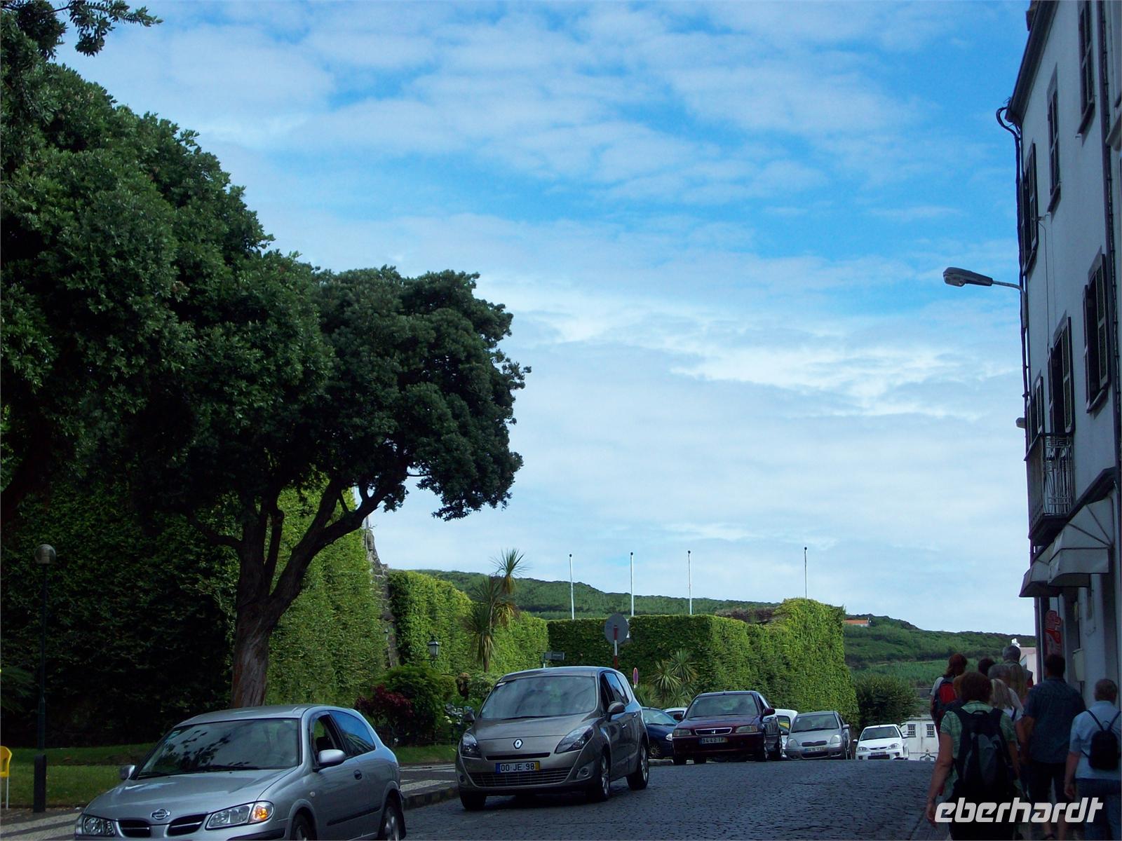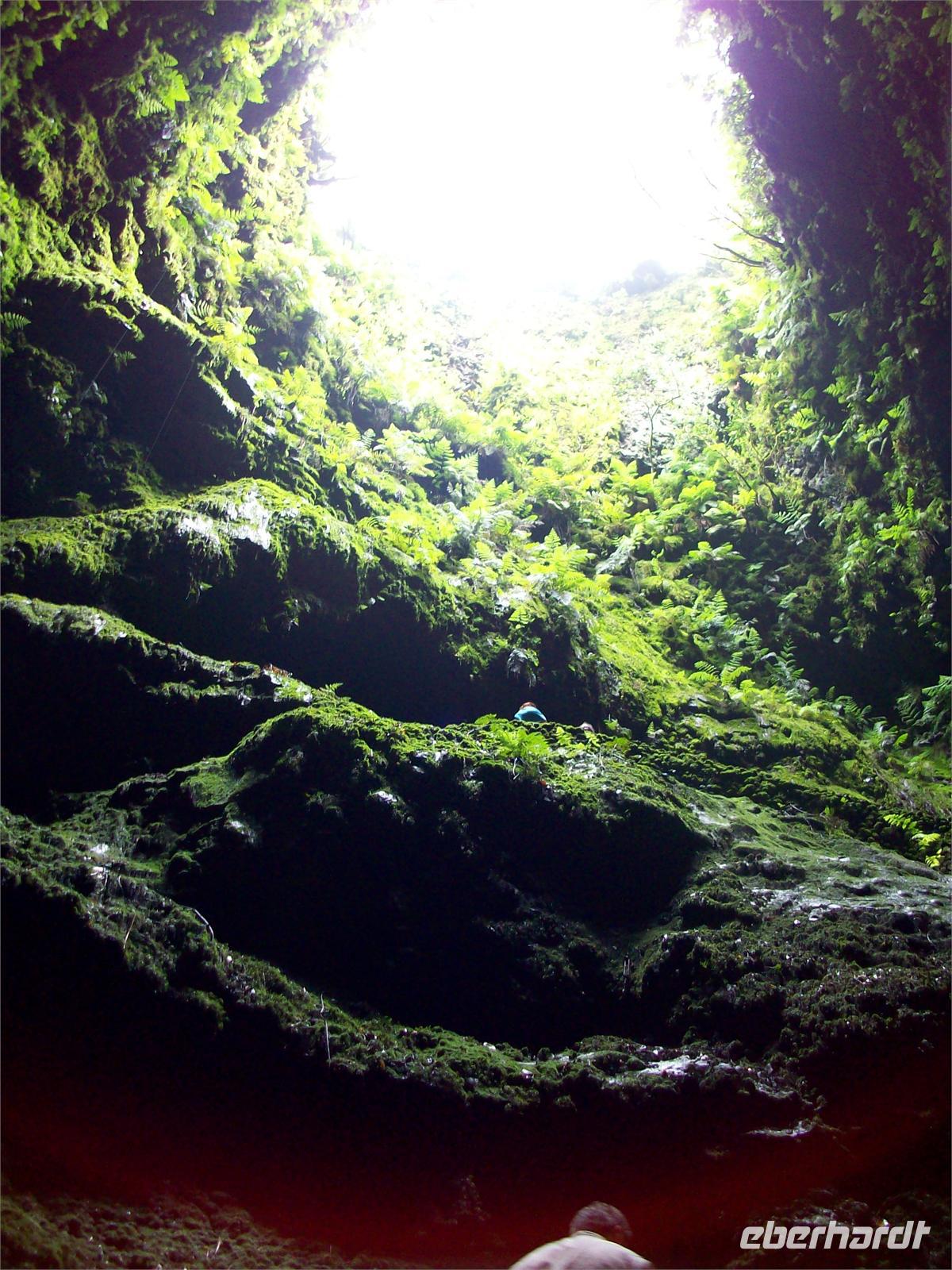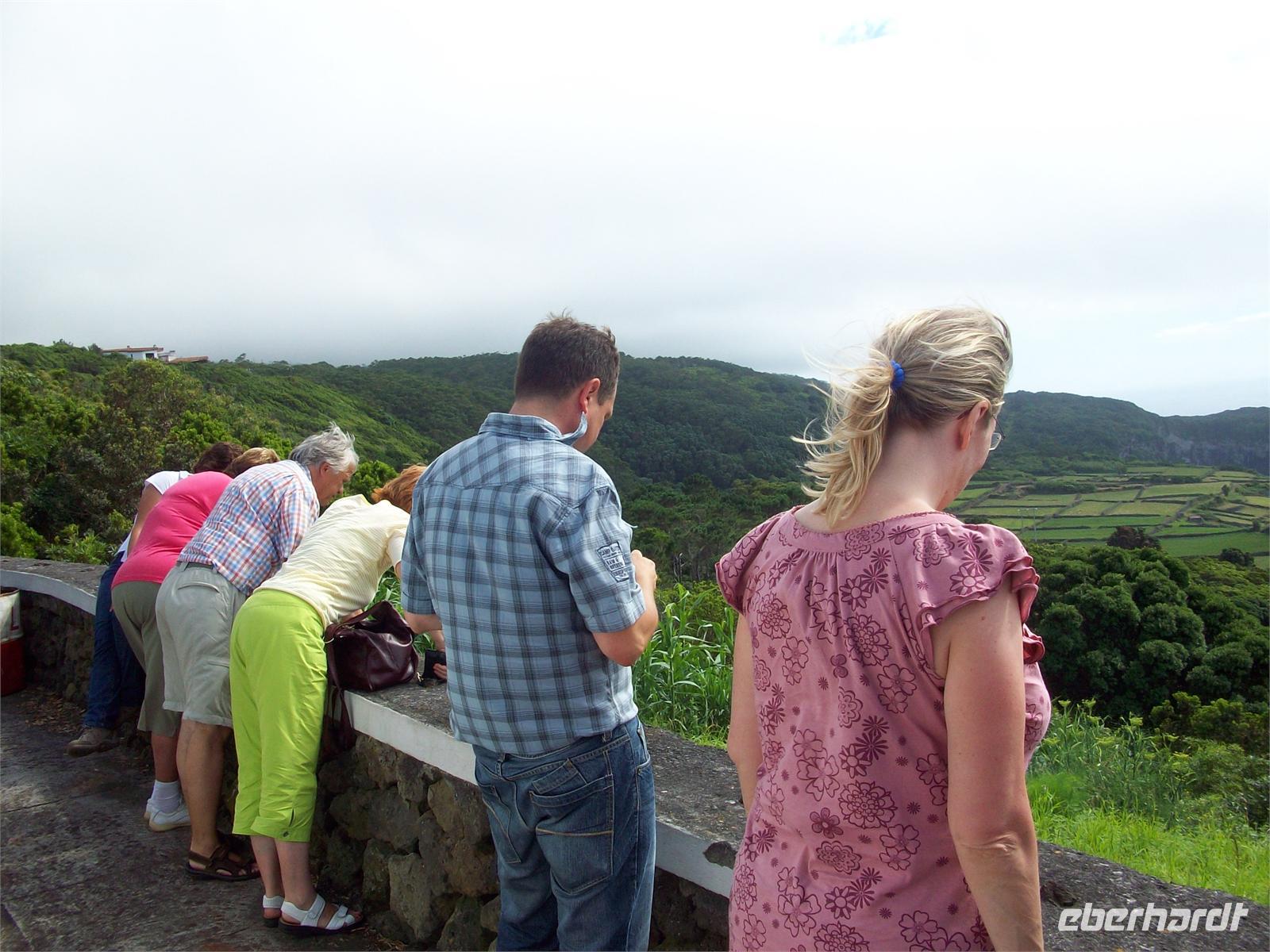 Sao Sebastiao, natürlich nicht ohne so einige Aussichtpunkt mitzunehmen, wie zum Beispiel der Blick auf die "Ziegeninsel" - eine Insel wo einmal die Ziegen grasten. Dies ist aber nicht das besondere. Das einzigartige ist, dass hier ein Tektonischer Riss in der Insel ist und es heute dadurch zwei anstatt einen Felsen gibt. Da haben sich die Kontinente glatt etwas verschoben! In der Stadt Sao Sebastiao angekommen haben wir uns erst einmal die Kirche angeschaut die für ihre Fresken bekannt ist. Danach haben wir etwas über das traditionelle Heiligengeistfest erfahren und uns die wundervoll verzierte Heiligengeistkapelle angeschaut. Nach einer kleinen Pause für eigene Erkundungen ging unsere Fahrt weiter nach Praia da Vitoria. Erstmal haben wir uns die noch recht junge Stadt von oben angeschaut und dann bei eigenen Erkundungen die Schönheiten der kleinen Stadt kennen gelernt. Weiter ging unsere Fahrt über einen Bergkamm zur Höhle Algar do Carvao. Diese Höhle ist etwas ganz besonderes denn sie geht nicht Vertikal im Berg entlang sondern Horizontal. Treppab, Treppauf erkunden wir die wunderschöne Höhle. Beeindruckend sind die Abdrücke, welche durch die Lavaströme entstanden sind und auch das Loch ganz oben in der Höhle, so braucht man nicht