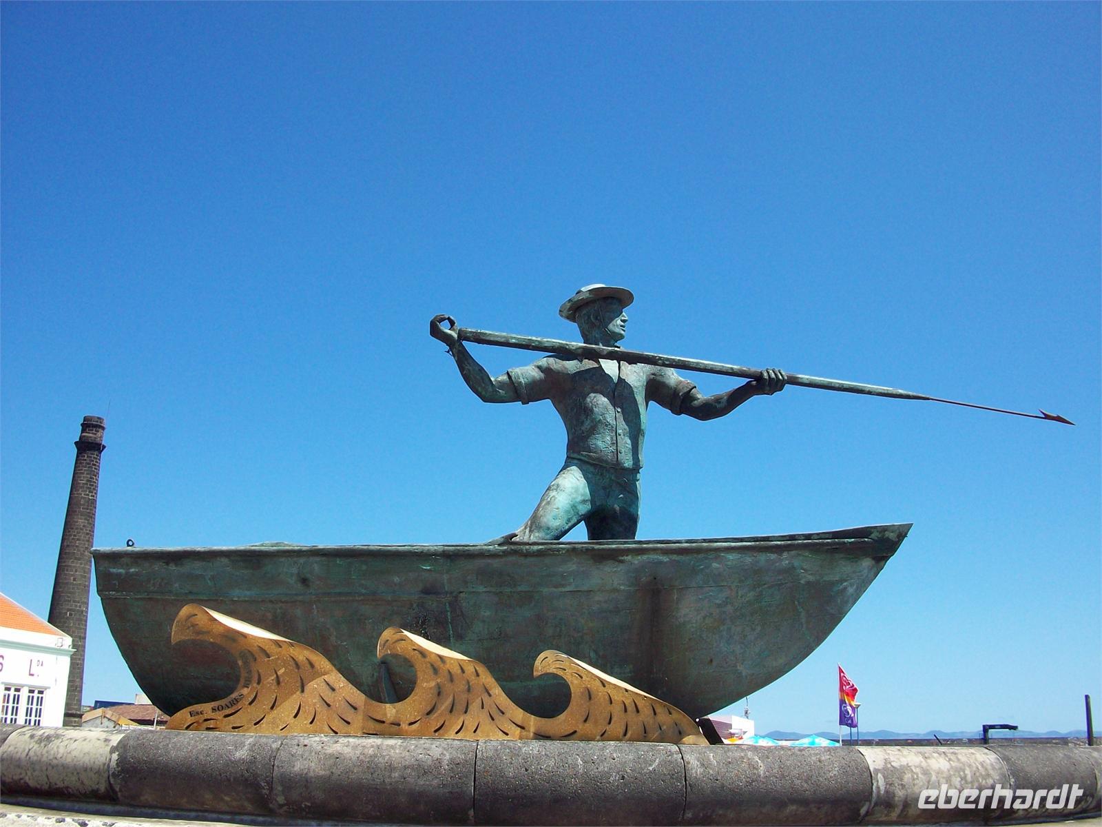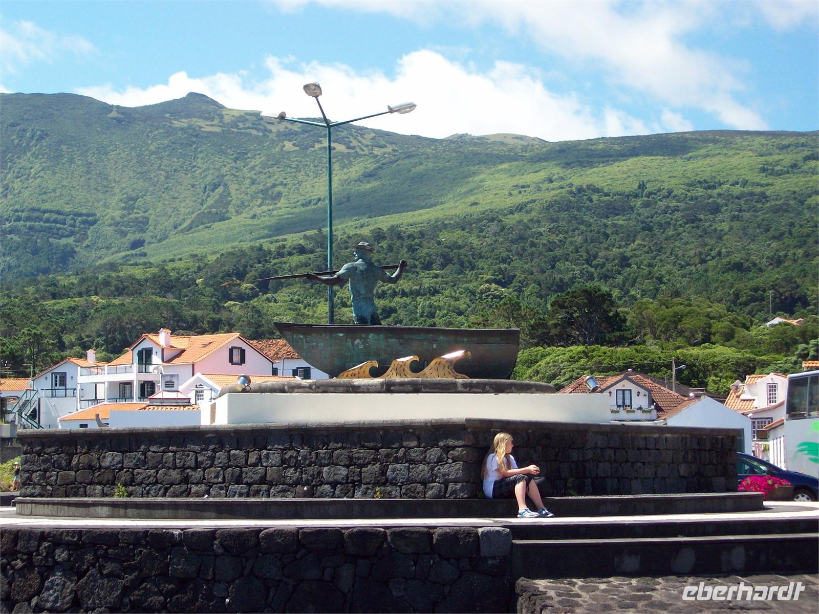 uns richtig zu Stärken, denn wir haben noch ein volles Programm. Bei Sonnenschein lassen wir uns den leckeren Fisch richtig gut schmecken. Gut gestärkt geht unsere Erkundungstour weiter und jetzt geht es in das "Museu dos Baleiros" - Walmuseum. Hier bekommen wir von Manuela die Schritte des Walfangs genaustens erklärt. Man muss schon sagen, ein echter Knochenjob! Außerdem können wir uns anschauen, welche Kunstwerke aus Walprodukten, wie Zähnen und Knochen, hergestellt wurden. Nach diesem tiefen Einblick in die Bedeutung des Walfangs auf den Azoren, sieht man es plötzlich mit ganz anderen Augen. Zum Abschluss des Tages machen wir noch einen kleinen Stopp auf dem Weg zum Hafen von Madalena. Denn wir fahren vorbei am wohl größten Weinanbaugebiet der Azoren. Hier mit dem Pico im Hintergrund, natürlich mal wieder ohne Wolke, entstehen richtige Postkartenbilder. Ein Traum! Am Hafen haben wir dann noch kurz Zeit für ein Eis und dann kommt auch schon unsere Fähre zurück nach Faial. Nun müssen wir schon wieder "Adios Faial" sagen, aber der Abschied wird uns leicht gemacht. Denn neben unserer Fähre fahren Jetski-Fahrer her und zeigen wahre Kunststücke. Zufrieden kommen wir im Hafen von Horta an und lassen anschließend bei einem kühlen Bier oder einem Gin Tonic im Café Sport den Abend ausklingen. Prost!