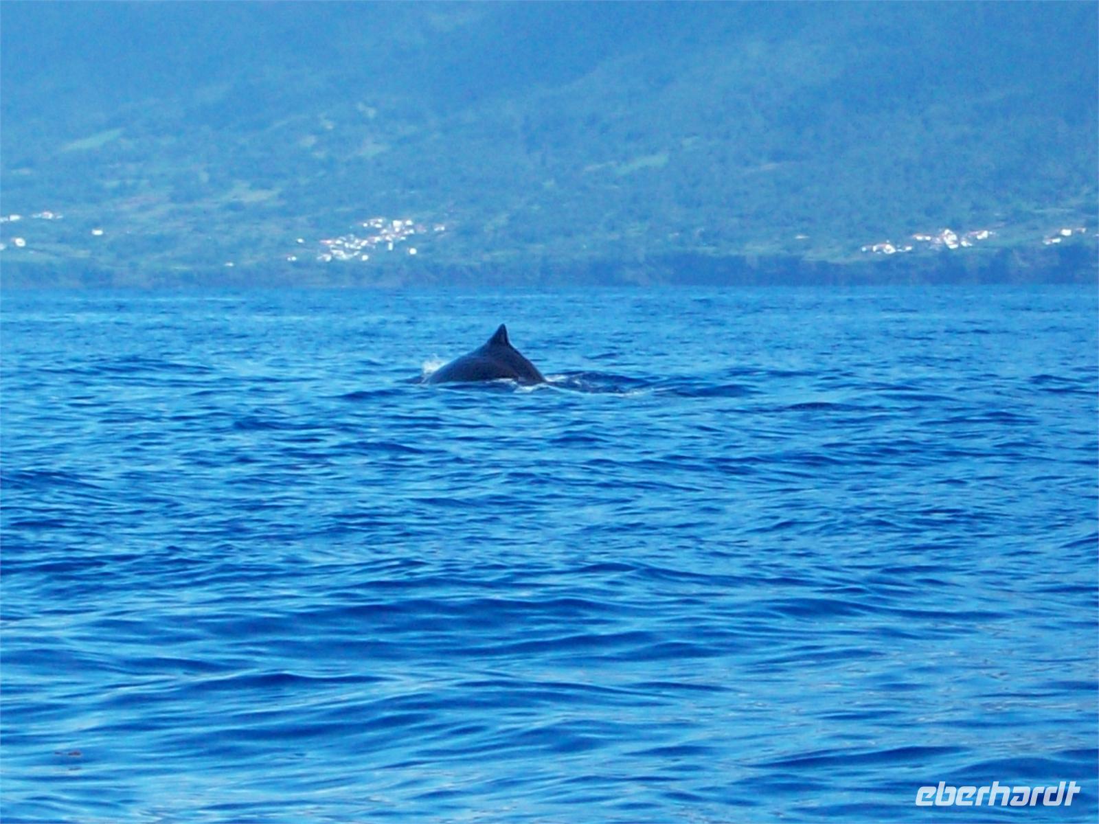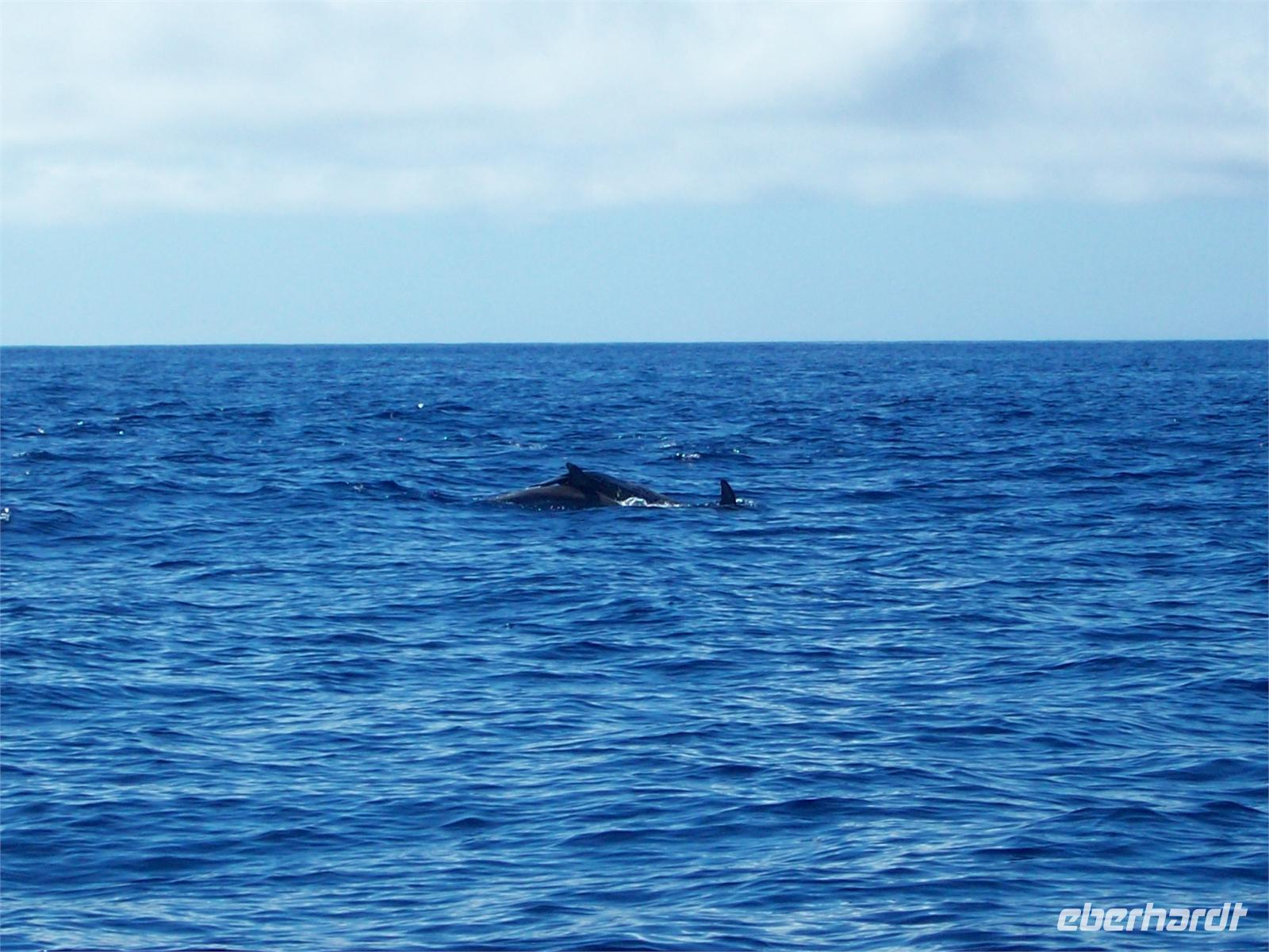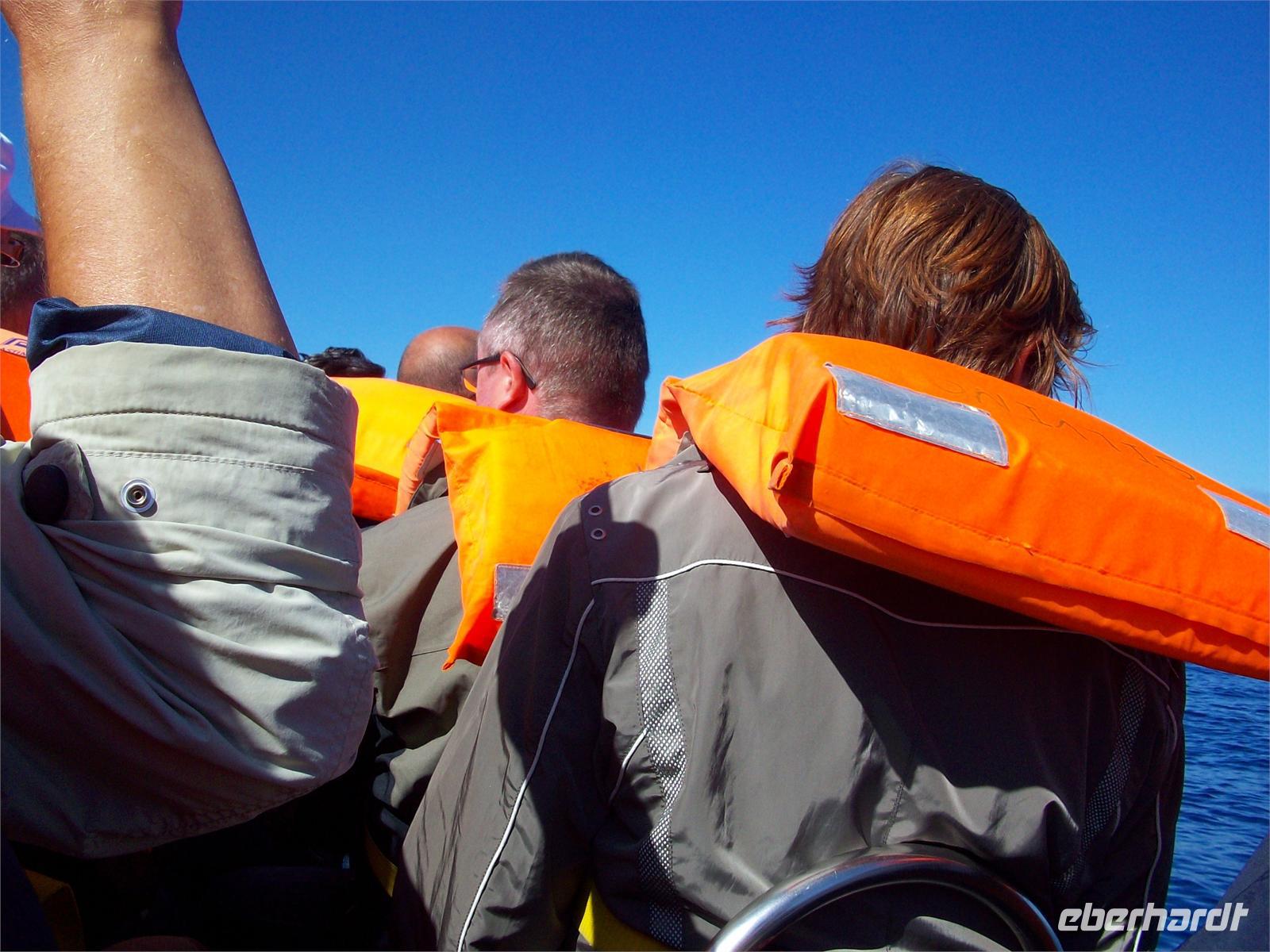 Trotzdem treten wir gespannt und voller Erwartungen pünktlich um halb neun bei "Norberto" an. Nach einer netten Begrüßung durch ihn selbst, werden wir nett von Franz empfangen. Er gibt uns eine kurze Einweisung und Erklärungen, natürlich auf Deutsch, zu unserem wirklich stattfindenden Ausflug. Jetzt wird es erst richtig lustig. Wer möchte erhält eine Jacke, mir geht sie bis zu den Knien und dann gibt's leuchtend orange Schwimmwesten. Jetzt kann kein Gast mehr verloren gehen! Nach dem wir unser Schlauchboot, aber mit festem Boden, besetzt haben geht unsere Fahrt auch schon los. Nach einer über Einstündigen Fahrt zur Südküste Pico's, erreichen wir endlich unser erstes Ziel, ein Pottwal. Wow, es ist wirklich eindrucksvoll, wenn man plötzlich die Schwanzflosse sieht und dann ist der Wal weg. Immer wieder erhält unser