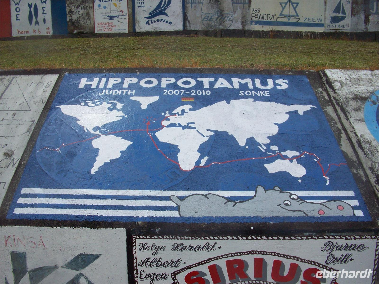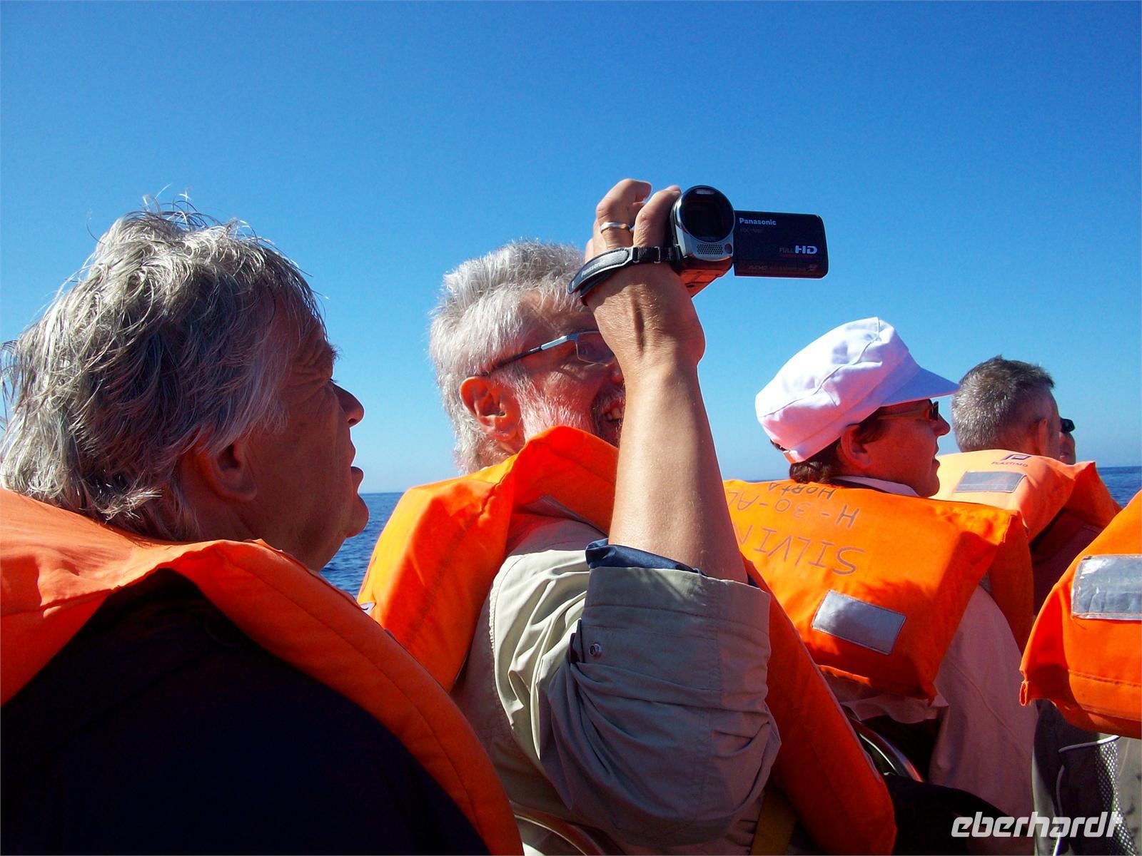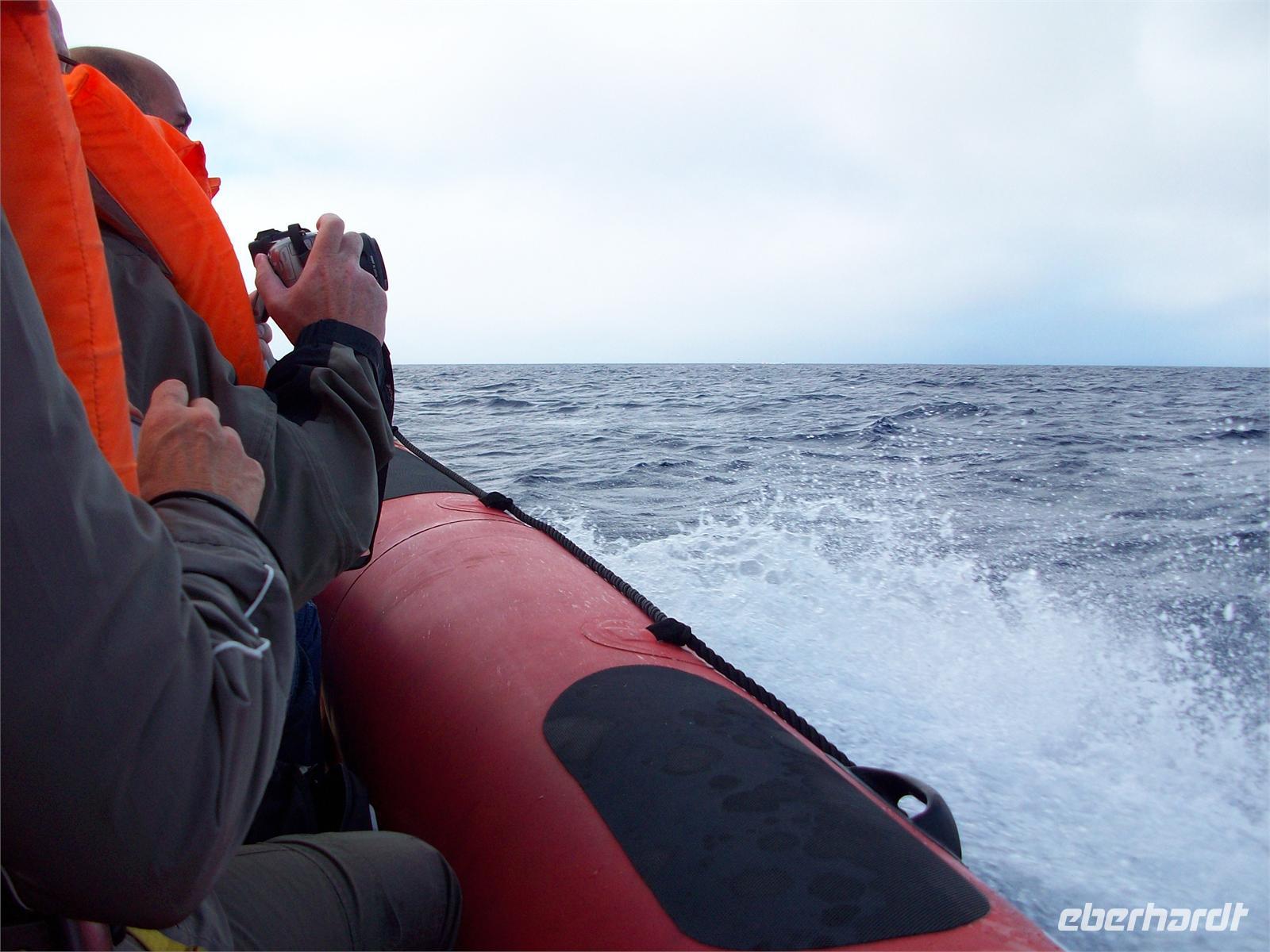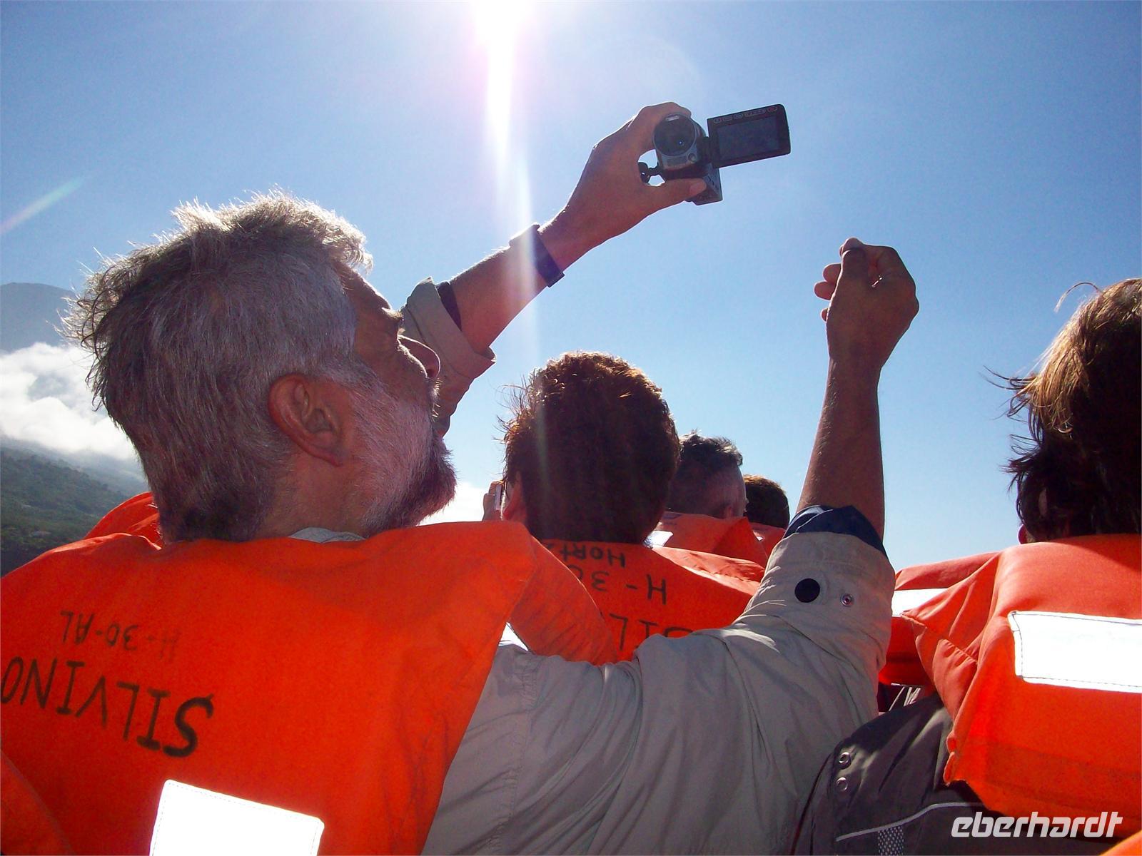 Trotzdem treten wir gespannt und voller Erwartungen pünktlich um halb neun bei "Norberto" an. Nach einer netten Begrüßung durch ihn selbst, werden wir nett von Franz empfangen. Er gibt uns eine kurze Einweisung und Erklärungen, natürlich auf Deutsch, zu unserem wirklich stattfindenden Ausflug. Jetzt wird es erst richtig lustig. Wer möchte erhält eine Jacke, mir geht sie bis zu den Knien und dann gibt's leuchtend orange Schwimmwesten. Jetzt kann kein Gast mehr verloren gehen! Nach dem wir unser Schlauchboot, aber mit festem Boden, besetzt haben geht unsere Fahrt auch schon los. Nach einer über Einstündigen Fahrt zur Südküste Pico's, erreichen wir endlich unser erstes Ziel, ein Pottwal. Wow, es ist wirklich eindrucksvoll, wenn man plötzlich die Schwanzflosse sieht und dann ist der Wal weg. Immer wieder erhält unser