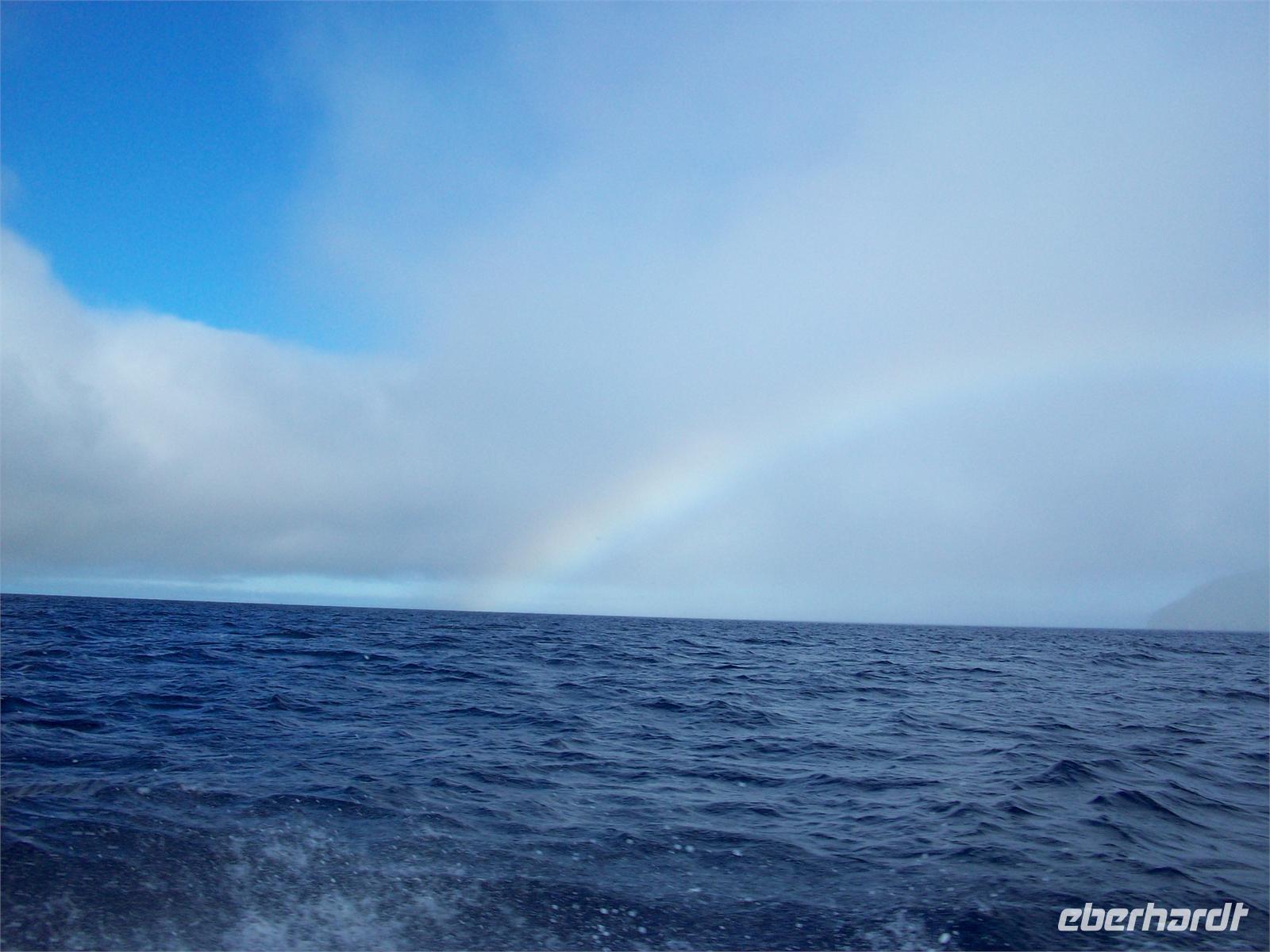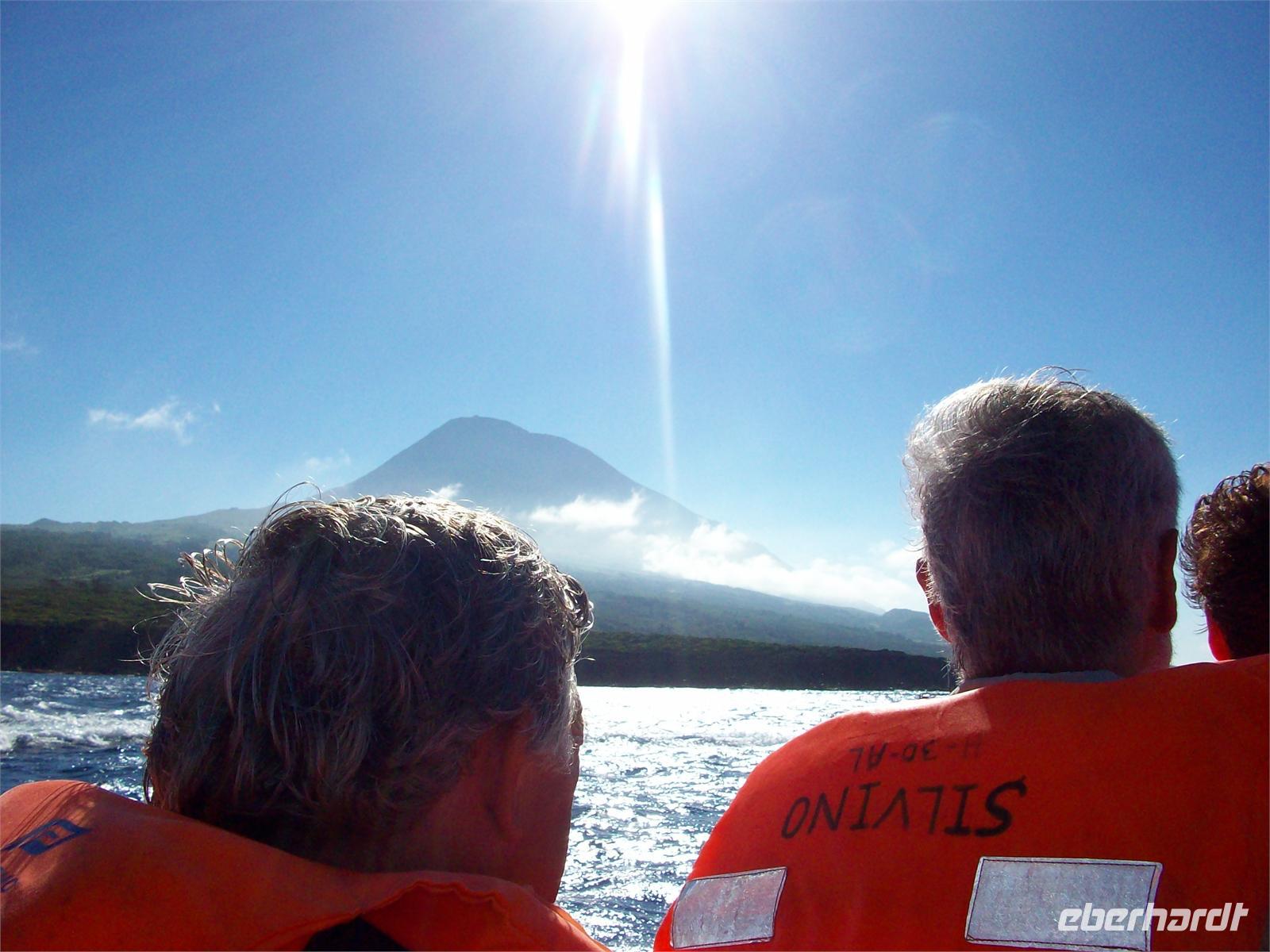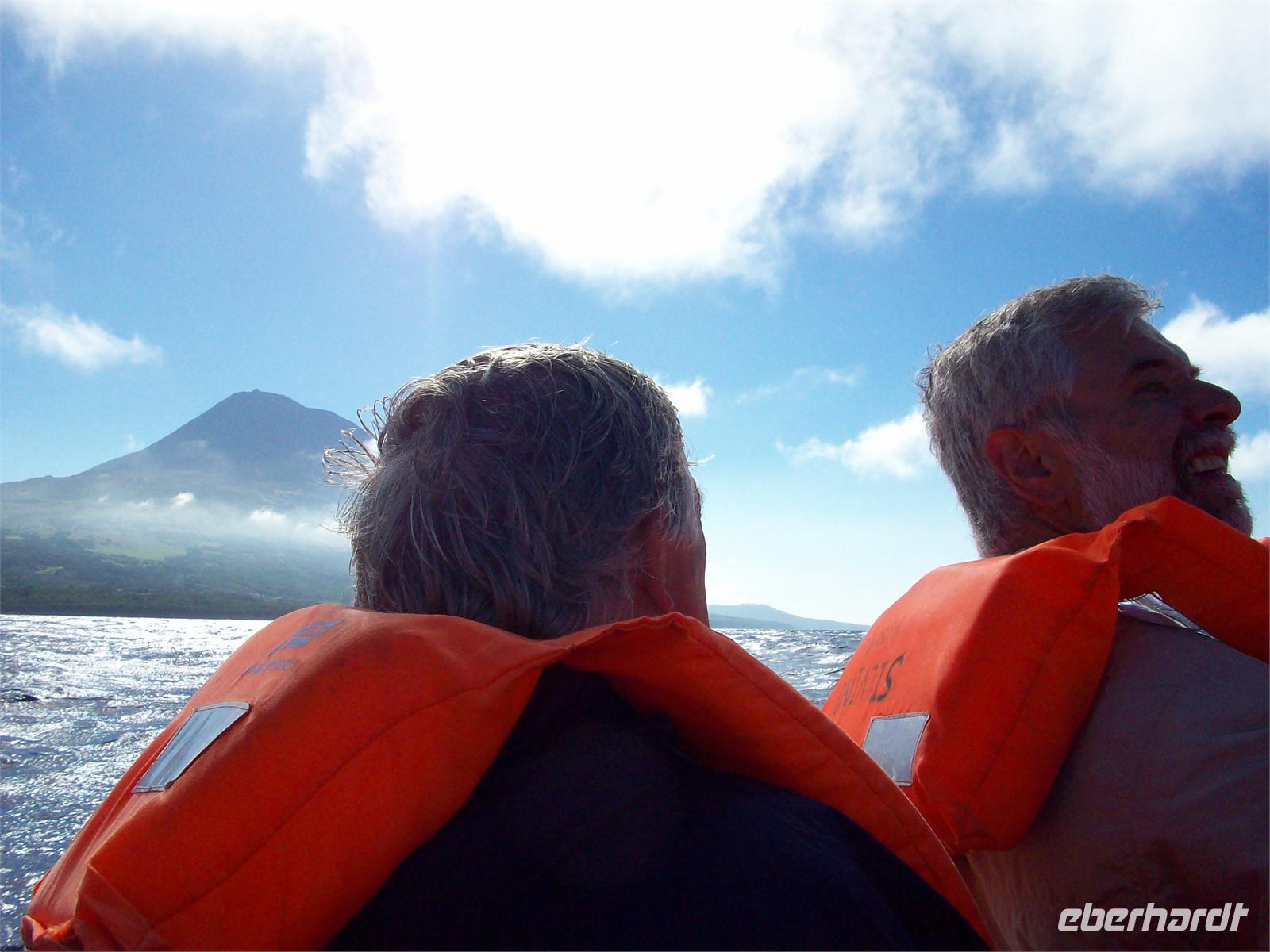 Skipper Informationen, wo sich welche Tiere aufhalten. So sehen wir neben dem Pottwal auch die sehr seltenen Schnabelwale, Weißkopf Delphine und sogar eine kleine Meeresschildkröte. Und das alles bei strahlend blauem Himmel und einem fantastischen Blick auf den Berg Pico. Nach dem die meisten Tiere nun irgendwo in die Tiefen des Meeres abgetaucht sind, treten wir unsere Rückfahrt an. Diese wird leicht stürmisch und abenteuerlich, denn wir fahren direkt ins schlechte Wetter hinein. Nach Vier Stunden haben wir wieder festen Boden unter den Füßen und sind teilweise ganz schön nass. Aber das