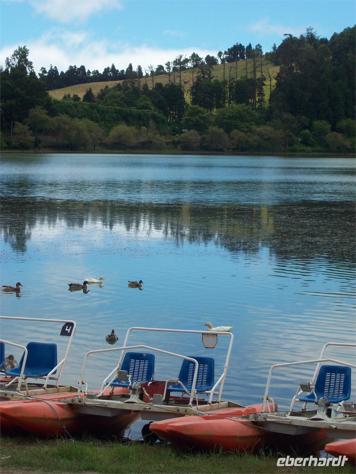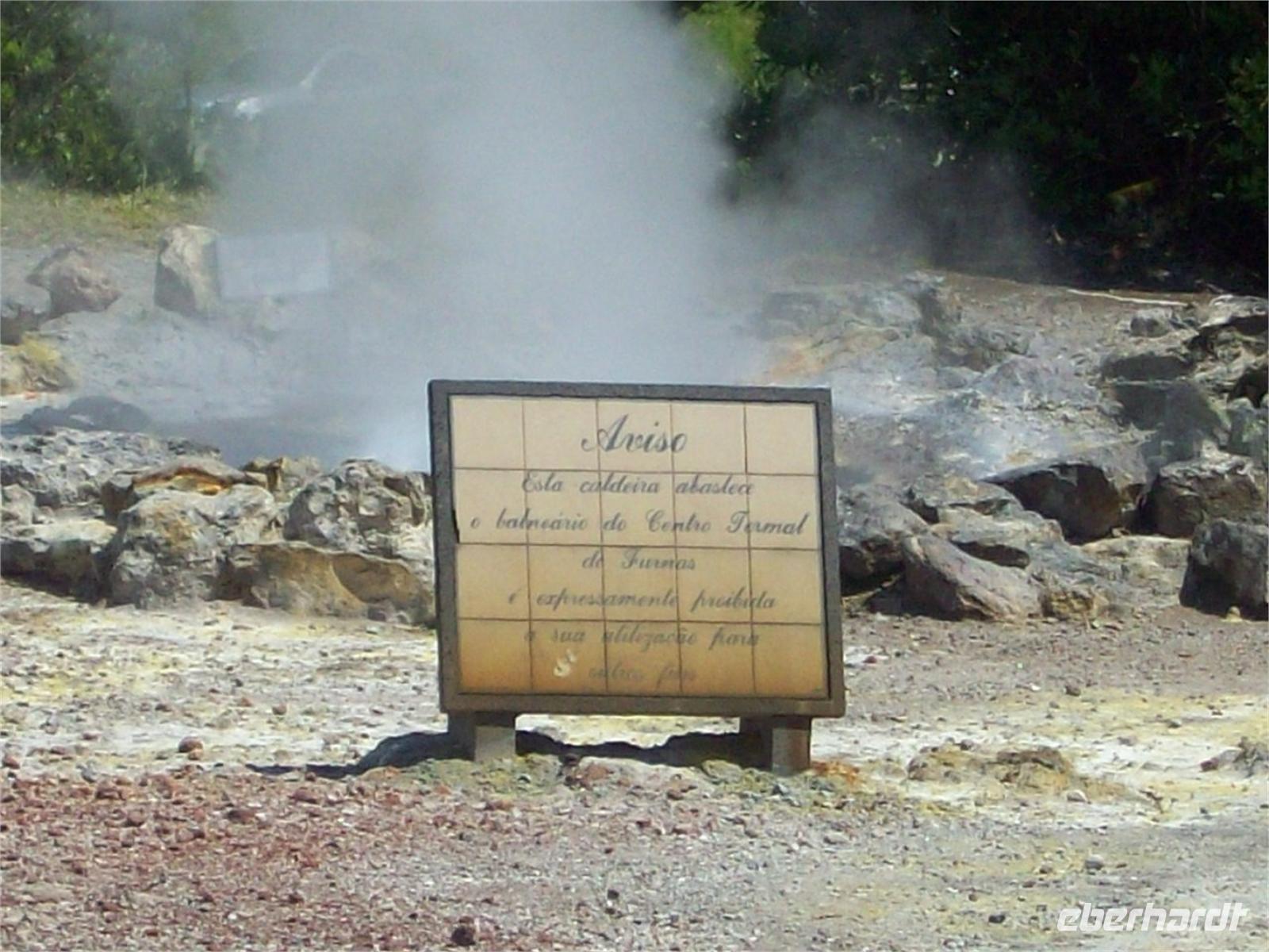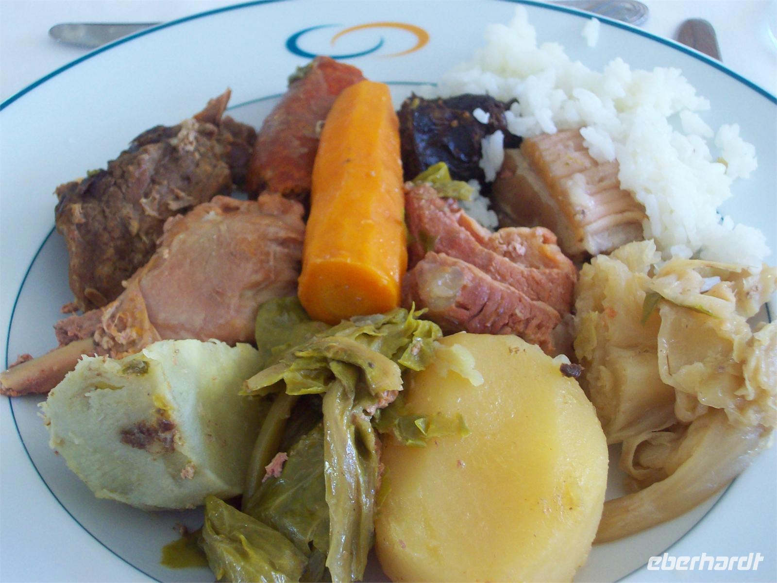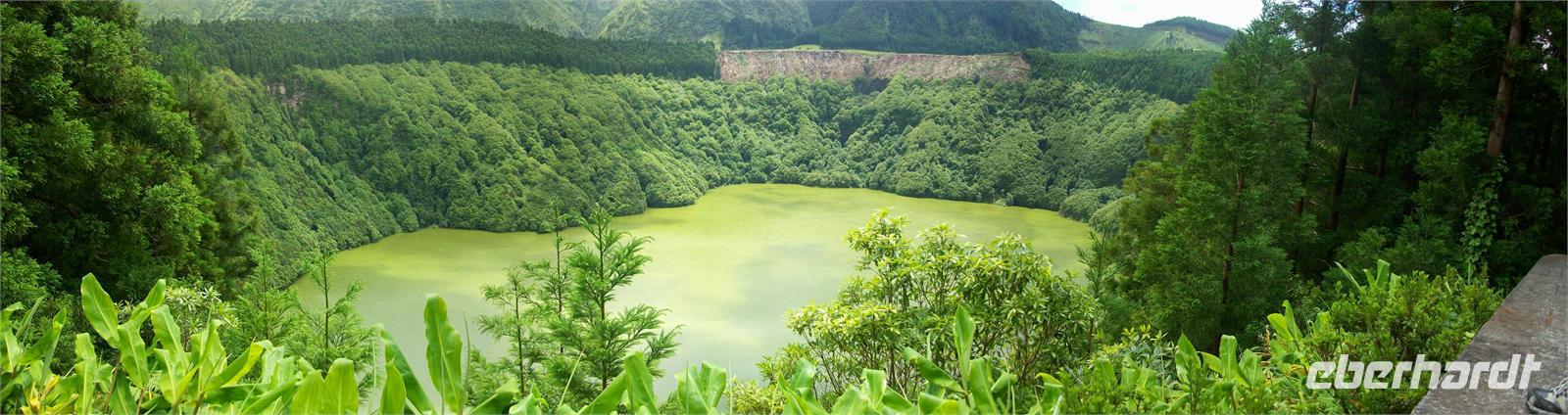 Gestärkt nach einem leckeren, gemütlichen Frühstück treten wir unsere erste Erkundungstour im Osten der Azoren Insel Sao Miguel an. Wir lernen die Schönheit der Natur, die Einmaligkeit der Architektur sowie Kultur kennen und natürlich auch die Zickigkeit des Wetters. ;) Mal sonnig, mal wolkig - warum kann es sich nur nicht entscheiden! Wussten Sie, dass das Azoren-Hoch gar nicht von den Azoren kommt? Nein, na dann. Also, das Azoren-Hoch entsteht irgendwo mitten im Atlantik, da es aber irgendeinen Namen brauchte und zufällig die Azoren in nächster Nähe waren, hat es seinen Namen bekommen. Tja, Zufälle gibt's! Aber wir hatten Glück und so hat uns nur zum Ende des Tages die Sonne verlassen. Ein wichtiger Programmpunkt des heutigen Tages war der Ort Villa Franca do Campo. Bei einem Stadtrundgang konnten wir die Kirche, den Hafen und die vorgelagerte Insel kennen lernen. Im Anschluss ging unsere Reise weiter nach Furnas. Hier hatten wir die Möglichkeit in einem 38°C warmen Schwimmbecken zu planschen. Aber Vorsicht: Schwitzgefahr! Gleich danach ging es zum Lagoa das Furnas. Hier bei den Caldeiras - Dampfquellen - haben wir zugesehen, wie unser Mittagessen aus der Erde gegraben wurde. Denn heute gab es eine Azoren-Spezialität: Cozido das Caldeiras, ein
