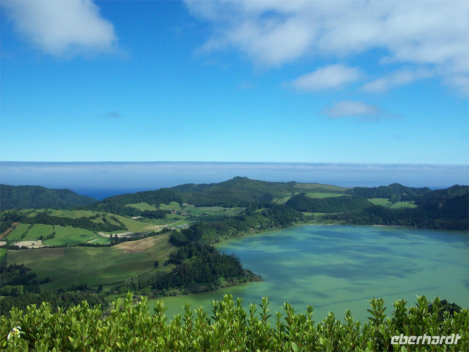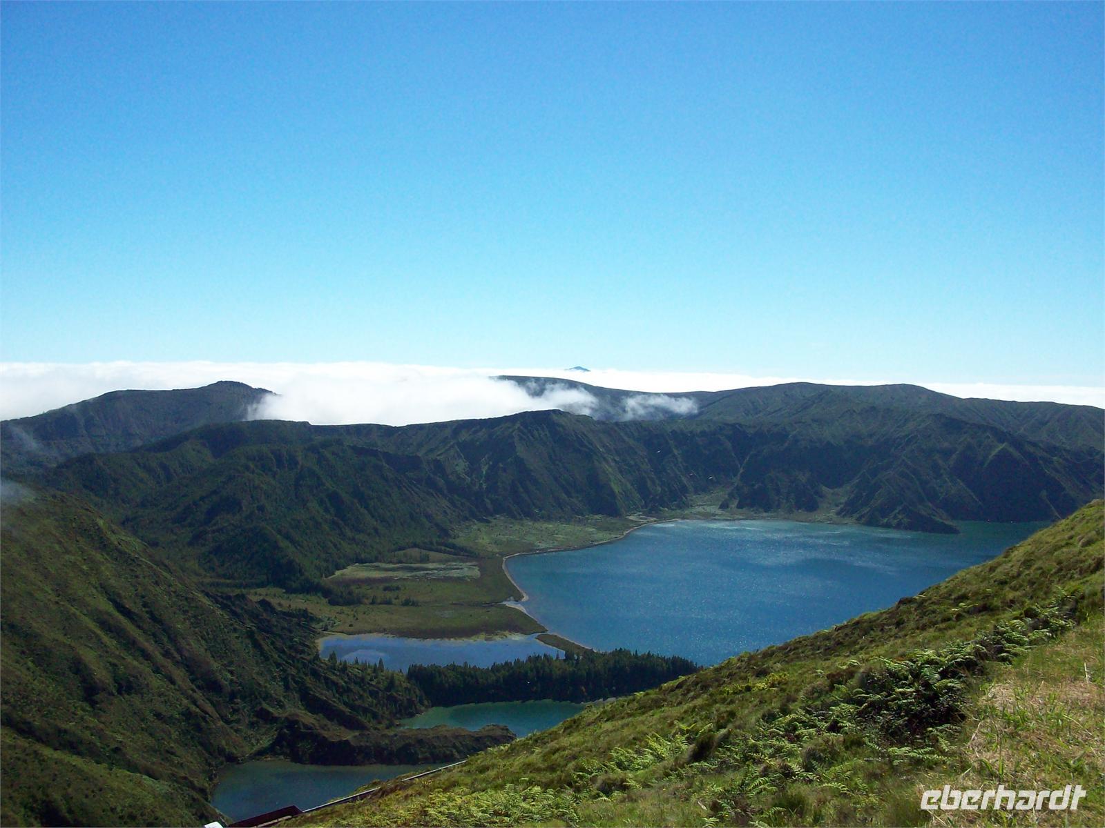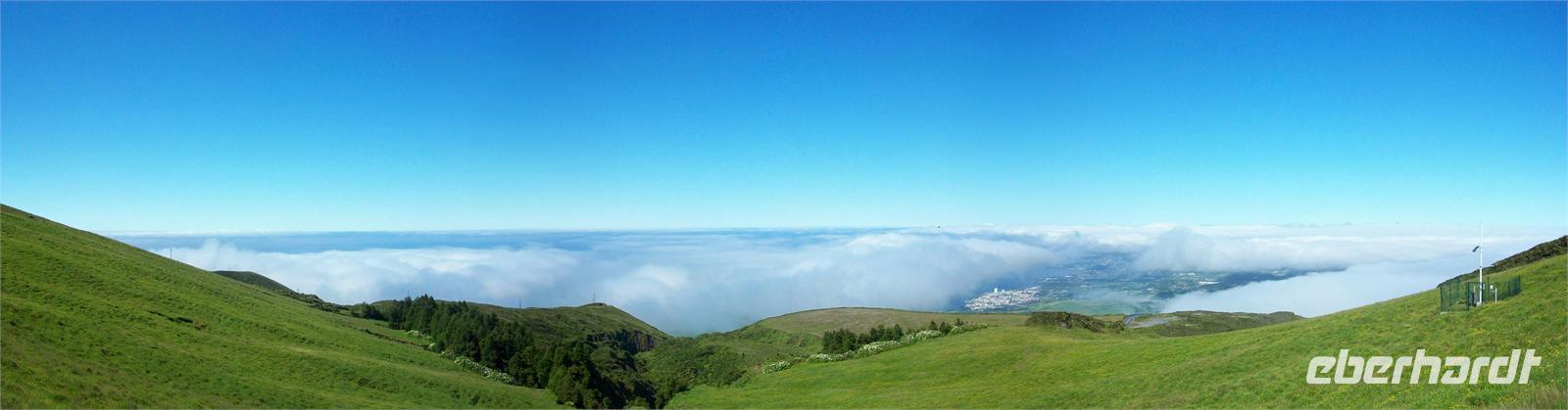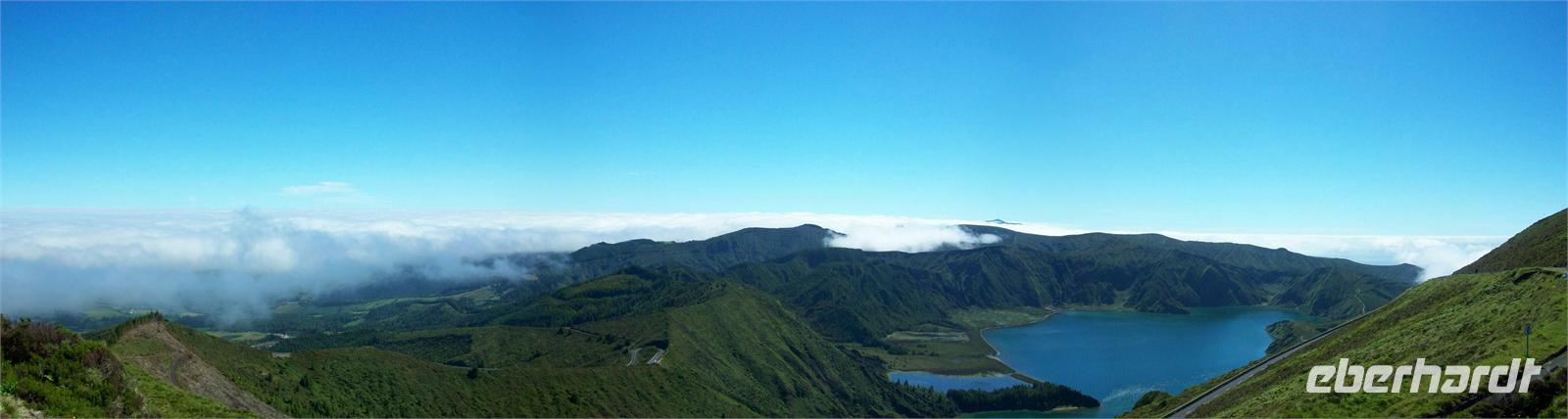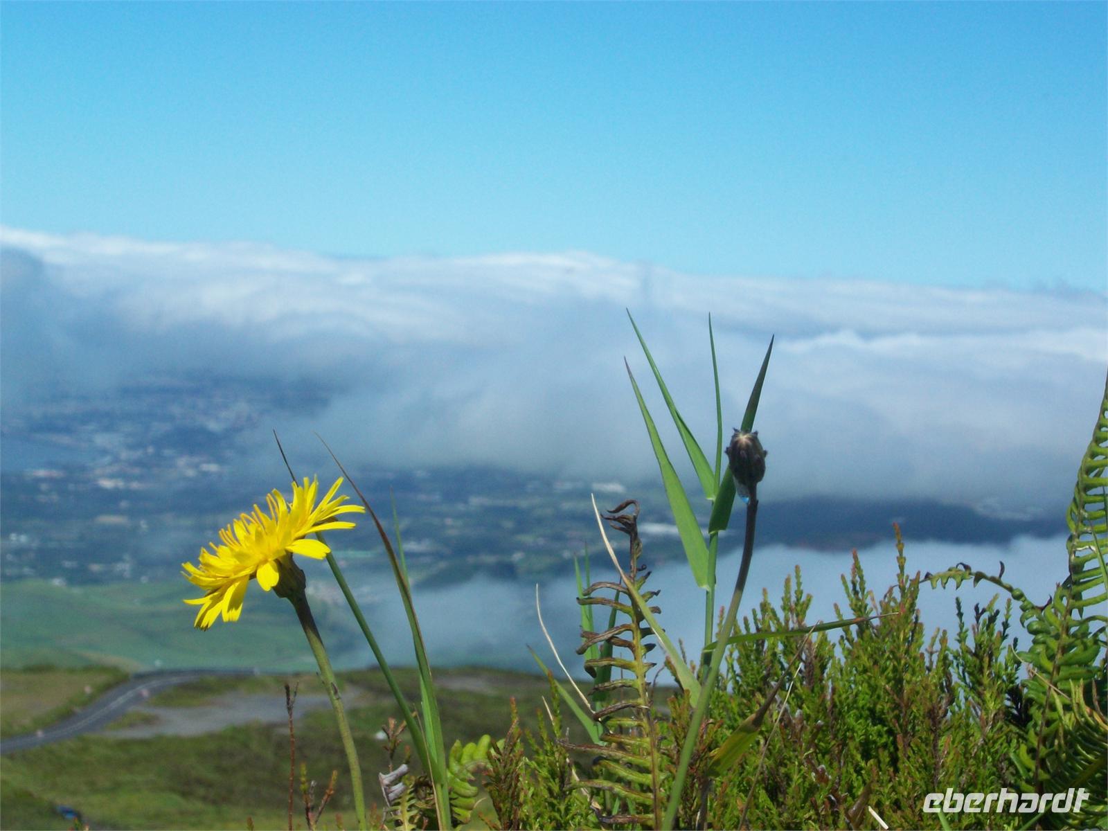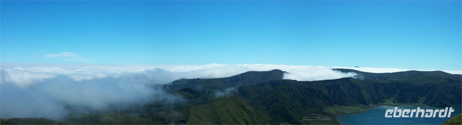 anderes, sehr bedeutendes Handwerk der Azoreaner kennen lernen. Hier zu Stand ein Besuch der Keramikfabrik "Ceramica Vieira" in Lagoa auf dem Plan. Birgit, unsere örtliche Reiseleiterin, brachte uns diese Handwerkskunst mit all ihren Arbeitsschritt ein wenig Näher. Im Anschluss daran ging es hinauf in die Berge oder besser gesagt mal wieder auf einen Kraterrand. Die Fahrt hinauf war schon absolut atemberaubend, denn nach jeder Kurve (es gab sehr viele) hatte man eine neue wunderschöne Aussicht und noch etwas ganz besonderes gab es heute: die Wolken waren unterhalb von uns. Wir hatten einen grandiosen Blick auf den Lagoa do Fogo und konnten sogar die Bergspitze des höchsten Berges von Sao Miguel bewundern, aber alles was weiter unten gelegen war, war nicht zu erkennen, da die Wolken uns die Sicht versperrten. Einfach umwerfend schön! Nach diesem Erlebnis sind wir weiter zur Caldera Velha