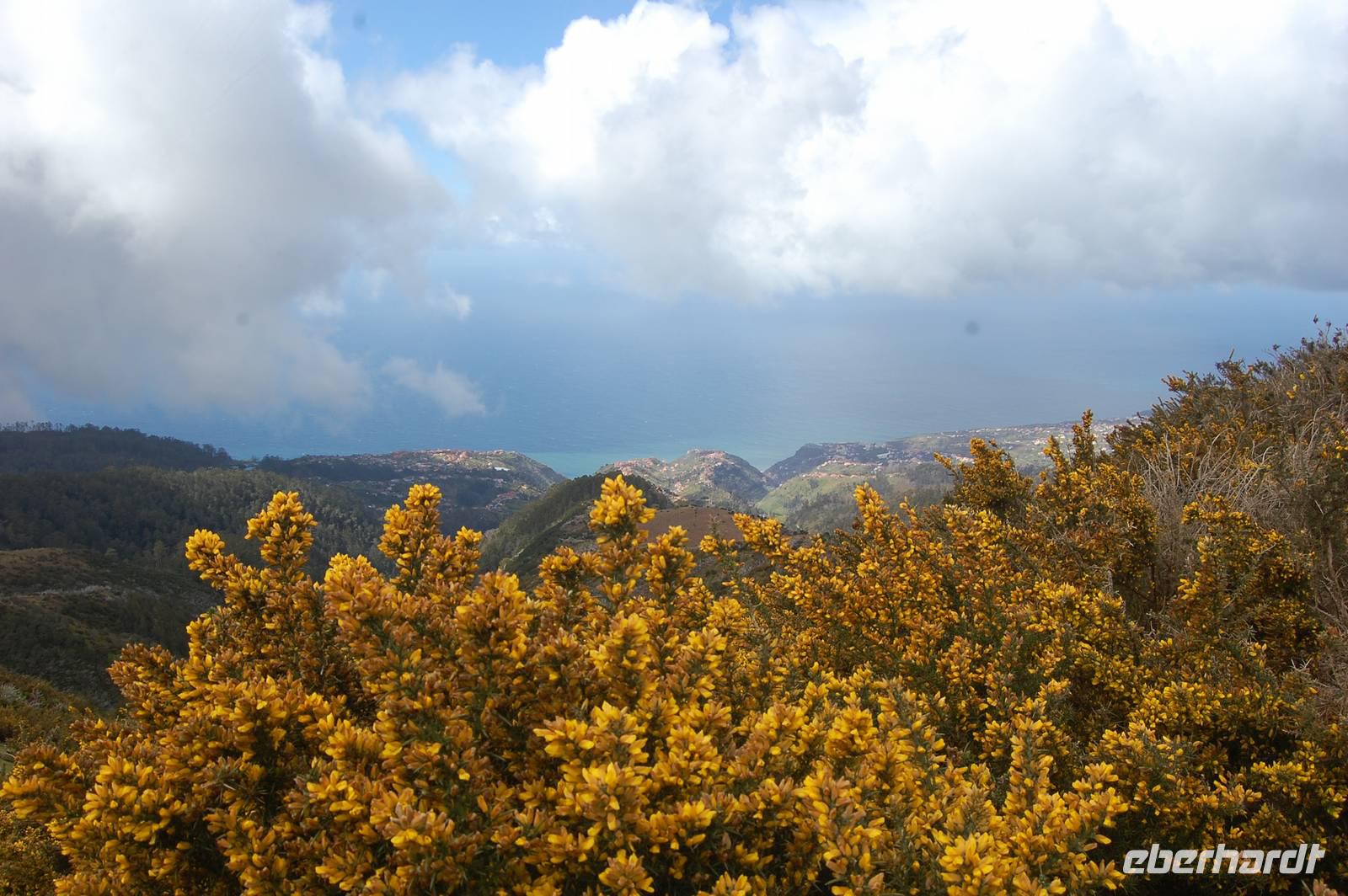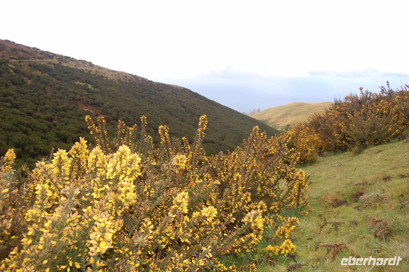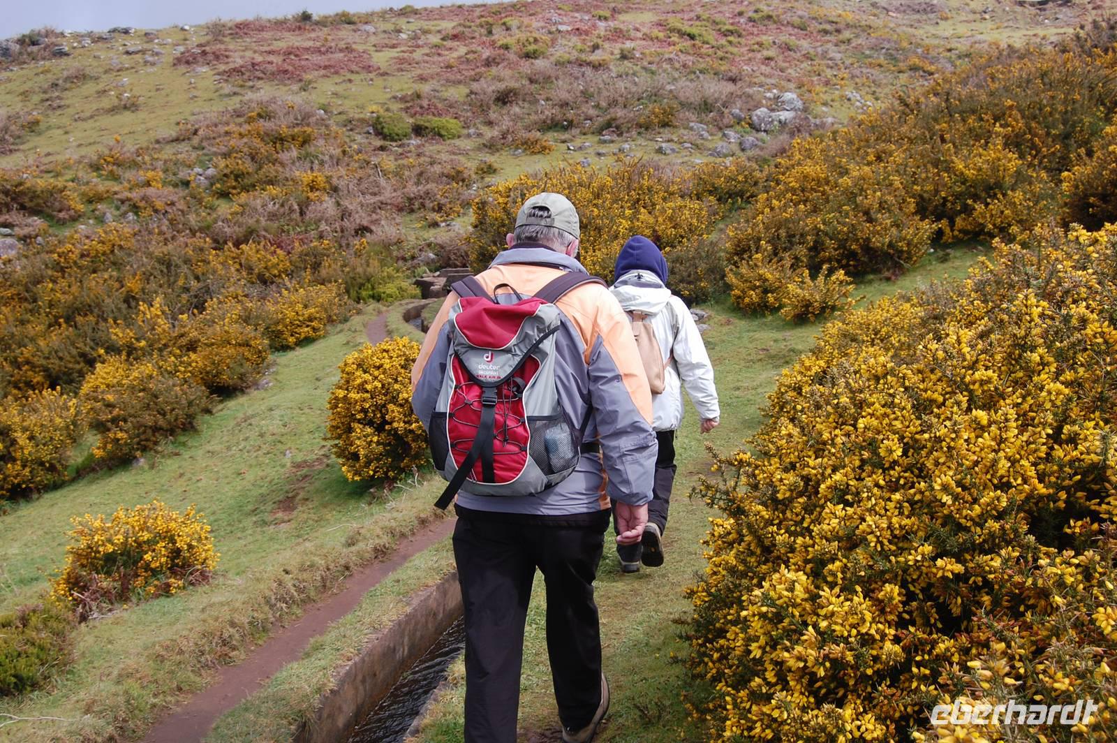 Pünktlich um 09.00 Uhr brechen wir zu unserer letzen Bustour auf. Diesmal bringt uns der Bus weiter nach Westen, wo wir ab Ribeira Brava den unzähligen Serpentinen folgen und erreichen schließlich die Hochebene „Paúl da Serra" (1.400 m). Hier beginnen wir um 10:30 Uhr unsere heutige Levada-Wanderung. Wir starten in einer Höhe von 1.323 m und laufen entlang der „Levada do Paúl" 6,3 km, bis wir schließlich nach 2 Stunden wieder in den Bus einsteigen. Dabei folgten wir dem Kanal in Fließrichtung des Wassers und hatten nur ein leichtes Gefälle von 50 m auf dieser Strecke zu verzeichnen. Dennoch war die Wanderung nicht ganz einfach, denn schmale, feuchte Wege mit einigen Hindernissen und steilen Abhängen boten einige Gefahren. Belohnt wurden wir mit wunderschönen Ausblicken über den gelb blühenden Stechginster, hinab zur Küste und zur Ortschaft „Calletta".