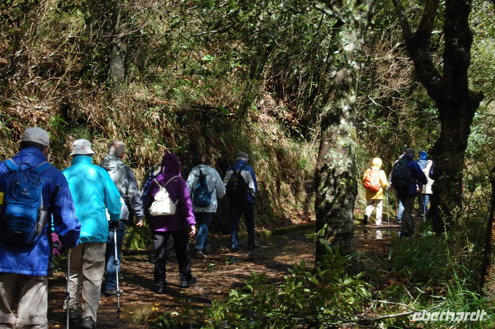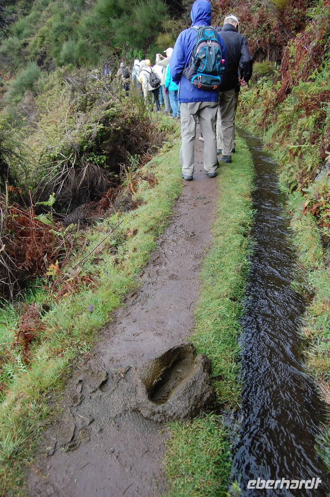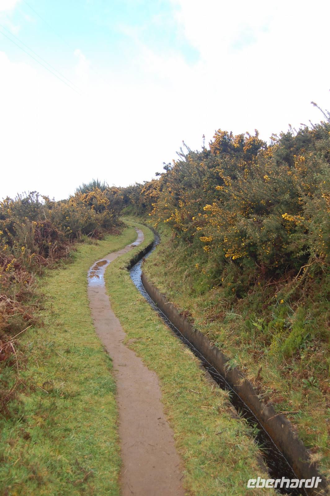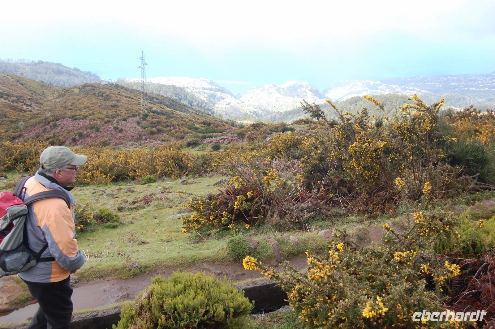 Pünktlich um 09.00 Uhr brechen wir zu unserer letzen Bustour auf. Diesmal bringt uns der Bus weiter nach Westen, wo wir ab Ribeira Brava den unzähligen Serpentinen folgen und erreichen schließlich die Hochebene „Paúl da Serra" (1.400 m). Hier beginnen wir um 10:30 Uhr unsere heutige Levada-Wanderung. Wir starten in einer Höhe von 1.323 m und laufen entlang der „Levada do Paúl" 6,3 km, bis wir schließlich nach 2 Stunden wieder in den Bus einsteigen. Dabei folgten wir dem Kanal in Fließrichtung des Wassers und hatten nur ein leichtes Gefälle von 50 m auf dieser Strecke zu verzeichnen. Dennoch war die Wanderung nicht ganz einfach, denn schmale, feuchte Wege mit einigen Hindernissen und steilen Abhängen boten einige Gefahren. Belohnt wurden wir mit wunderschönen Ausblicken über den gelb blühenden Stechginster, hinab zur Küste und zur Ortschaft „Calletta".