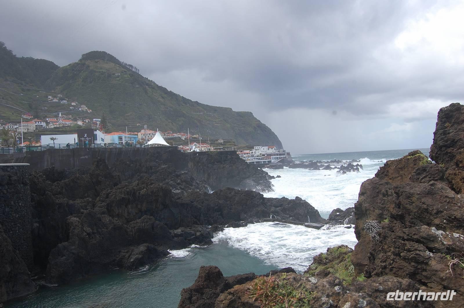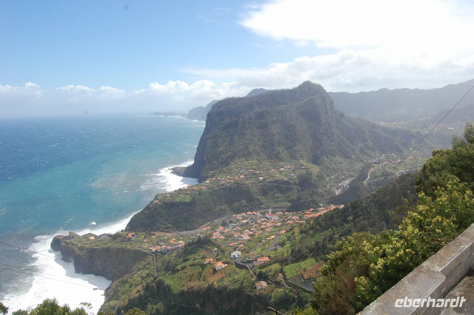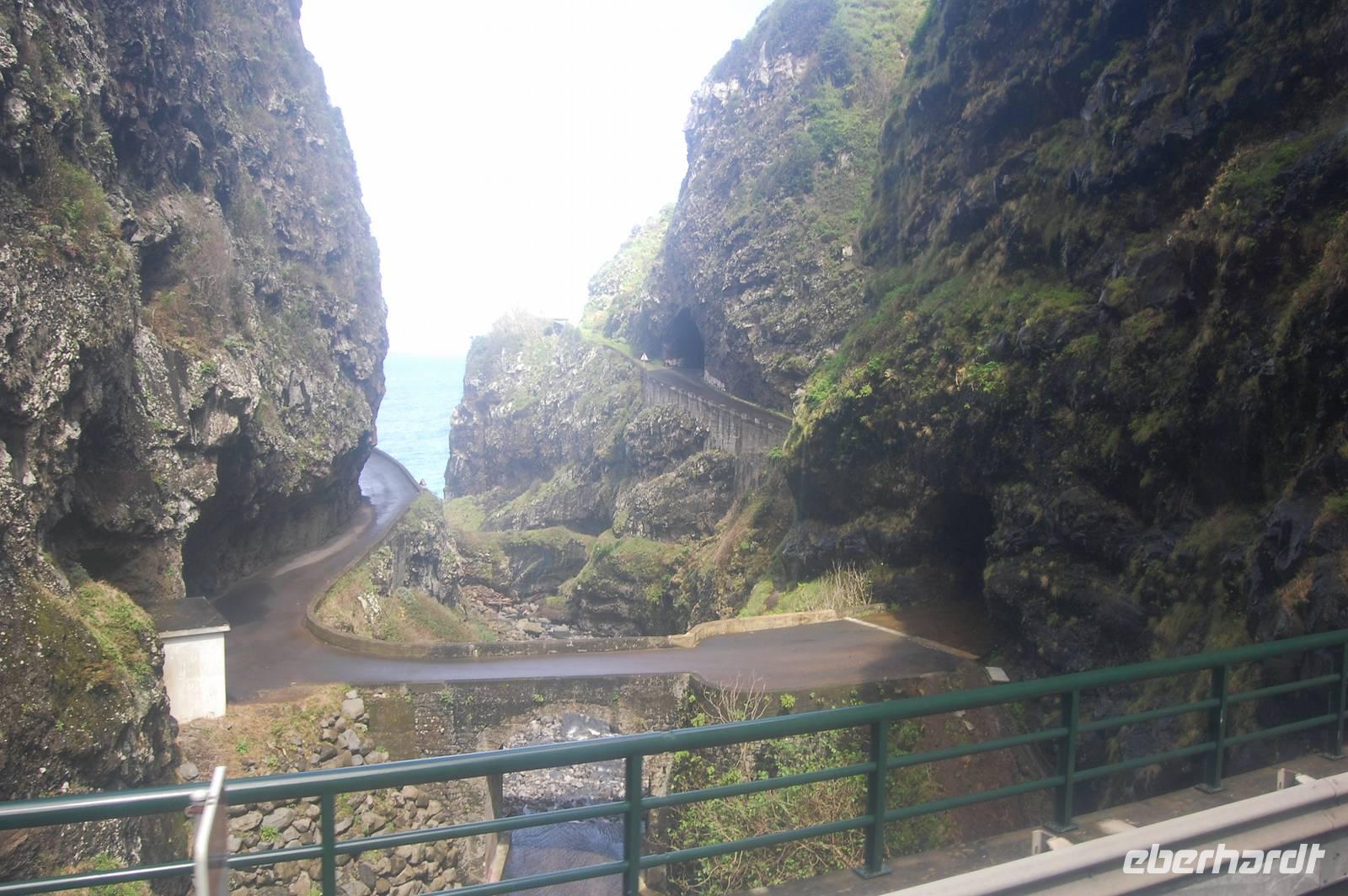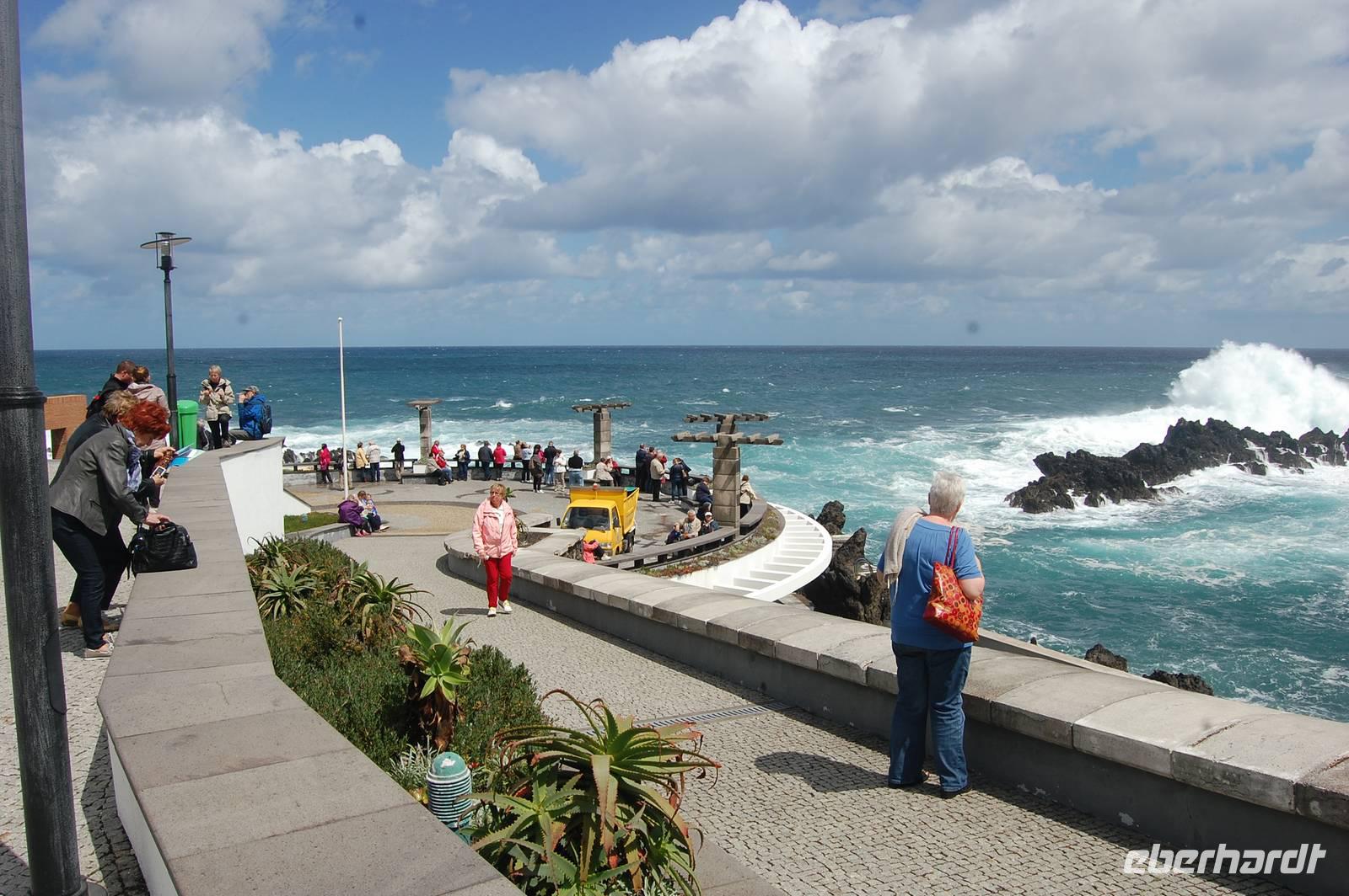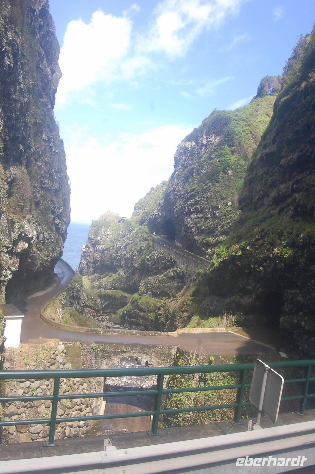 12:30 Uhr fahren wir weiter in Richtung Norden und halten an einem Aussichtspunkt zum Fotostopp. Unter uns befindet sich der verträumte Badeort „Porto Moniz", dessen Naturbasseins aus Lava-Gestein gut zu sehen sind. Unten angekommen empfängt uns eine steife Briese, die den Atlantik in hoher Gischt gegen die Felsen peitscht. Nach einem individuellen Bummel über die Promenade starten wir 14:30 Uhr zur Weiterfahrt entlang der Nordküste, die dort steil ins Meer abfällt. Die alte Uferstraße wurde wegen Felsstützen gesperrt und Stück für Stück durch Tunnel ersetzt. Ein imposanter Blick zurück in vergangene Zeiten des Straßenbaus. Immer wieder fallen Wasserläufe in die Tiefe. An einem besonders schönen Wasserfall, dem „Brautschleierwasserfall" machen wir wieder einen kurzen Fotostopp und verlassen dann die Nordküste im Ort „Sao Vicente", wo wir uns kurz die barocke Kirche und einige Gassen anschauen. Anschließend reisen wir zum vorerst letzten Punkt unserer Madeira-Exkursion. Wieder quält sich der Bus über unzählige Serpentinen vom Meer hinauf zum Encumeda-Pass in 1007 m Höhe. Von hier aus kann man sowohl die hinter uns liegende Nordküste, als auch die vor uns liegende Südküste sehen. Bei einem Becher portugiesischen Sekt stoßen wir auf diesen gelungenen Urlaub und die Gesundheit an. Anschließend bringt uns Vitor bergab zurück nach Funchal und schließlich zum Hotel, wo wir gegen 17.00 Uhr eintreffen.