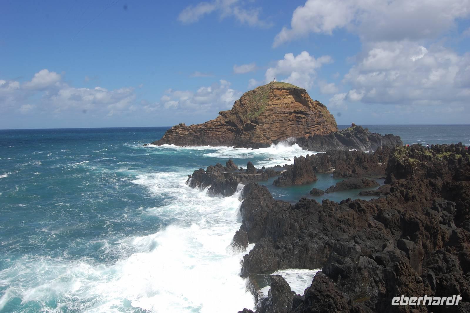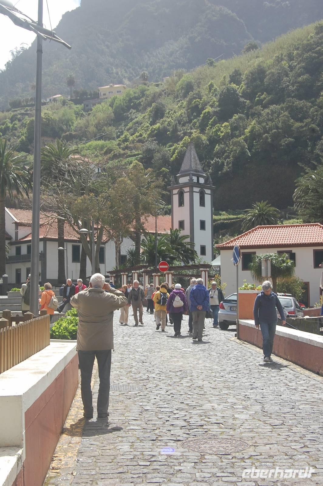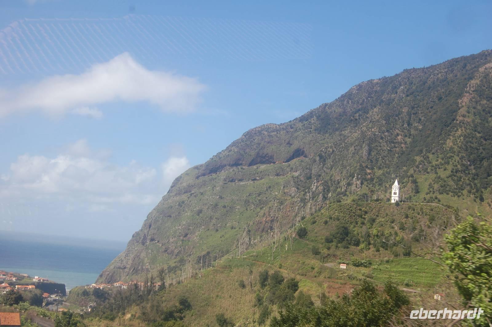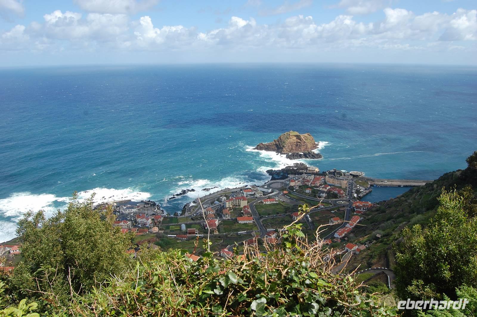 12:30 Uhr fahren wir weiter in Richtung Norden und halten an einem Aussichtspunkt zum Fotostopp. Unter uns befindet sich der verträumte Badeort „Porto Moniz", dessen Naturbasseins aus Lava-Gestein gut zu sehen sind. Unten angekommen empfängt uns eine steife Briese, die den Atlantik in hoher Gischt gegen die Felsen peitscht. Nach einem individuellen Bummel über die Promenade starten wir 14:30 Uhr zur Weiterfahrt entlang der Nordküste, die dort steil ins Meer abfällt. Die alte Uferstraße wurde wegen Felsstützen gesperrt und Stück für Stück durch Tunnel ersetzt. Ein imposanter Blick zurück in vergangene Zeiten des Straßenbaus. Immer wieder fallen Wasserläufe in die Tiefe. An einem besonders schönen Wasserfall, dem „Brautschleierwasserfall" machen wir wieder einen kurzen Fotostopp und verlassen dann die Nordküste im Ort „Sao Vicente", wo wir uns kurz die barocke Kirche und einige Gassen anschauen. Anschließend reisen wir zum vorerst letzten Punkt unserer Madeira-Exkursion. Wieder quält sich der Bus über unzählige Serpentinen vom Meer hinauf zum Encumeda-Pass in 1007 m Höhe. Von hier aus kann man sowohl die hinter uns liegende Nordküste, als auch die vor uns liegende Südküste sehen. Bei einem Becher portugiesischen Sekt stoßen wir auf diesen gelungenen Urlaub und die Gesundheit an. Anschließend bringt uns Vitor bergab zurück nach Funchal und schließlich zum Hotel, wo wir gegen 17.00 Uhr eintreffen.