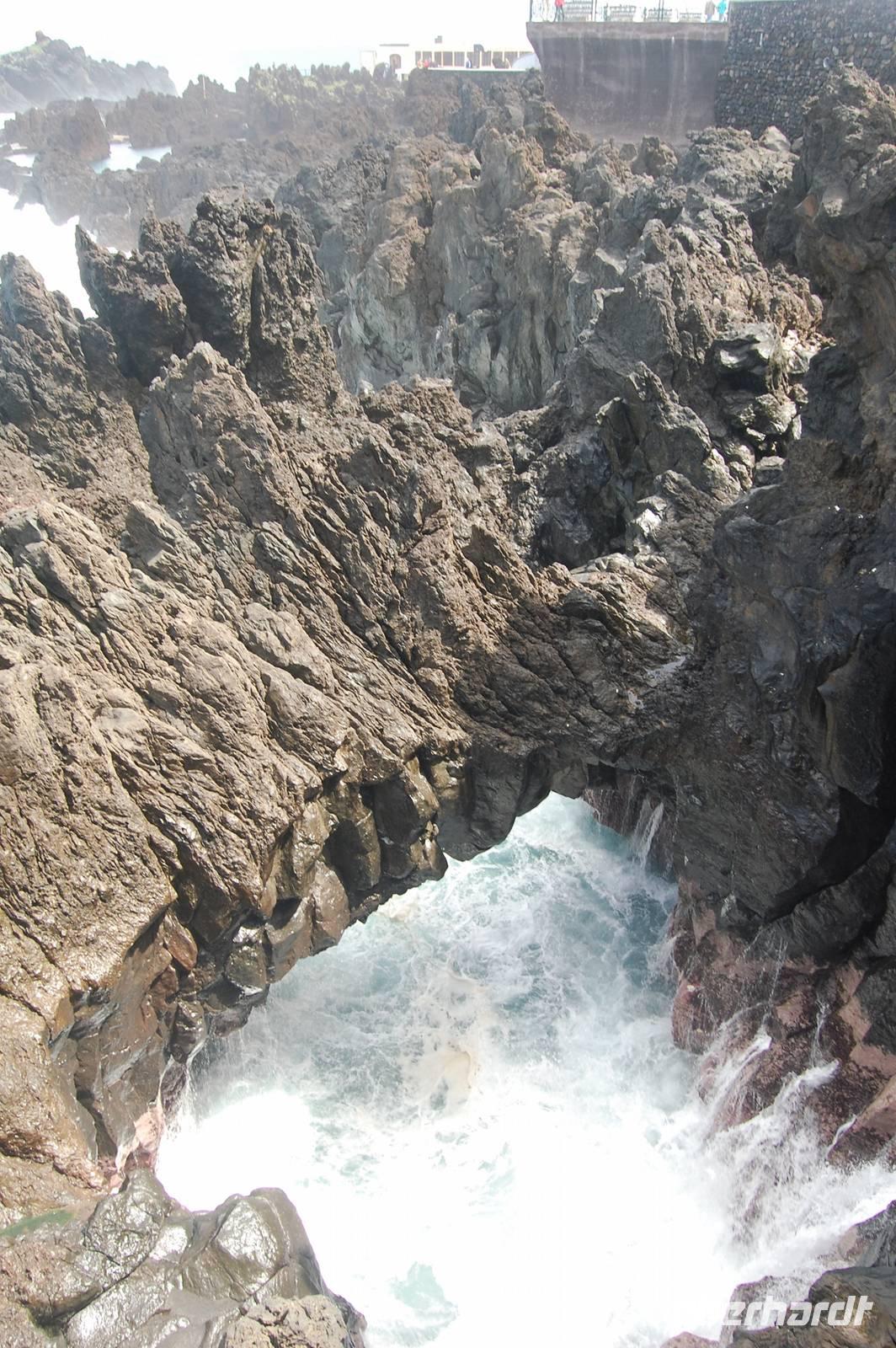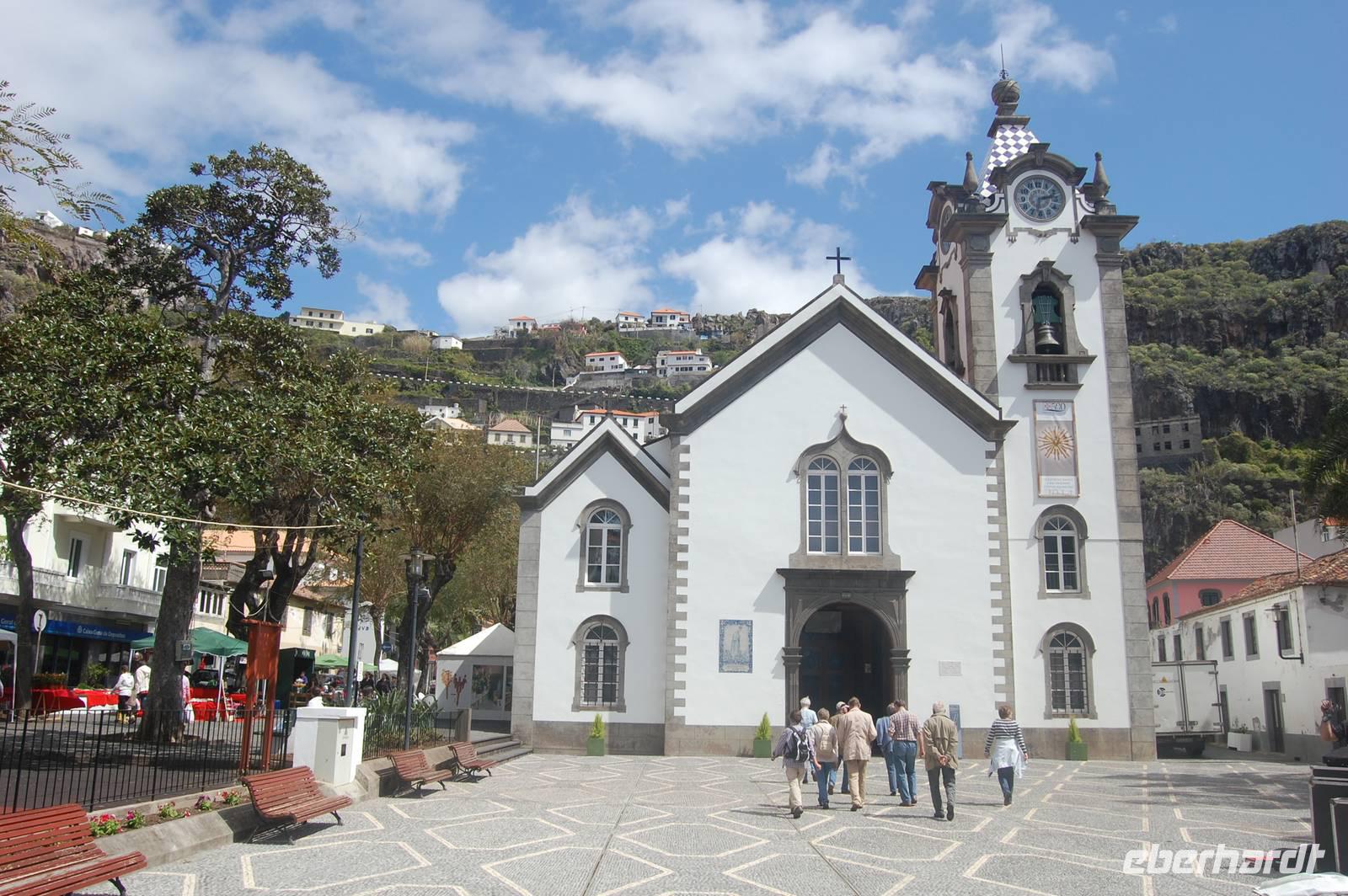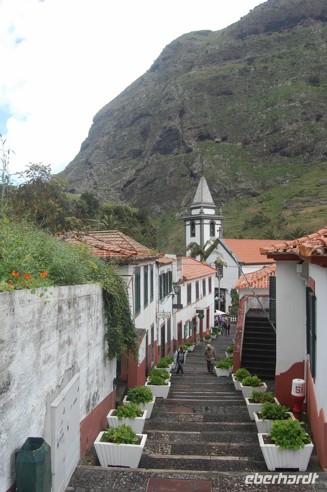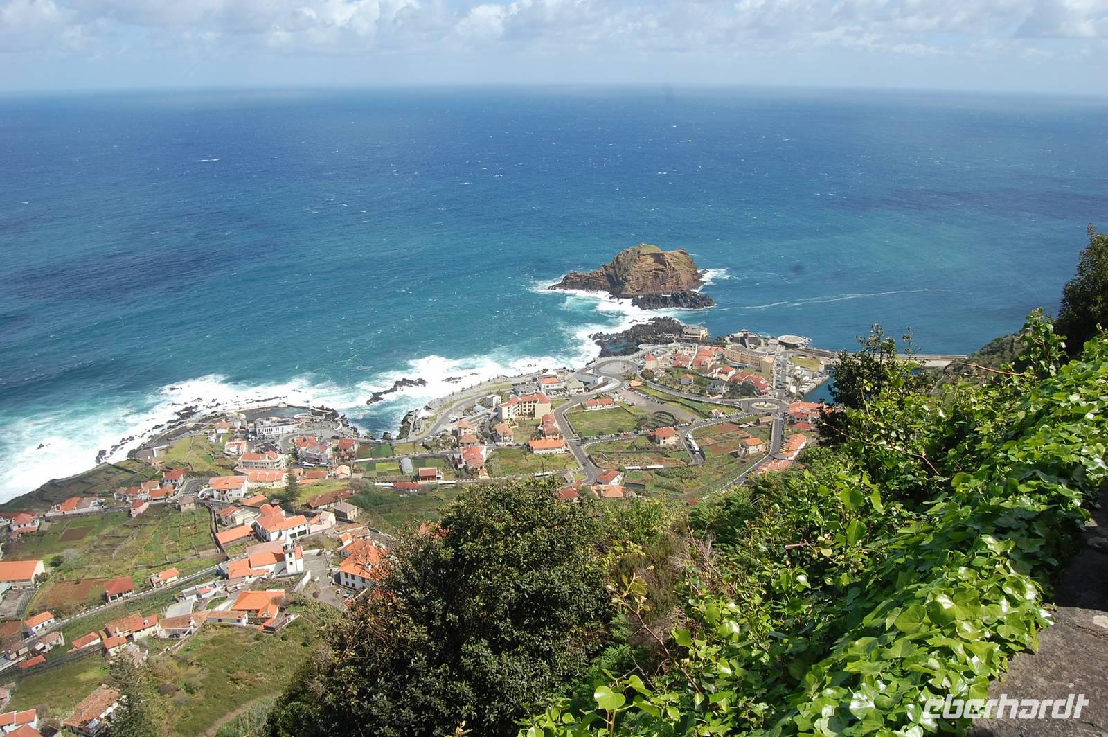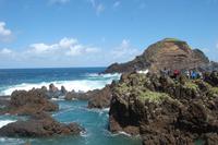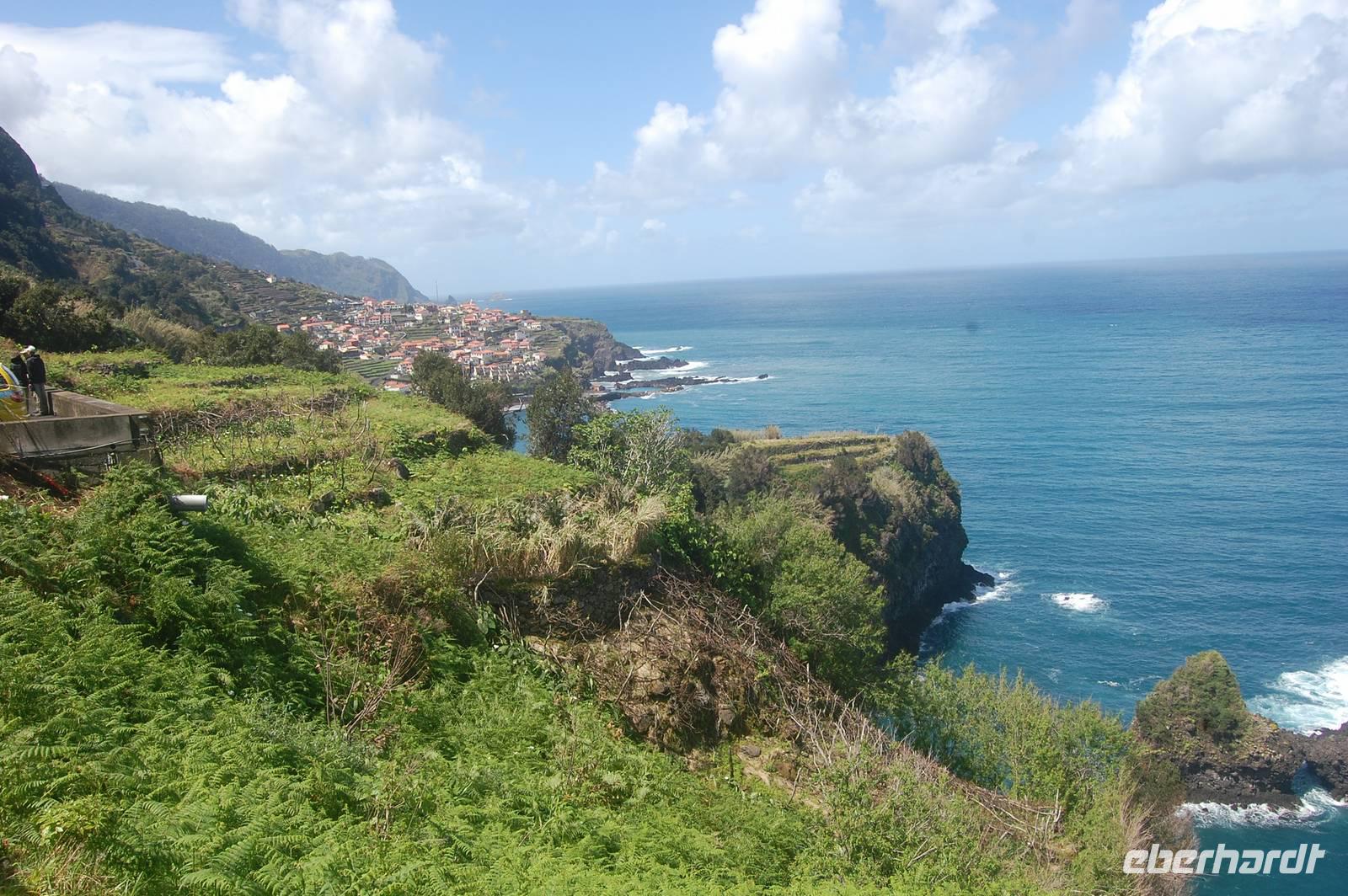 12:30 Uhr fahren wir weiter in Richtung Norden und halten an einem Aussichtspunkt zum Fotostopp. Unter uns befindet sich der verträumte Badeort „Porto Moniz", dessen Naturbasseins aus Lava-Gestein gut zu sehen sind. Unten angekommen empfängt uns eine steife Briese, die den Atlantik in hoher Gischt gegen die Felsen peitscht. Nach einem individuellen Bummel über die Promenade starten wir 14:30 Uhr zur Weiterfahrt entlang der Nordküste, die dort steil ins Meer abfällt. Die alte Uferstraße wurde wegen Felsstützen gesperrt und Stück für Stück durch Tunnel ersetzt. Ein imposanter Blick zurück in vergangene Zeiten des Straßenbaus. Immer wieder fallen Wasserläufe in die Tiefe. An einem besonders schönen Wasserfall, dem „Brautschleierwasserfall" machen wir wieder einen kurzen Fotostopp und verlassen dann die Nordküste im Ort „Sao Vicente", wo wir uns kurz die barocke Kirche und einige Gassen anschauen. Anschließend reisen wir zum vorerst letzten Punkt unserer Madeira-Exkursion. Wieder quält sich der Bus über unzählige Serpentinen vom Meer hinauf zum Encumeda-Pass in 1007 m Höhe. Von hier aus kann man sowohl die hinter uns liegende Nordküste, als auch die vor uns liegende Südküste sehen. Bei einem Becher portugiesischen Sekt stoßen wir auf diesen gelungenen Urlaub und die Gesundheit an. Anschließend bringt uns Vitor bergab zurück nach Funchal und schließlich zum Hotel, wo wir gegen 17.00 Uhr eintreffen.