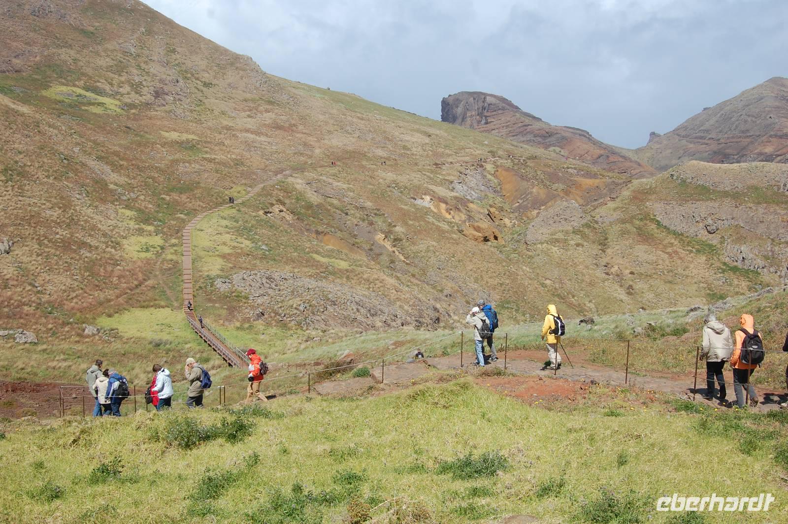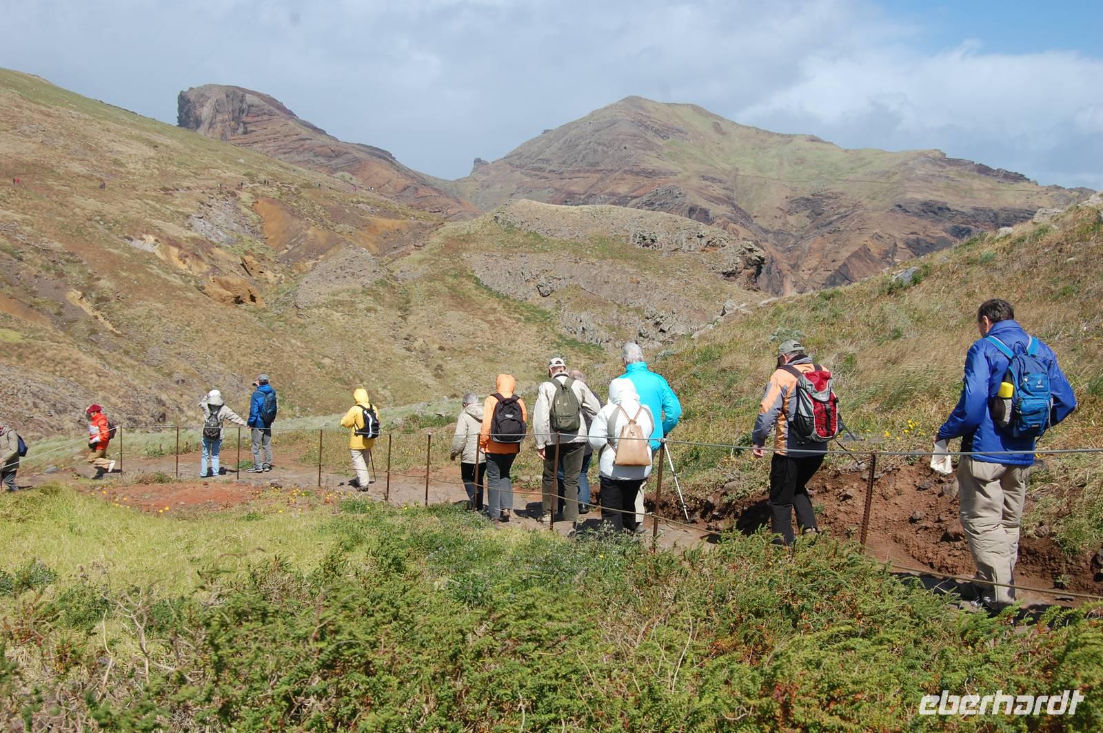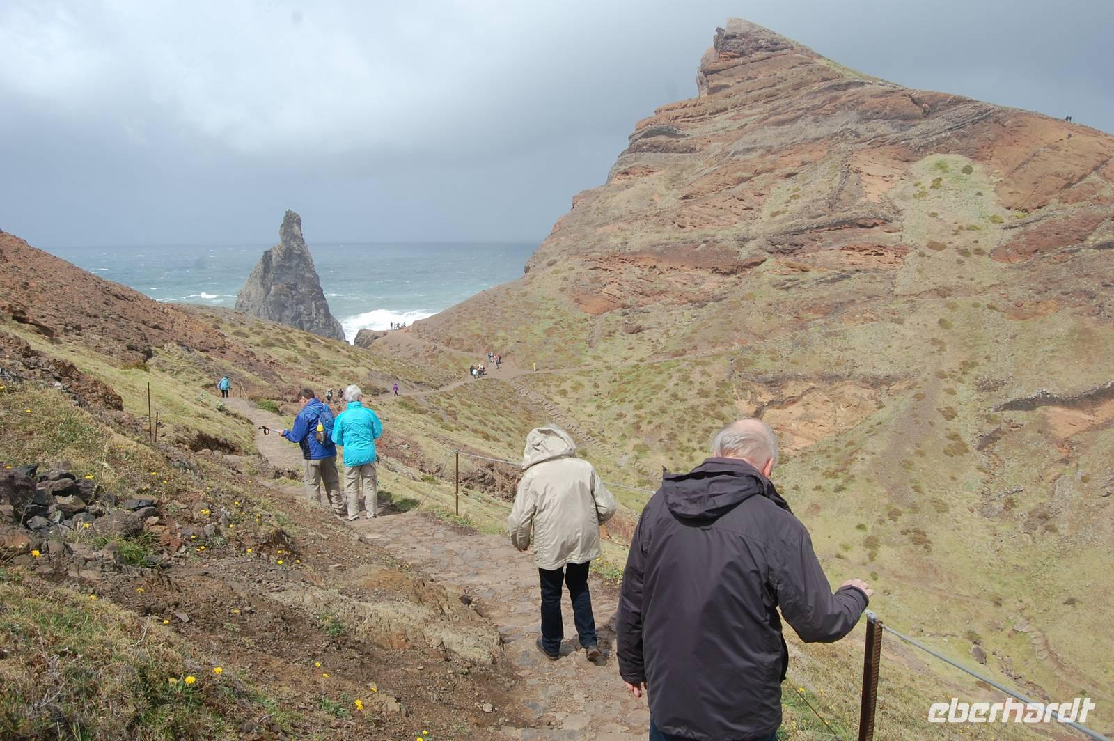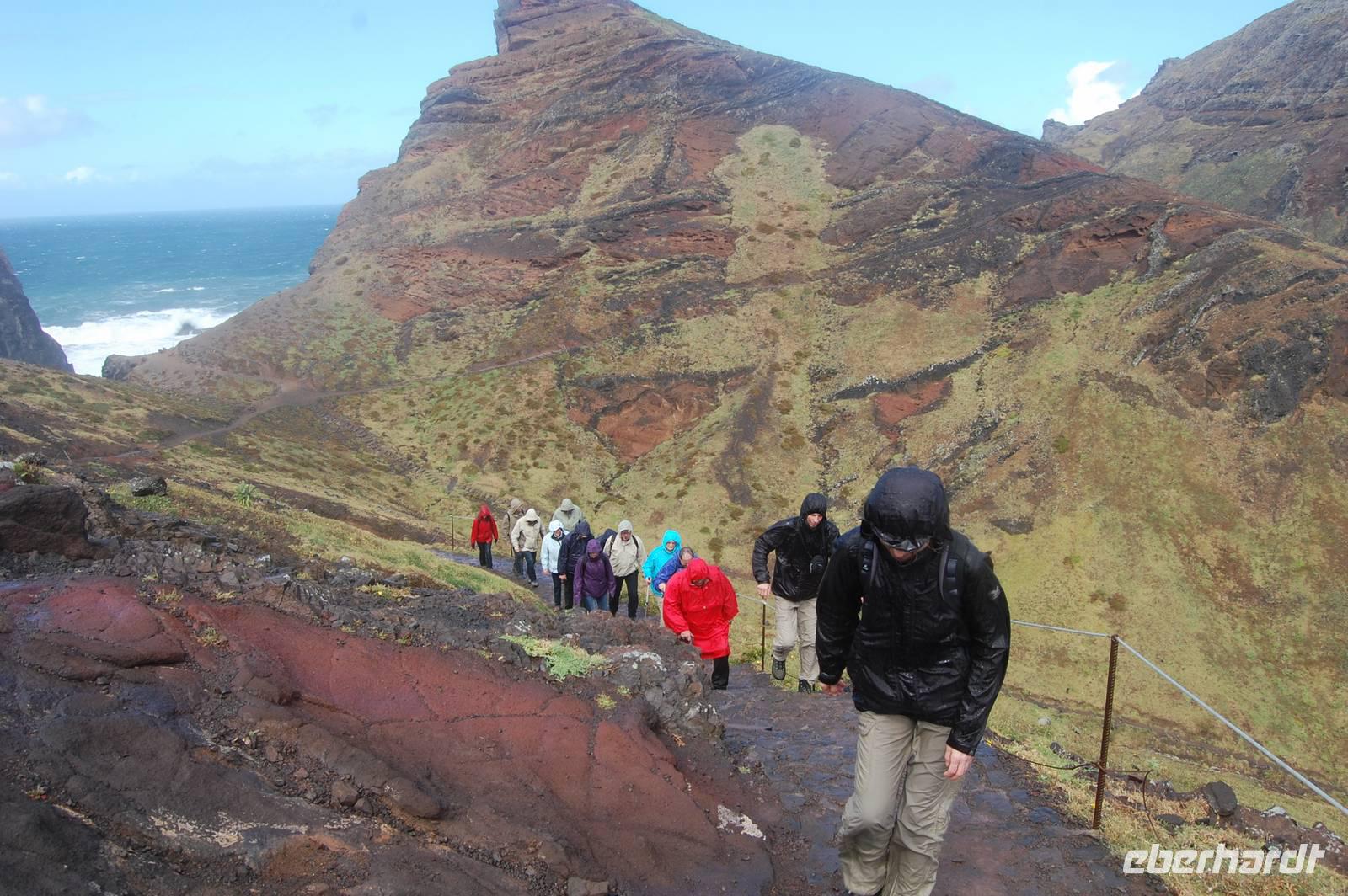 Schließlich um 11.00 Uhr starten wir von da zu unserer Levada-Wanderung. Unterwegs stoppen wir an einem Aussichtspunkt und erblicken wieder einen bunten Regenbogen, der sich über den kalten Fluss spannt. Nach insgesamt einer Stunde entlang des ebenen Wasserlaufes, gehen wir bergab zur Straße und steigen wieder in unseren Bus. Wir fahren weiter nach Santana, wo wir die für den Ort typischen, strohgedeckten Häuser anschauen. Nach einer kleinen individuellen Mittagspause im Ort starten wir 13.45 Uhr. Leider ist wegen des nächtlichen Schneefalls die Passstraße zum Pico do Ruivo gesperrt. Fatima schlägt eine alternative Wanderung zur östlichsten Spitze der Insel, „Ponta de Sao Lourenco", vor. Wir gehen bei prächtigem Sonnenschein los und durchqueren ein kleines Tal. Wenig später blicken wir auf die tosende See und können gleichzeitig die Nord- und Süd-Küste sehen. Ein mächtiger Nordwind treibt dicke Regenwolken heran, die sich plötzlich in einem waagerechten Regenguss entleeren. Wir sind binnen Minuten nass und haben Mühe, bei dem Sturm stehen zu bleiben. So entschließen wir uns zur Umkehr.